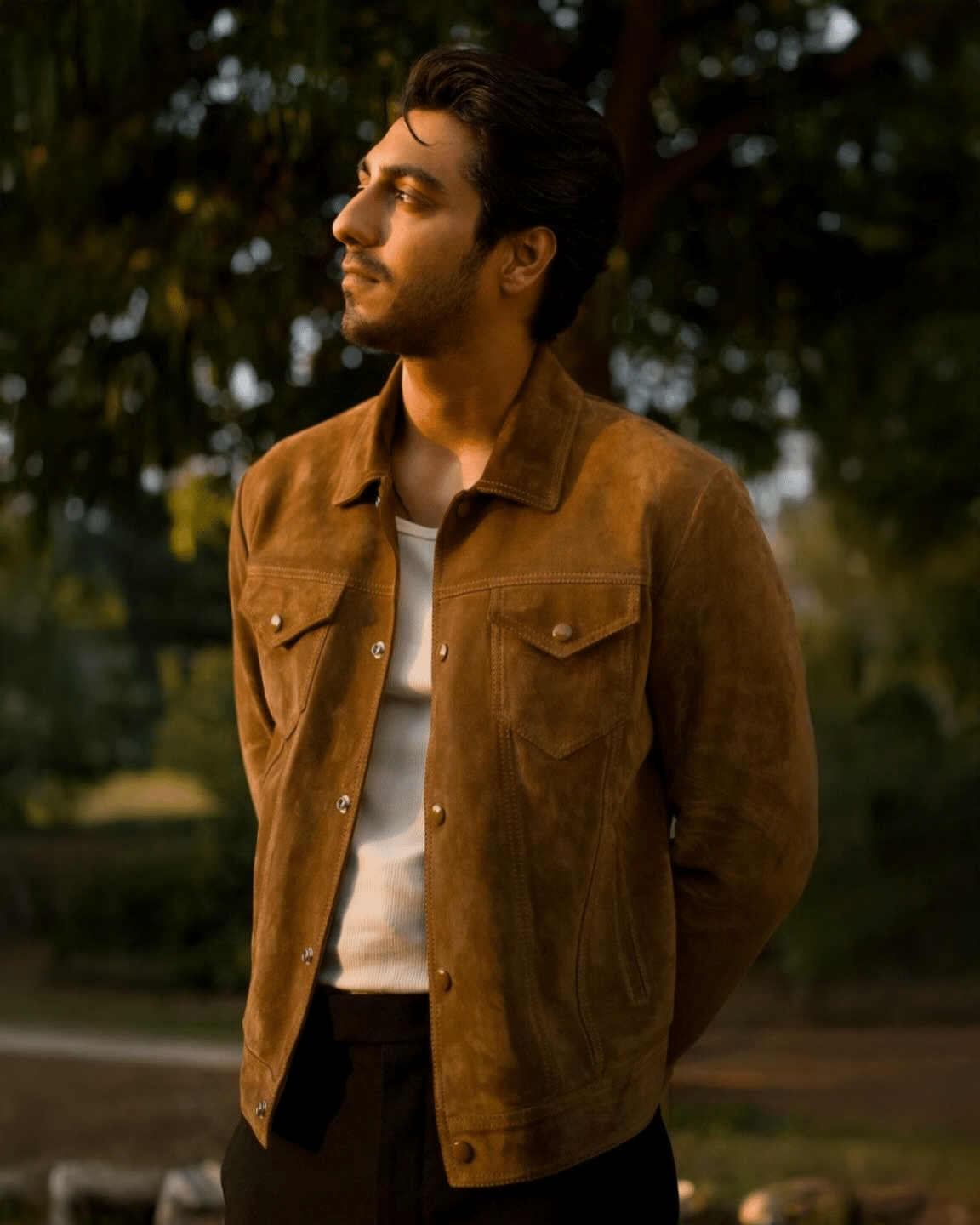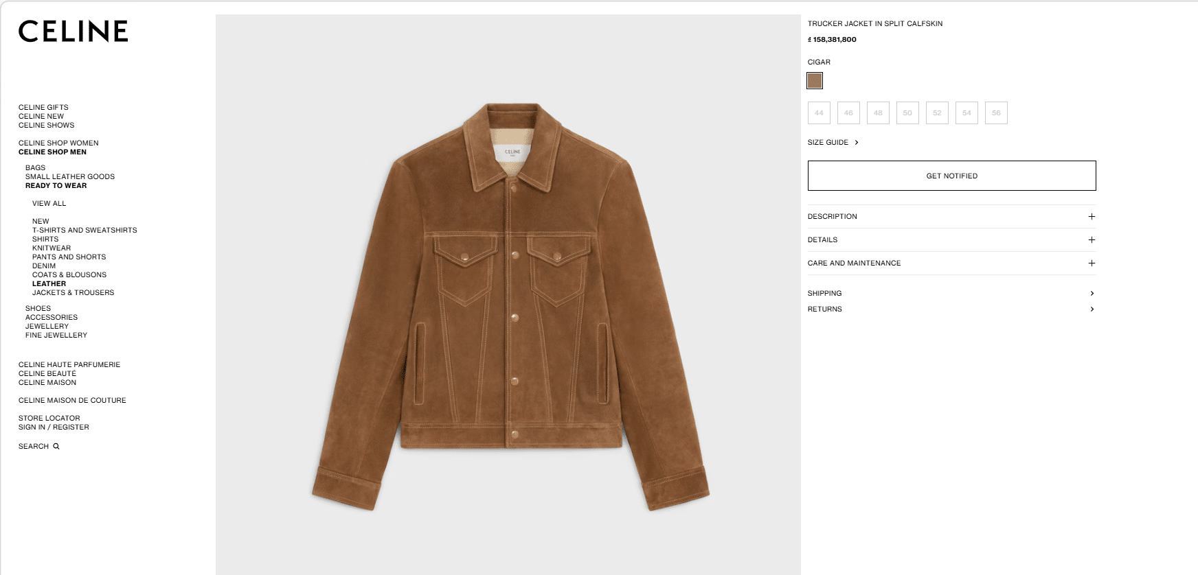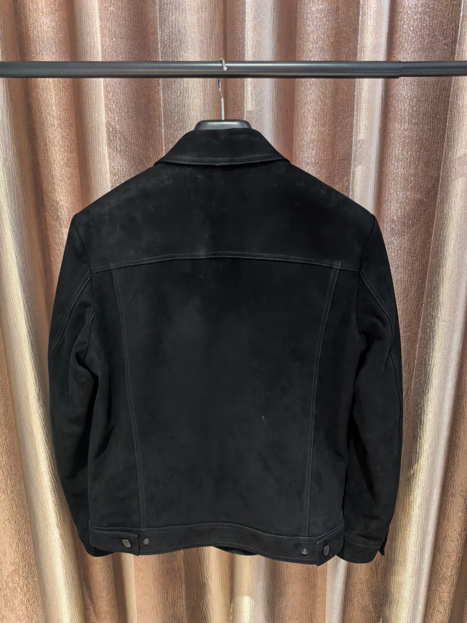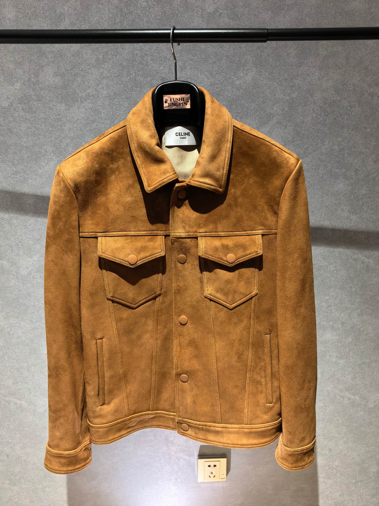 CELINE 25SS 컬렉션의 감각적인 스웨이드 레더 재킷으로, 클래식한 트러커 재킷 디자인을 기반으로 한 세련된 남성 아우터 아이템이다. 부드러운 터치감과 깊이 있는 질감이 돋보이는 프리미엄 스웨이드 가죽을 사용해 고급스럽고 자연스러운 분위기를 연출한다.