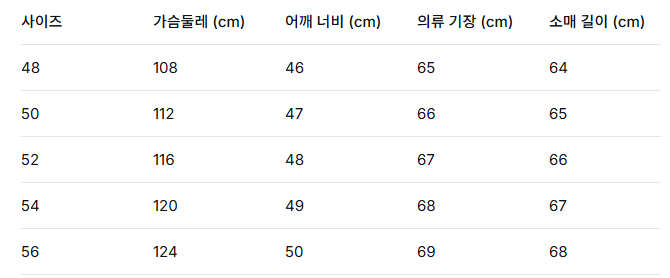 사이즈: 48 / 50 / 52 / 54 / 56