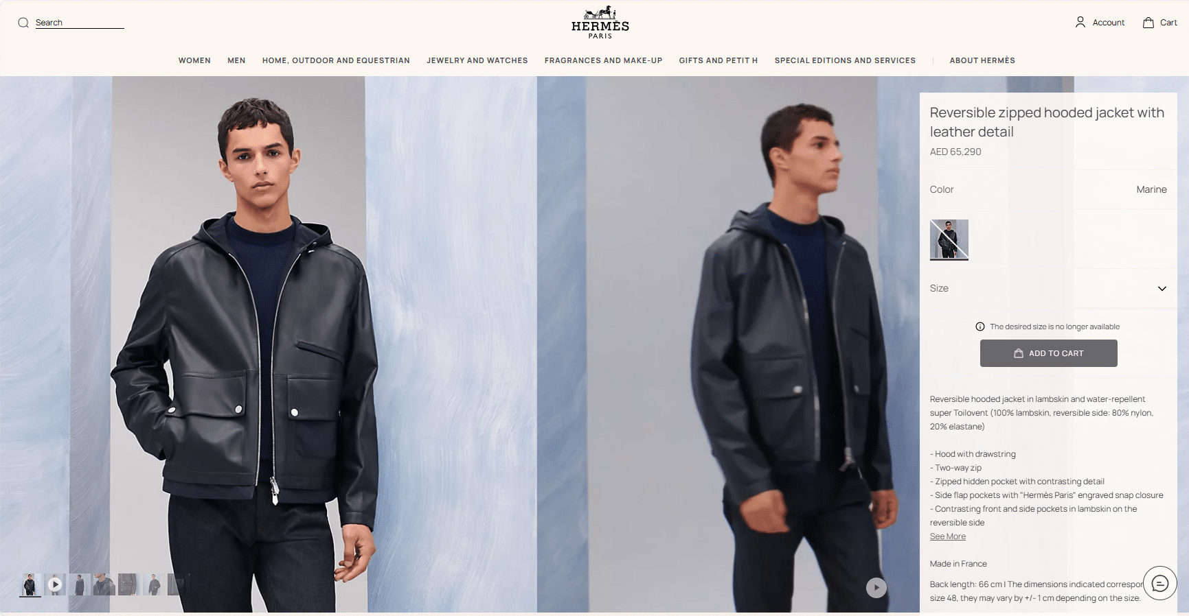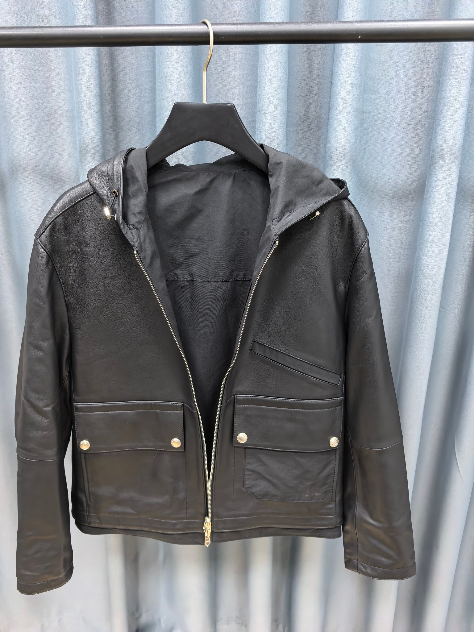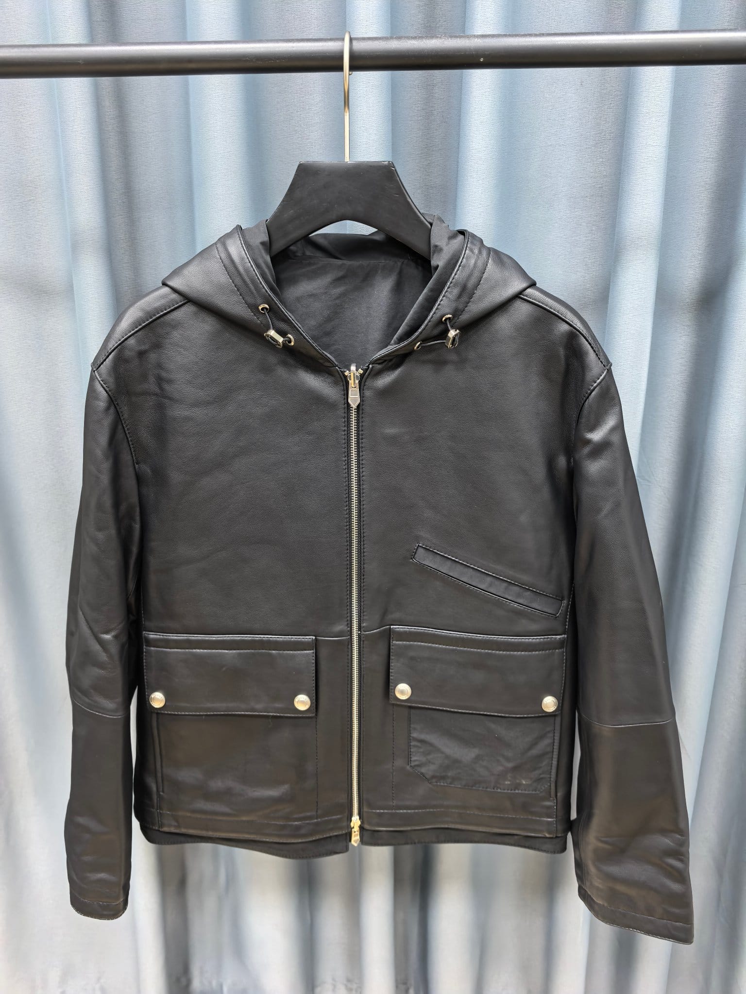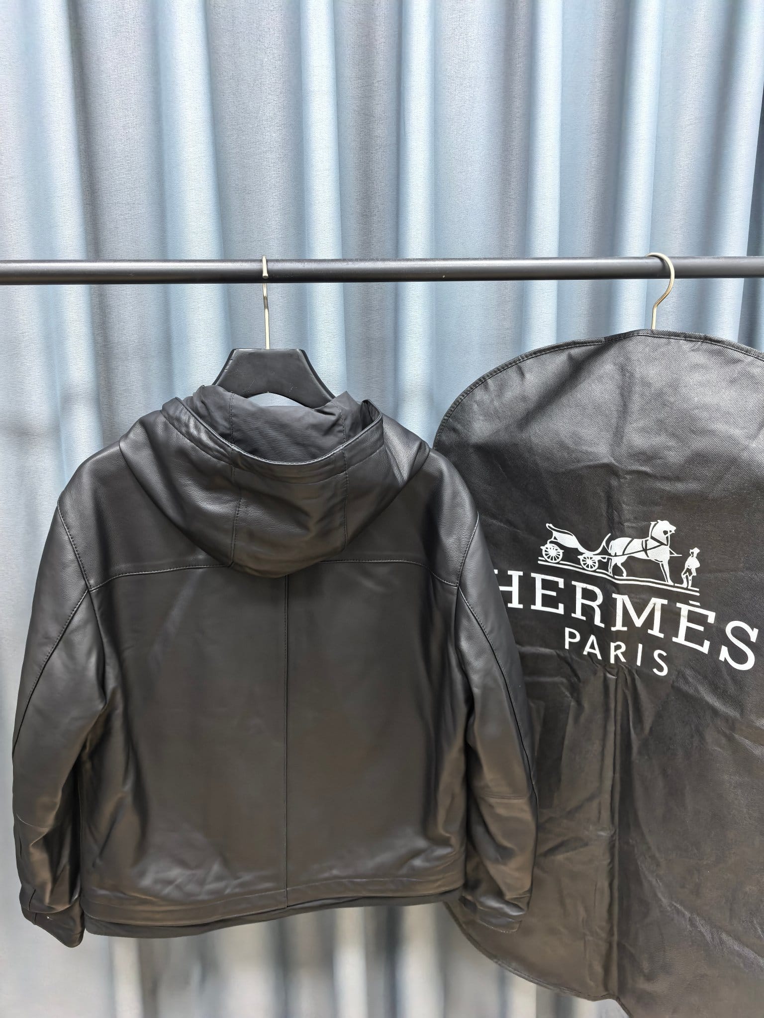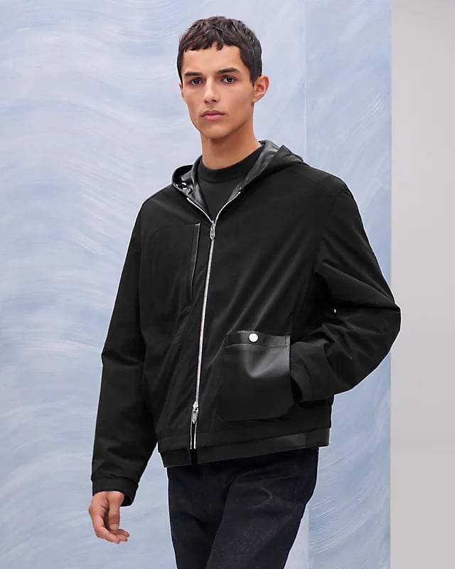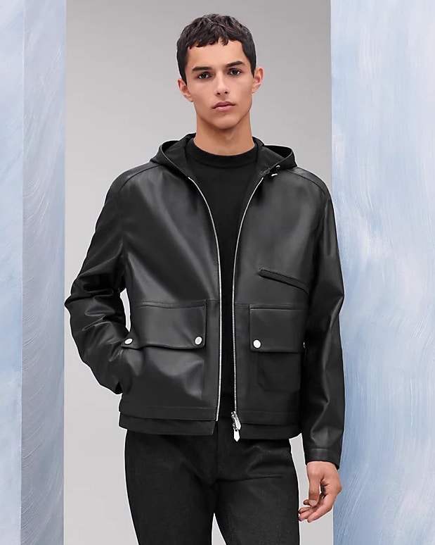 은은한 광택이 도는 블랙 컬러가 도시적인 분위기를 자아내며, 미세한 디테일까지 정교하게 마감되어 Hermès 특유의 장인정신이 느껴진다. 후드 디자인으로 캐주얼하면서도 품격 있는 무드를 연출할 수 있는 하이엔드 레더 아우터다.