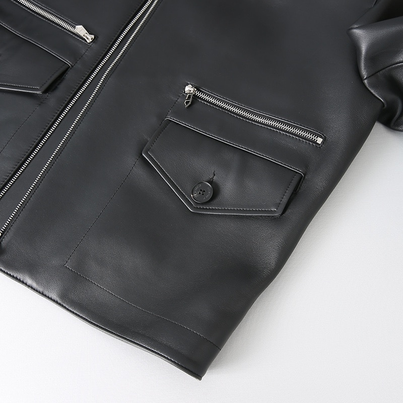 디테일:改良식 변형 셔츠 칼라, 비대칭 지퍼 클로저, 전면 지퍼 포켓 및 플랩 포켓 레이어드, 커스텀 실버 하드웨어