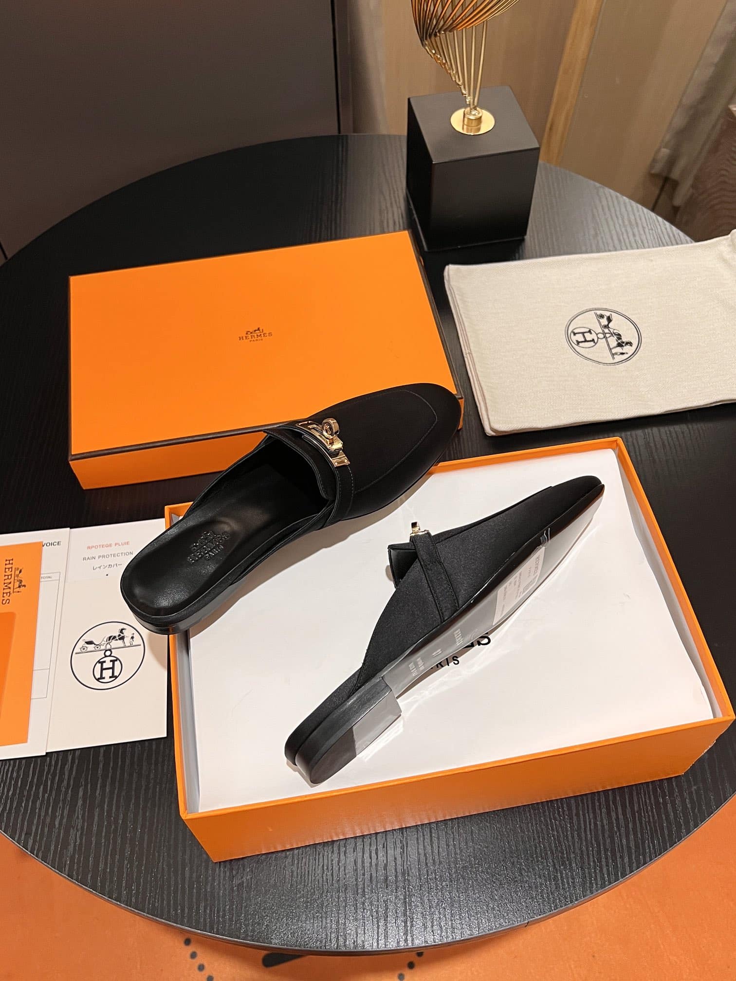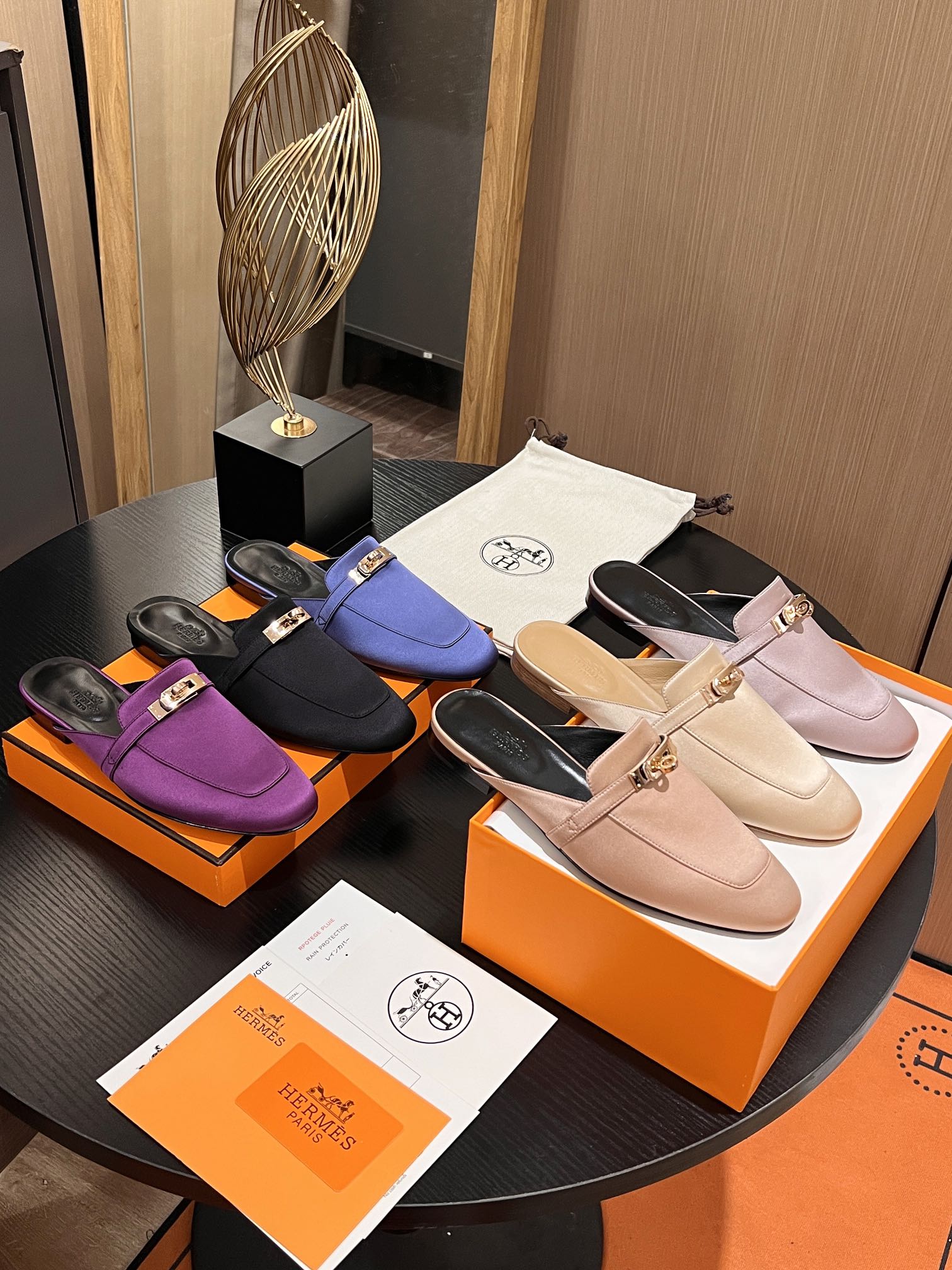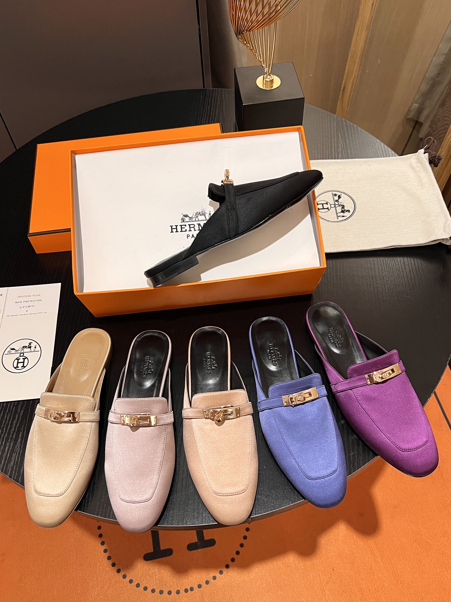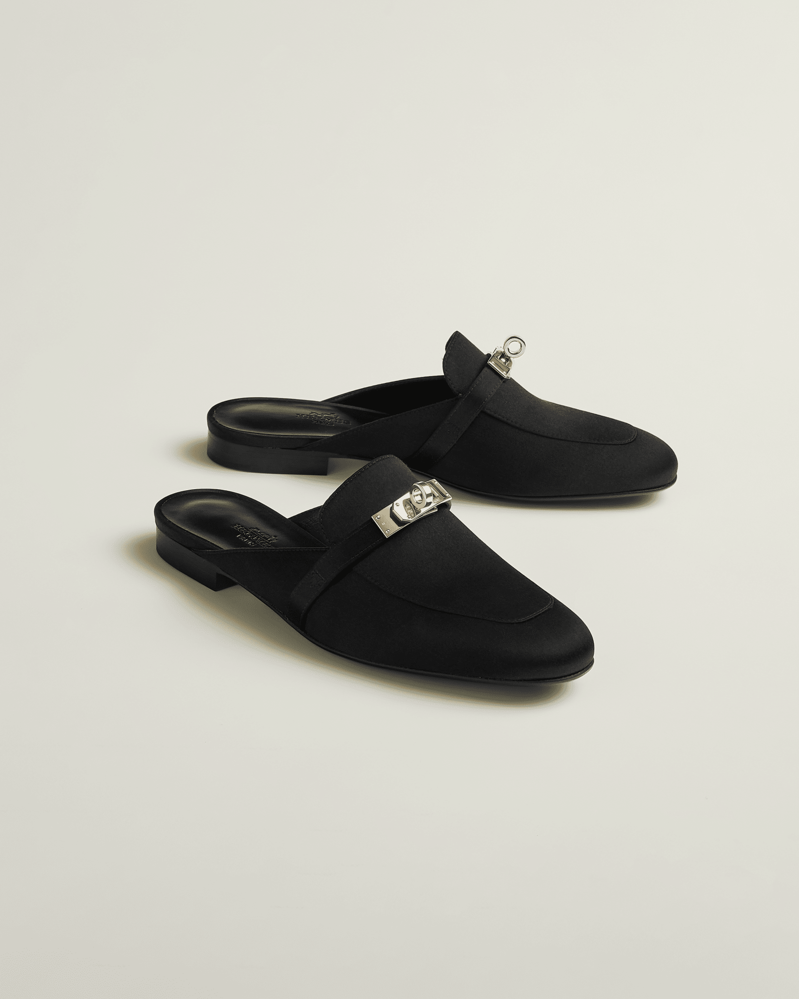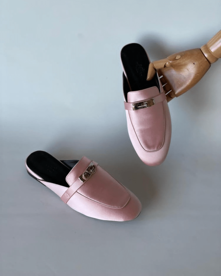 디자인: 켈리 버클 실크 뮬 슬리퍼 (정교한 하드웨어 각인, 클래식하고 우아한 실루엣)