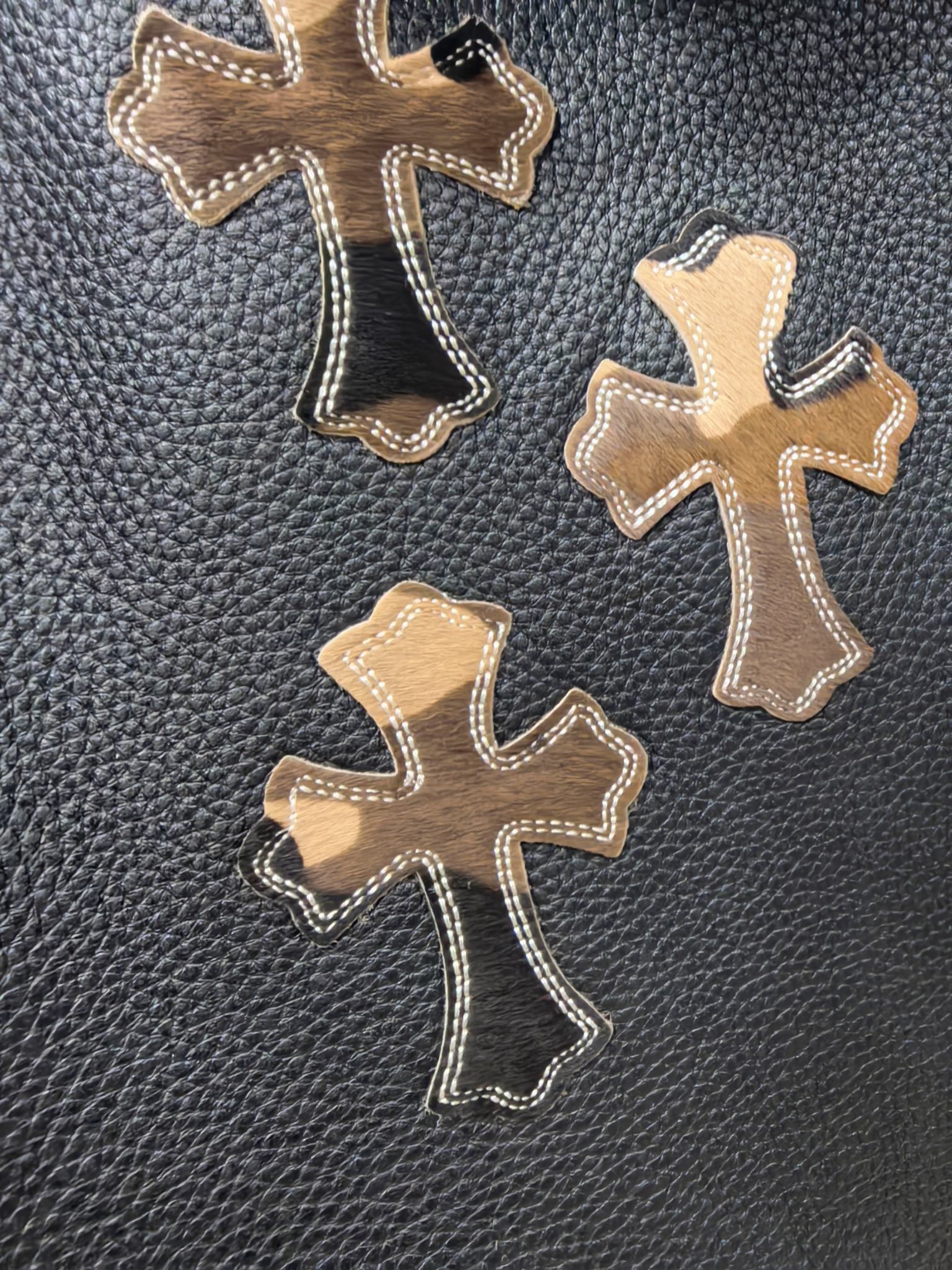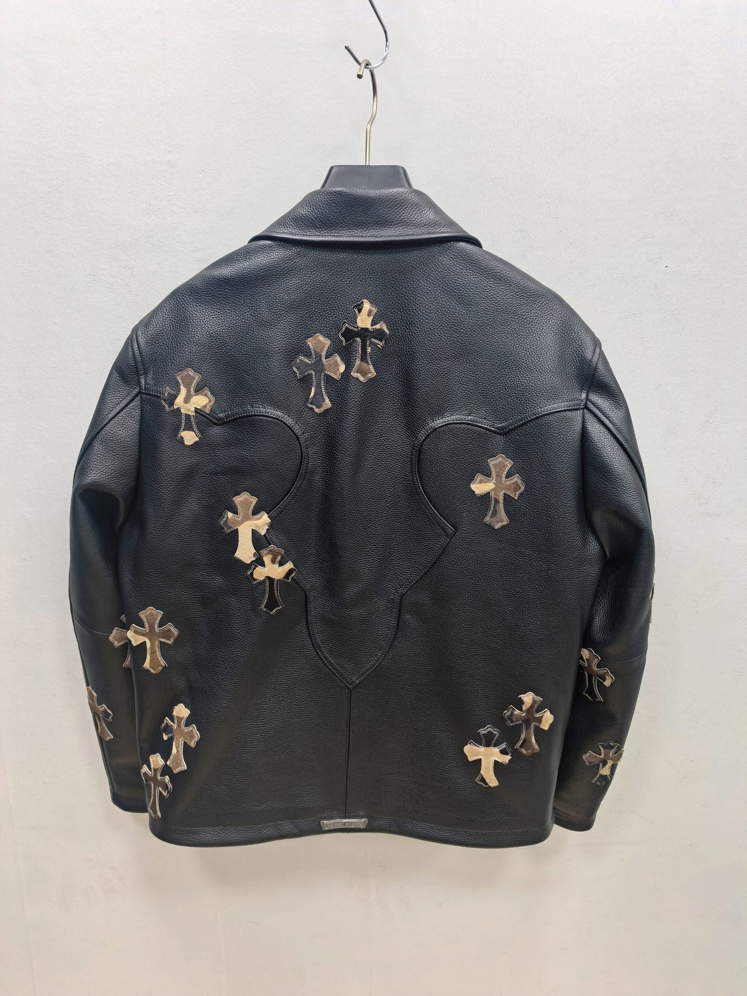 Chrome Hearts의 상징적인 크로스 모티프와 펑크 감성이 결합된 하이엔드 송아지 가죽 재킷입니다. 천연 풀그레인 송아지 가죽 특유의 질감과 두께감 있는 구조가 탄탄한 형태를 유지하며, 전면과 소매에 수작업으로 부착된 가죽 크로스 장식이 브랜드 고유의 반항적 미학을 표현합니다.