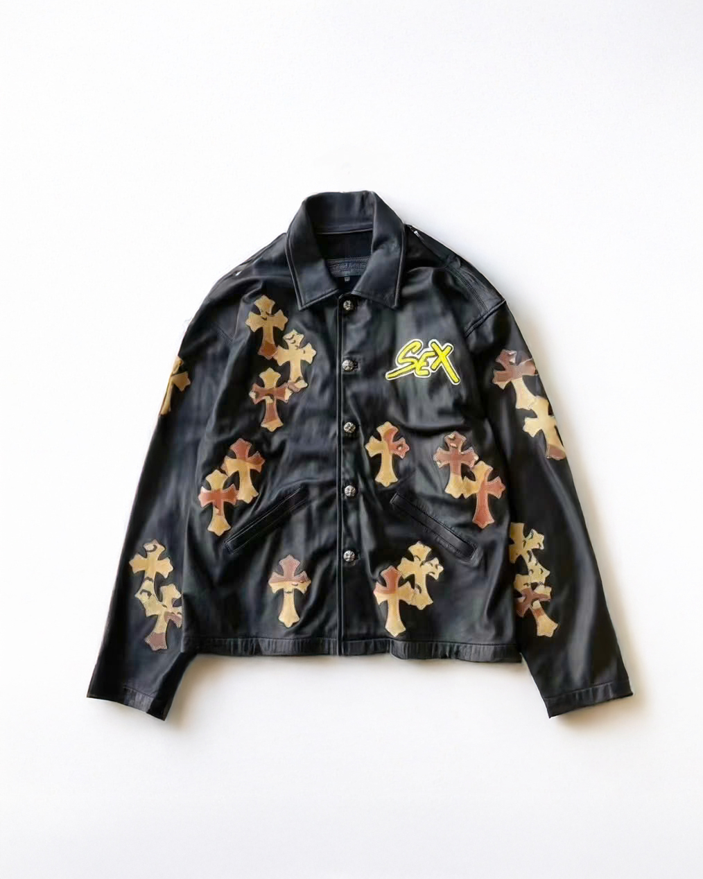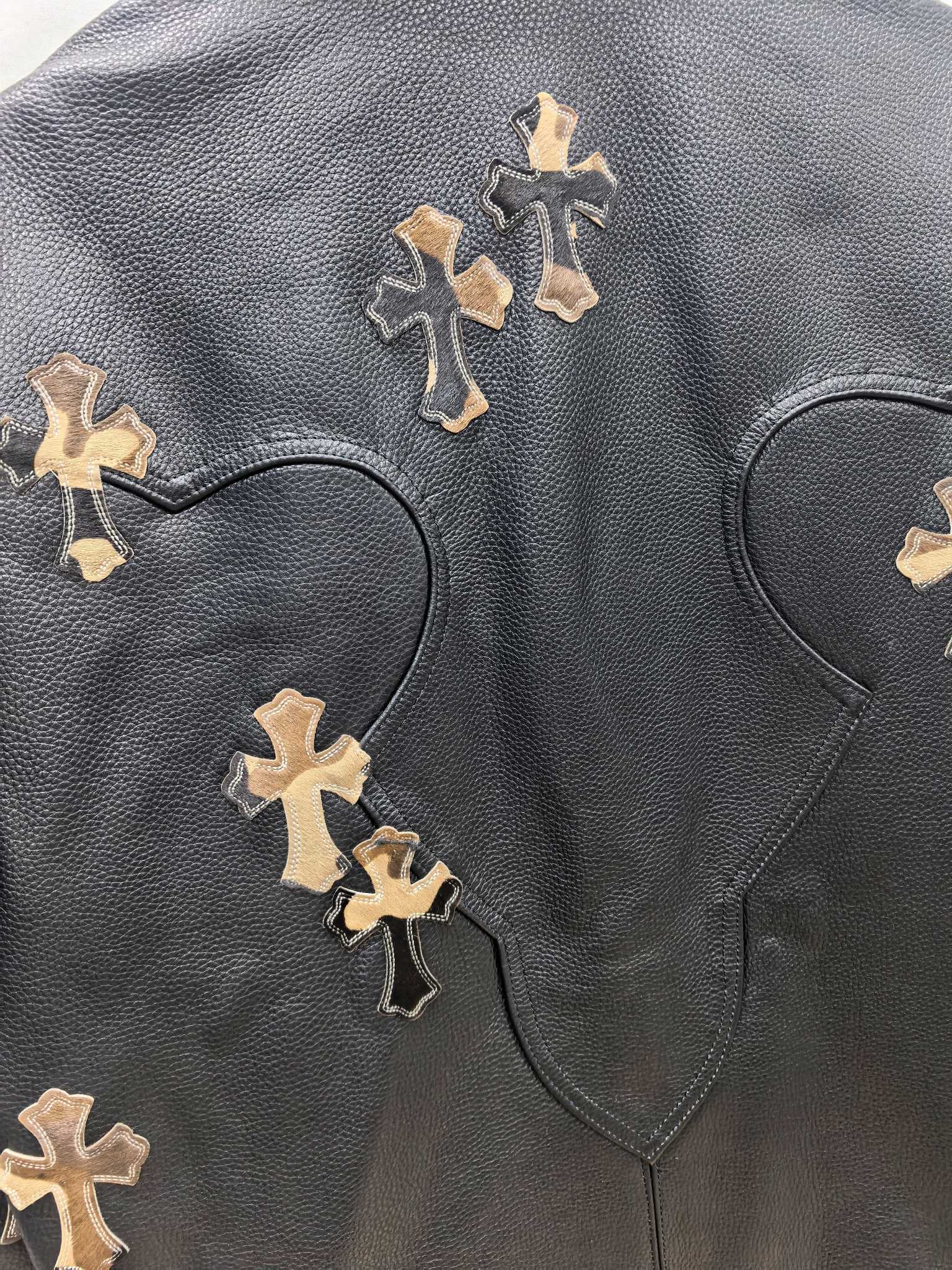 Chrome Hearts의 상징적인 크로스 모티프와 펑크 감성이 결합된 하이엔드 송아지 가죽 재킷입니다. 천연 풀그레인 송아지 가죽 특유의 질감과 두께감 있는 구조가 탄탄한 형태를 유지하며, 전면과 소매에 수작업으로 부착된 가죽 크로스 장식이 브랜드 고유의 반항적 미학을 표현합니다.