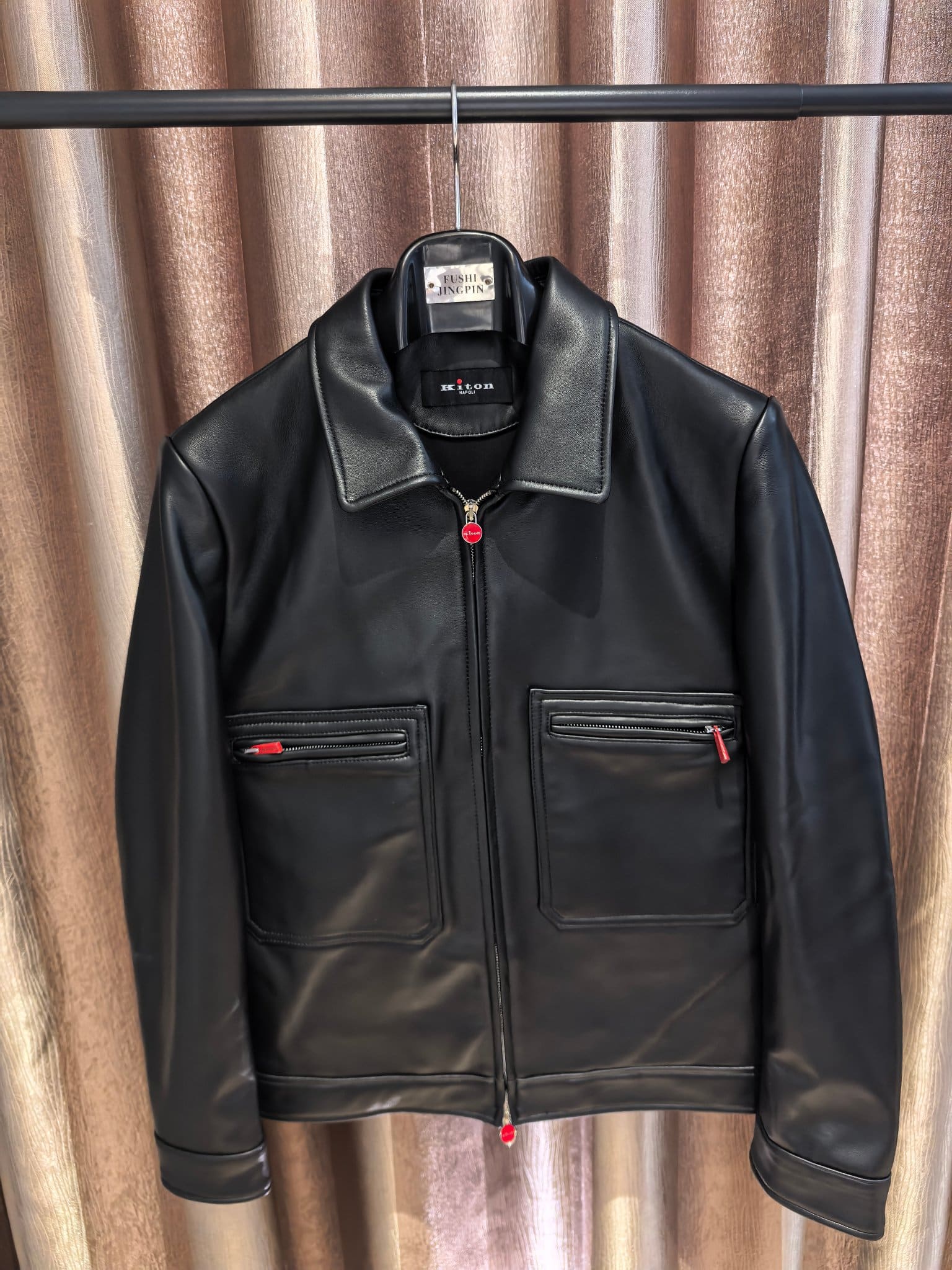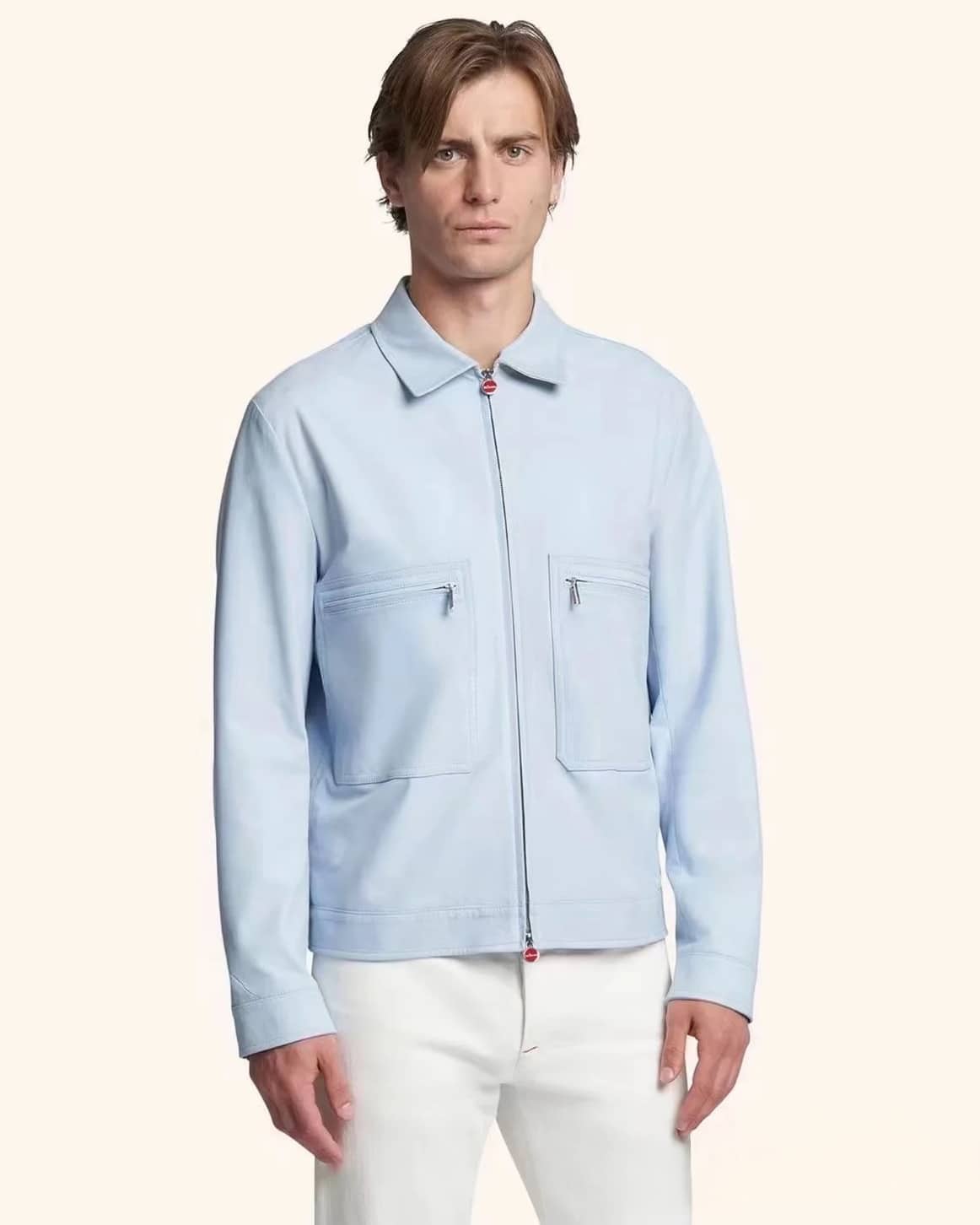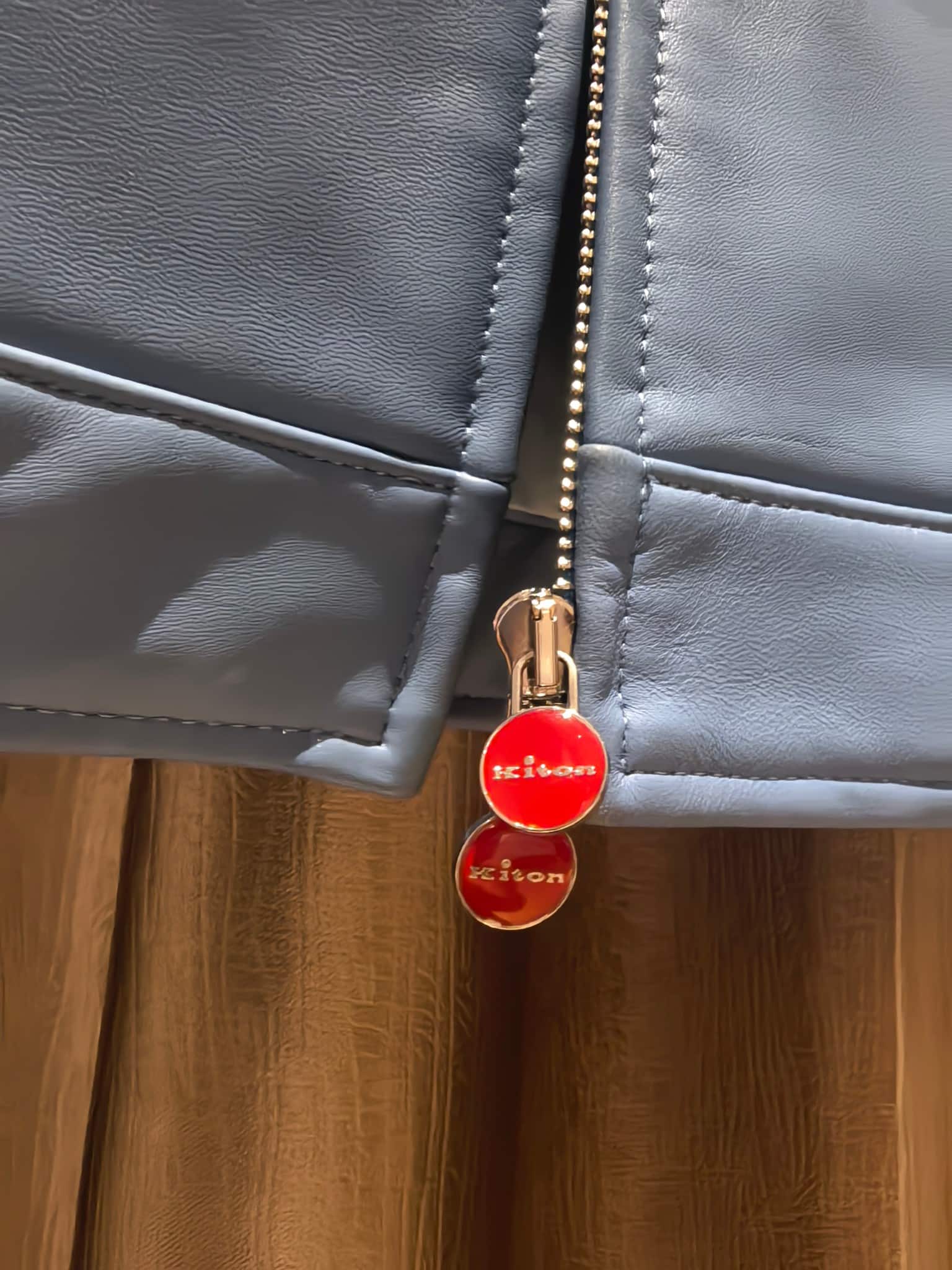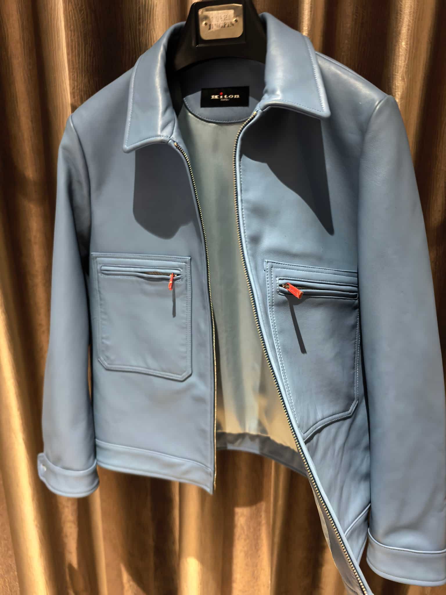 Kiton 2025 가을·겨울 남성 컬렉션에서 선보이는 프리미엄 레더 집업 재킷. 엄선된 수입 천연 가죽을 사용해 제작되어 부드럽고 유연한 촉감과 자연스러운 광택이 특징이며, 미니멀한 디자인 속에서도 고급스러운 존재감을 드러낸다.
