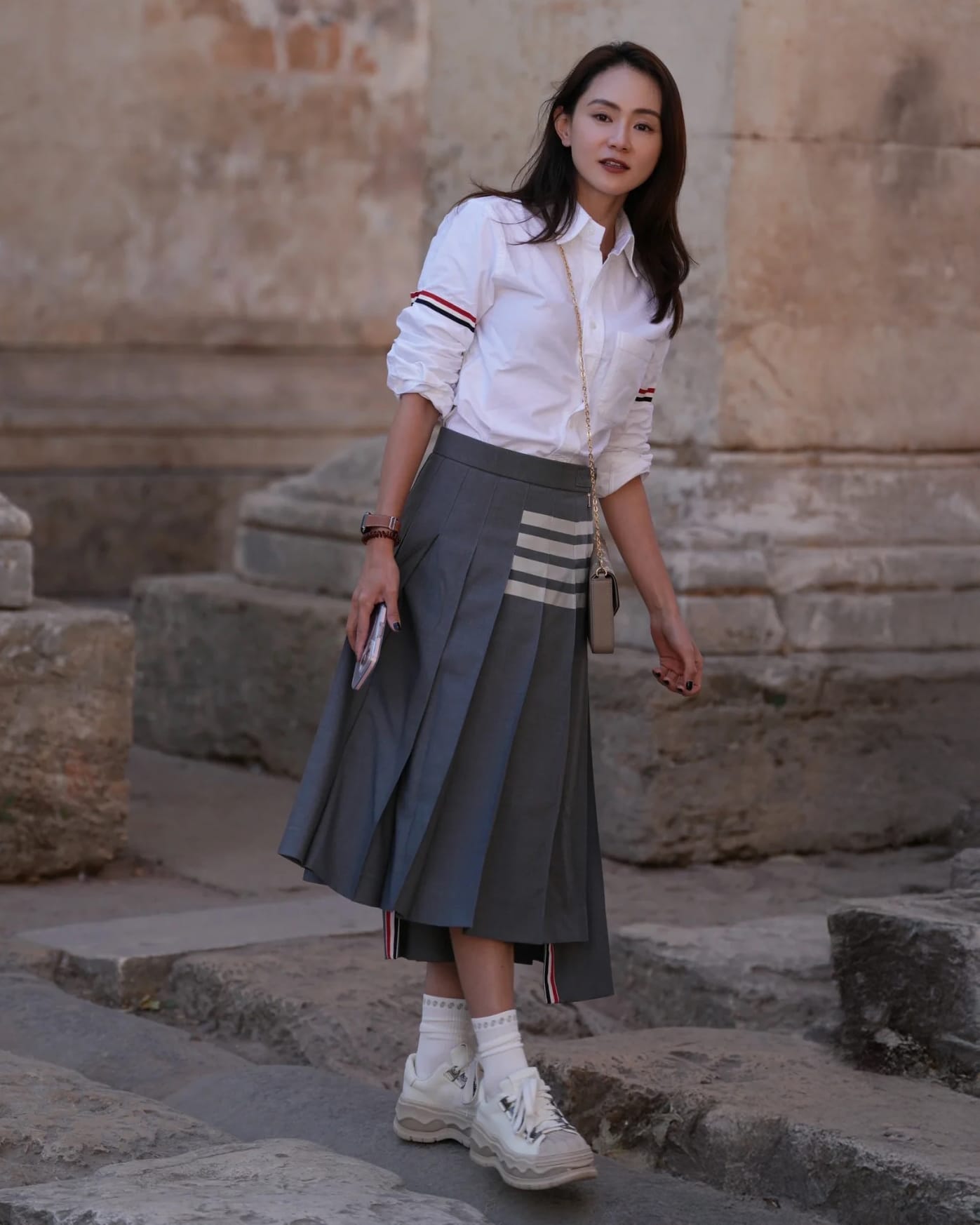 톰브라운의 상징적인 프레피 룩을 가장 우아하게 표현한 4-Bar 백 스트랩 미디 플리츠 스커트입니다. 기존의 짧은 테니스 스커트 라인에서 벗어나 무릎을 덮는 롱 버전(익스텐디드 버전) 으로 설계되어 더욱 성숙하고 기품 있는 실루엣을 선사합니다.