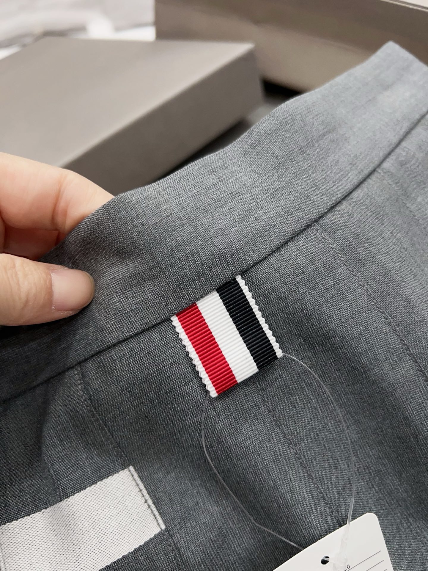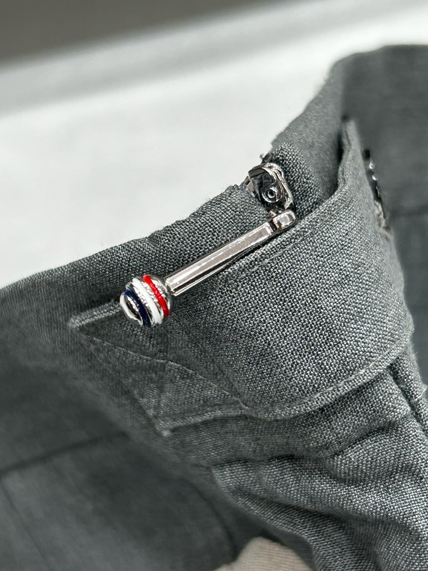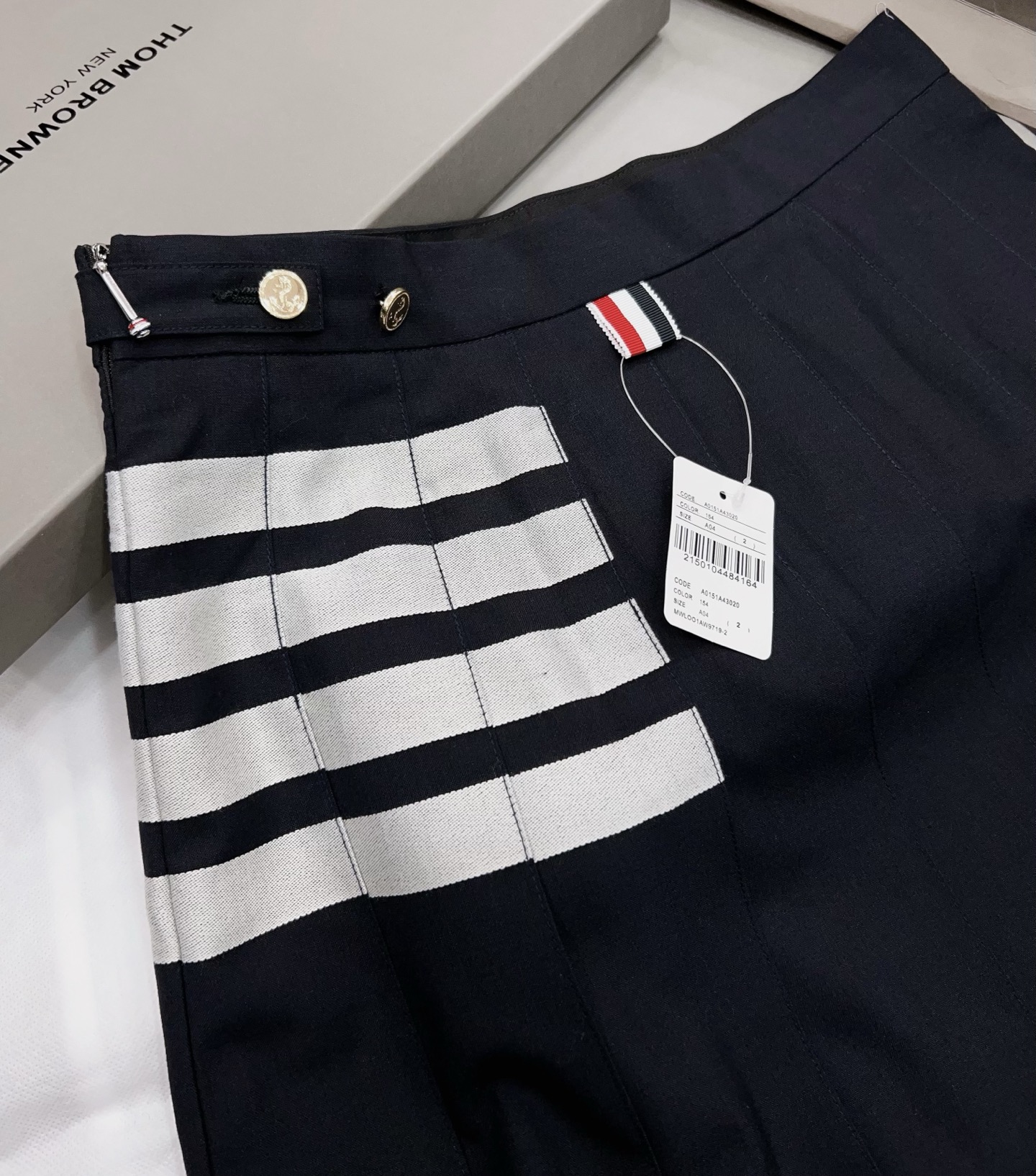 왼쪽 허벅지 라인의 시그니처 4-Bar 화이트 스트라이프와 걸음마다 경쾌하게 흔들리는 플리츠(주름) 디테일이 조화를 이루며, 하단부의 비대칭 슬릿 디자인이 현대적인 세련미를 더합니다. 또한 허리 뒷면의 RWB(레드, 화이트, 블루) 그로그랭 루프와 천연 자개 단추 마감은 톰브라운만의 독보적인 럭셔리 디테일을 완성합니다.
