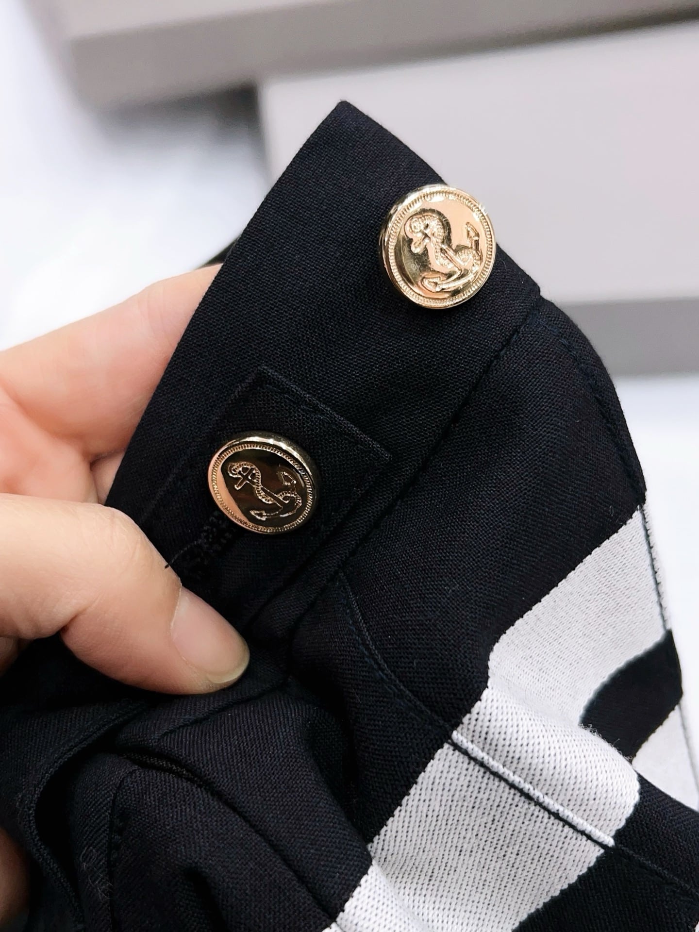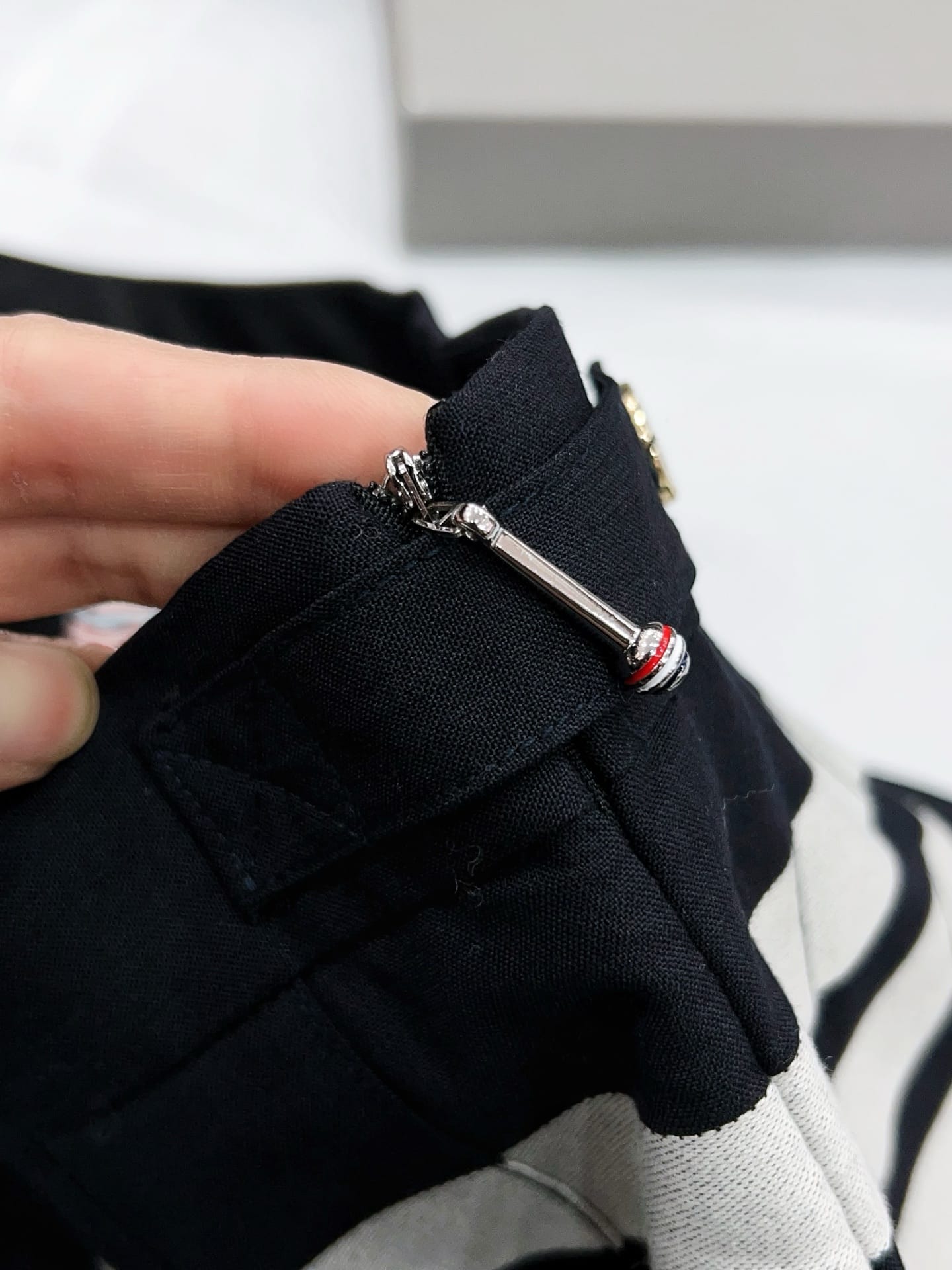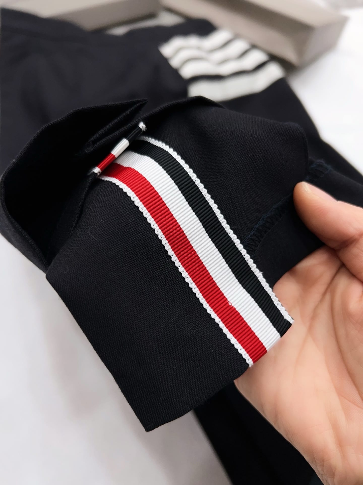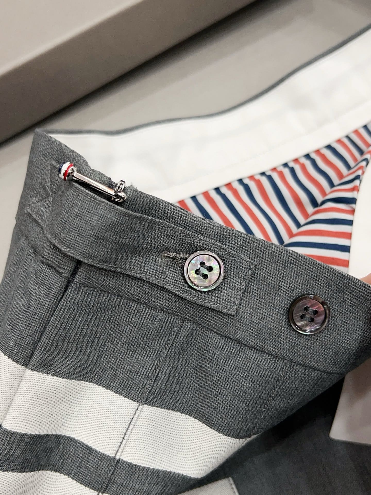 왼쪽 허벅지 라인의 시그니처 4-Bar 화이트 스트라이프와 걸음마다 경쾌하게 흔들리는 플리츠(주름) 디테일이 조화를 이루며, 하단부의 비대칭 슬릿 디자인이 현대적인 세련미를 더합니다. 또한 허리 뒷면의 RWB(레드, 화이트, 블루) 그로그랭 루프와 천연 자개 단추 마감은 톰브라운만의 독보적인 럭셔리 디테일을 완성합니다.