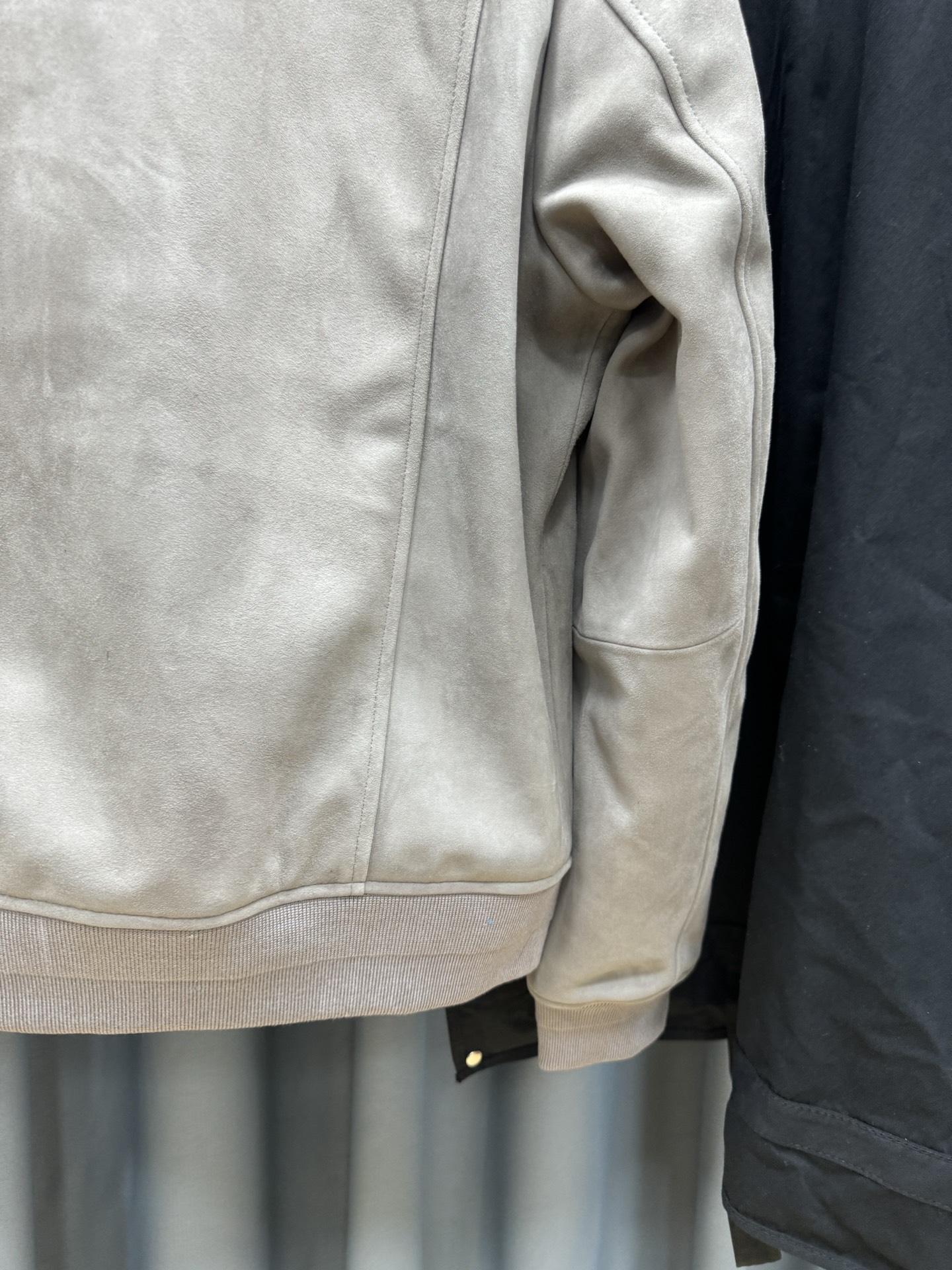 디테일: 순모 스웨이드 질감, 미세한 컬러 쉐이드 변화, 포켓 및 플래킷 가죽 트리밍, 립 마감, 루즈 핏 실루엣