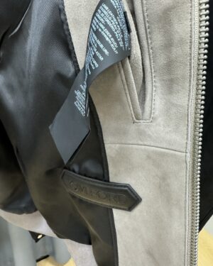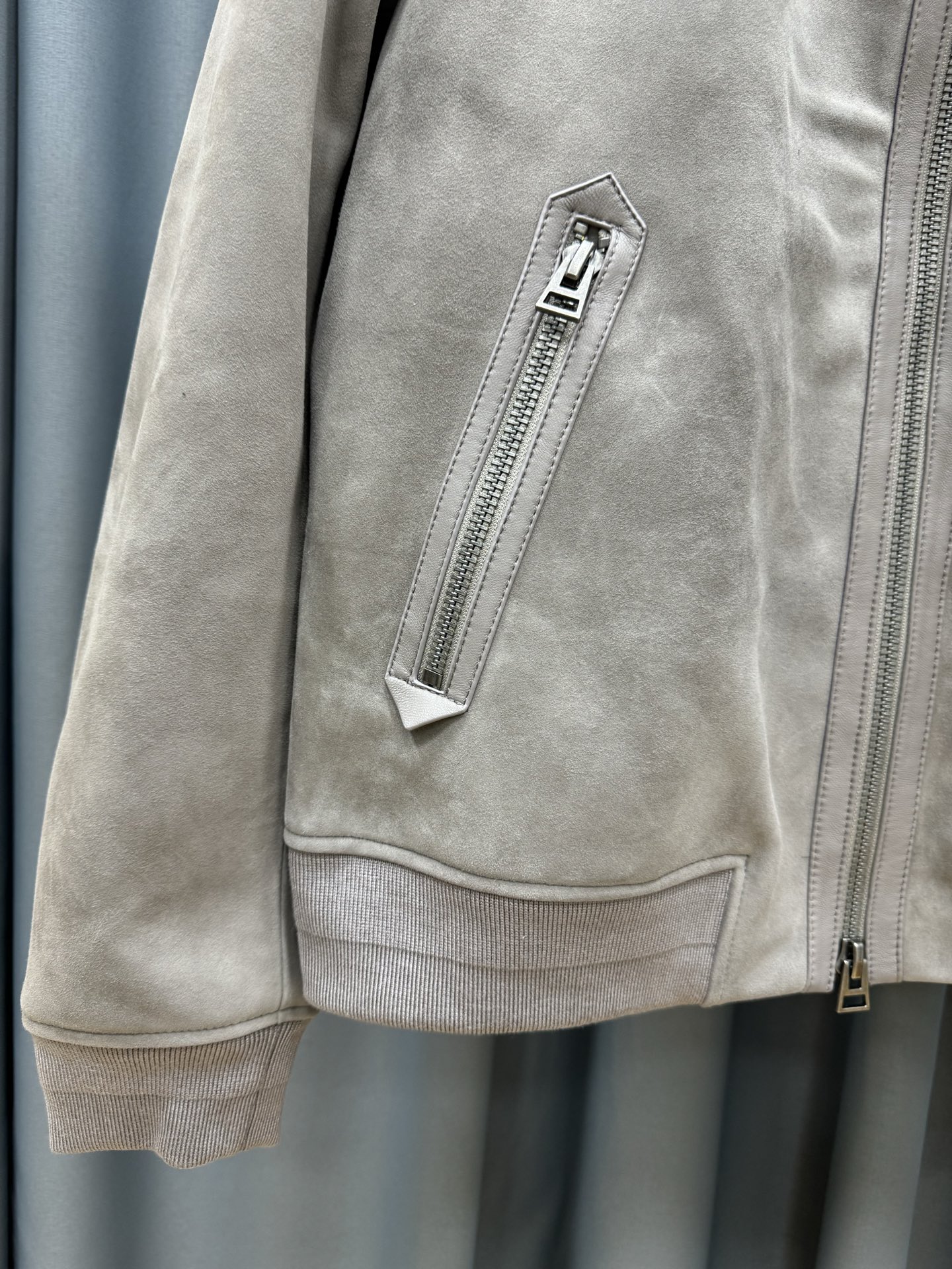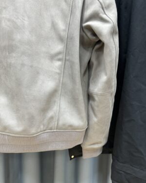 디테일: 순모 스웨이드 질감, 미세한 컬러 쉐이드 변화, 포켓 및 플래킷 가죽 트리밍, 립 마감, 루즈 핏 실루엣