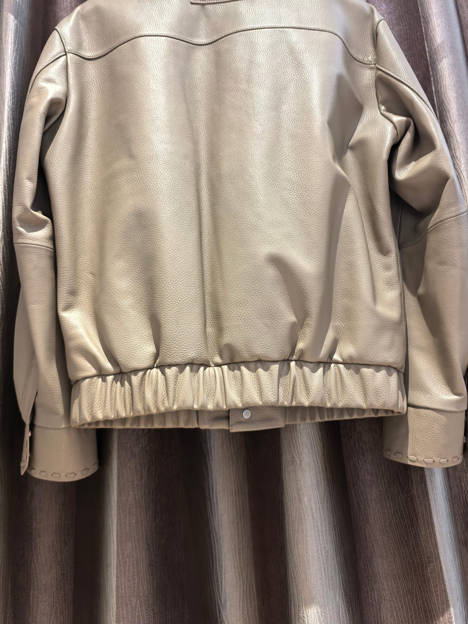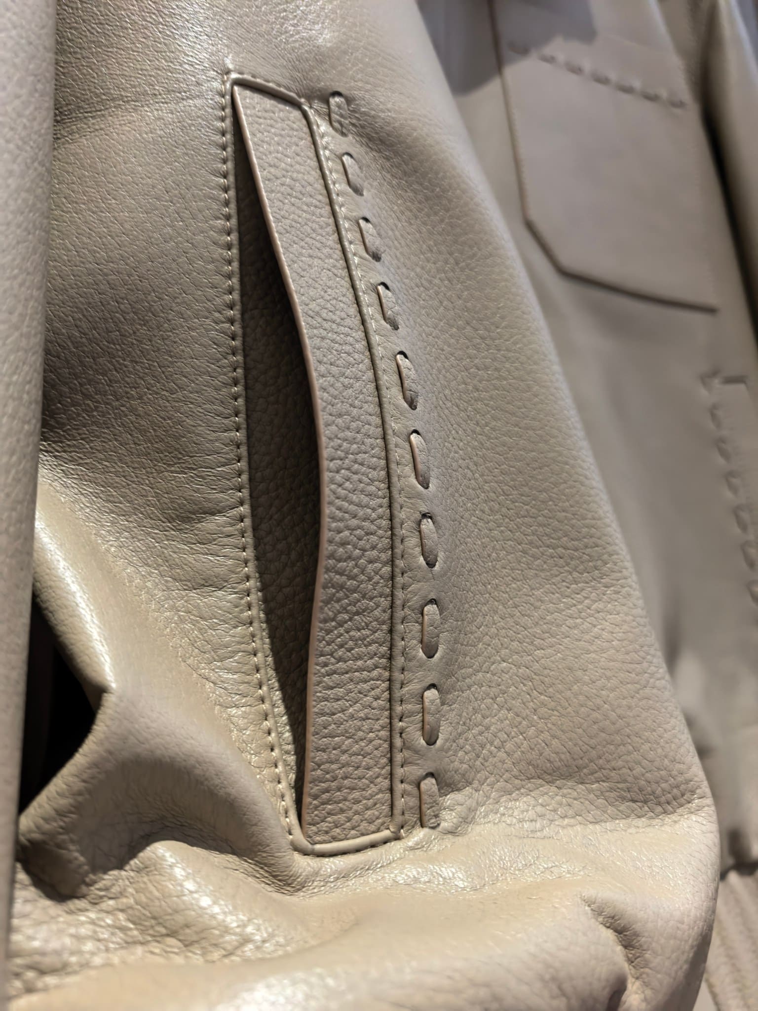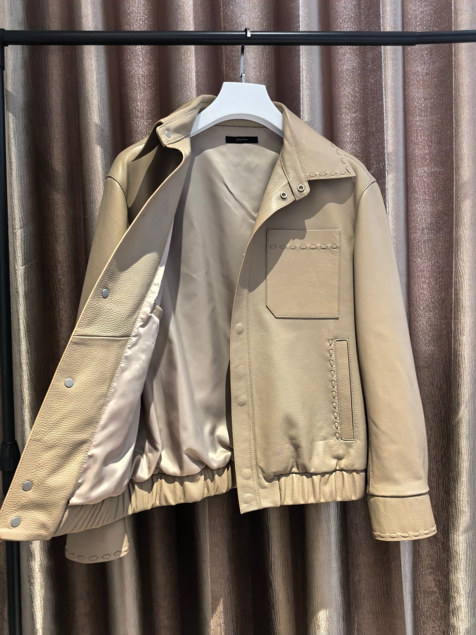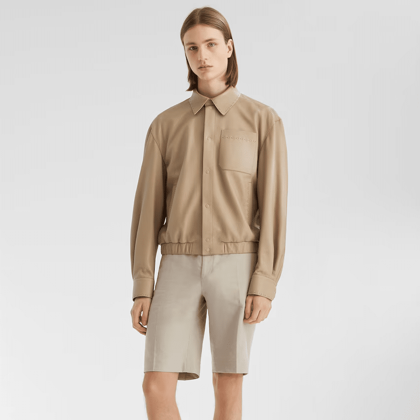 펜디의 2025년 봄·여름 시즌을 겨냥하여 제작된 독창적인 디자인의 레더 자켓입니다. 스페인에서 직수입한 최상급 양가죽을 사용하여 가벼우면서도 실크처럼 매끄러운 터치감을 선사하며, 은은한 베이지 톤의 컬러가 가죽 본연의 고급스러움을 극대화합니다.