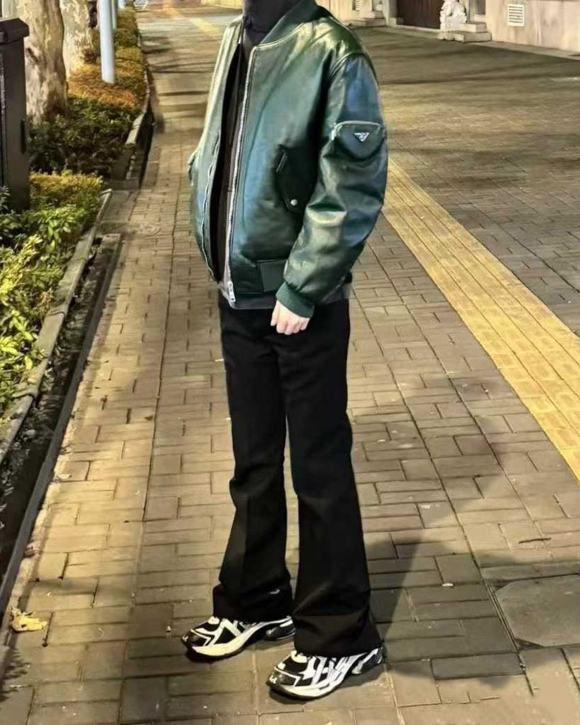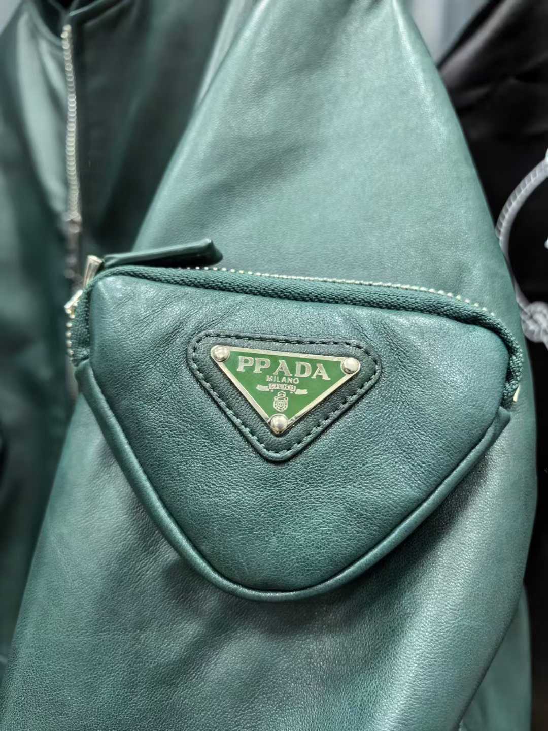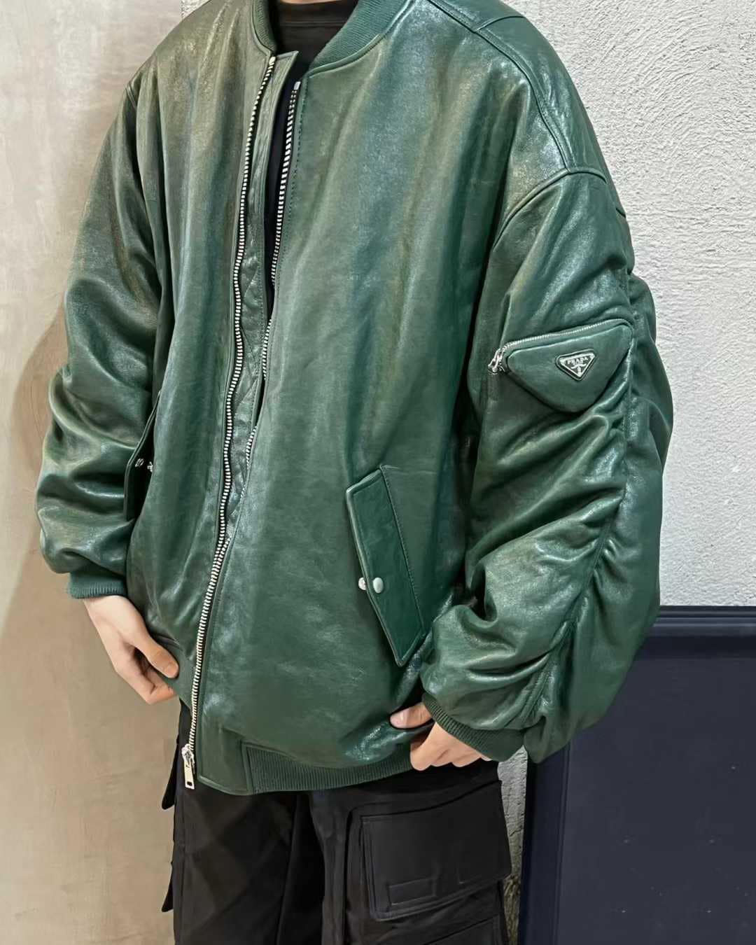왼쪽 소매의 지퍼 포켓 위로 상징적인 에나멜 트라이앵글 로고가 배치되어 브랜드의 아이덴티티를 명확히 드러내며, 딥 그린 컬러의 오묘한 광택이 가죽의 고급스러움을 한층 더 부각합니다. 세련된 도시적 무드와 스포티한 감성이 조화를 이루어, 유행을 타지 않고 오랜 기간 소장할 가치가 충분한 프리미엄 아우터입니다.