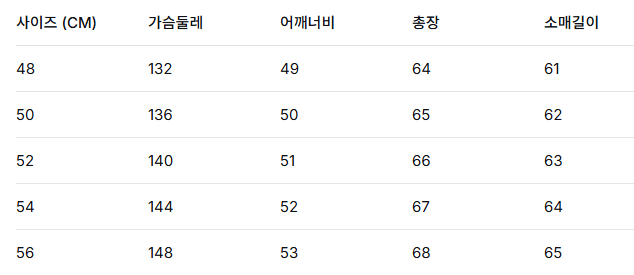사이즈: 48 / 50 / 52 / 54 / 56