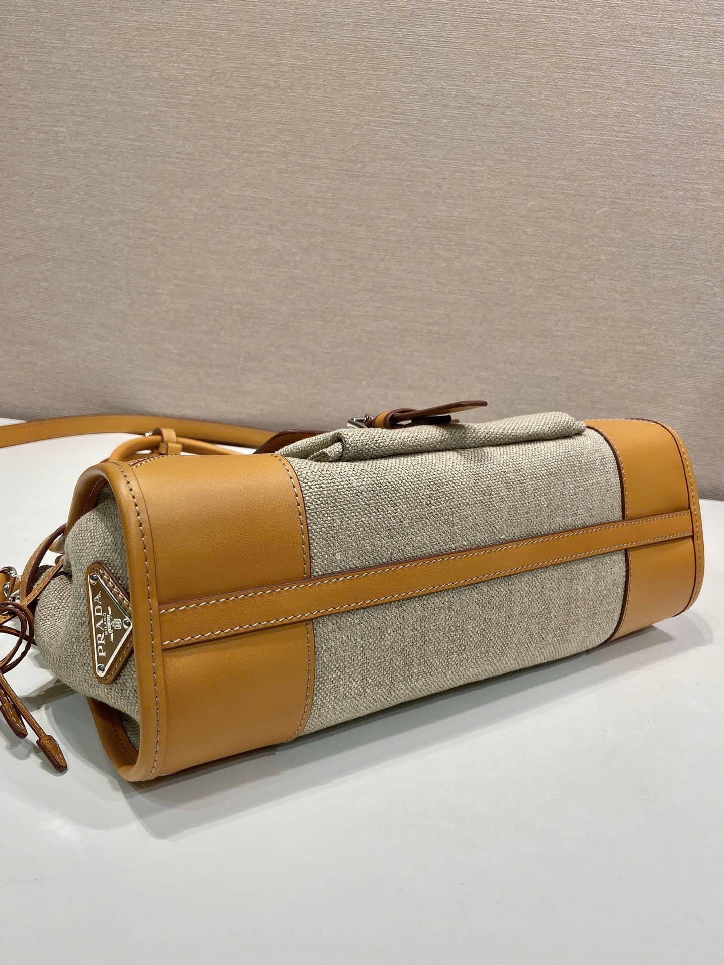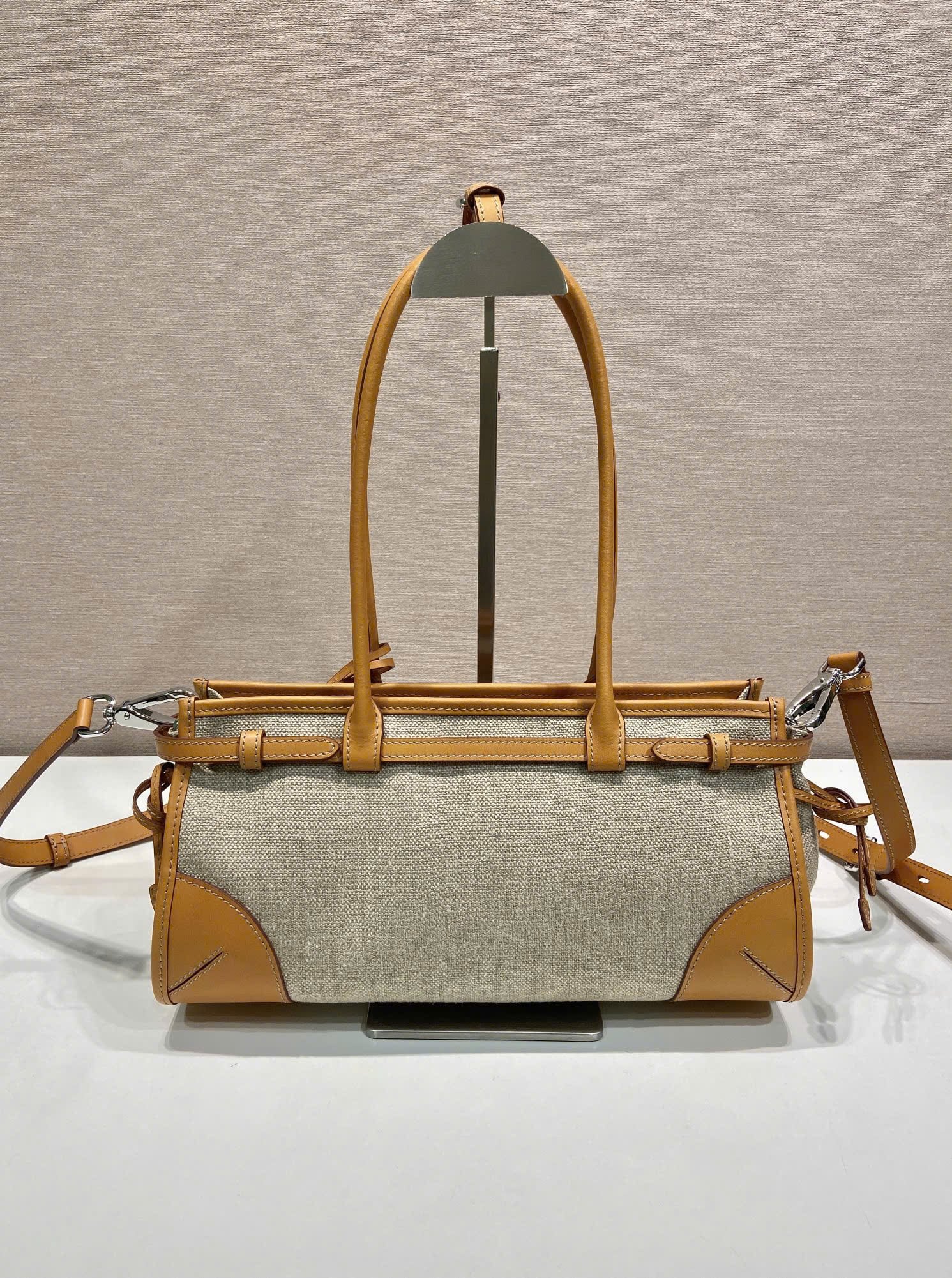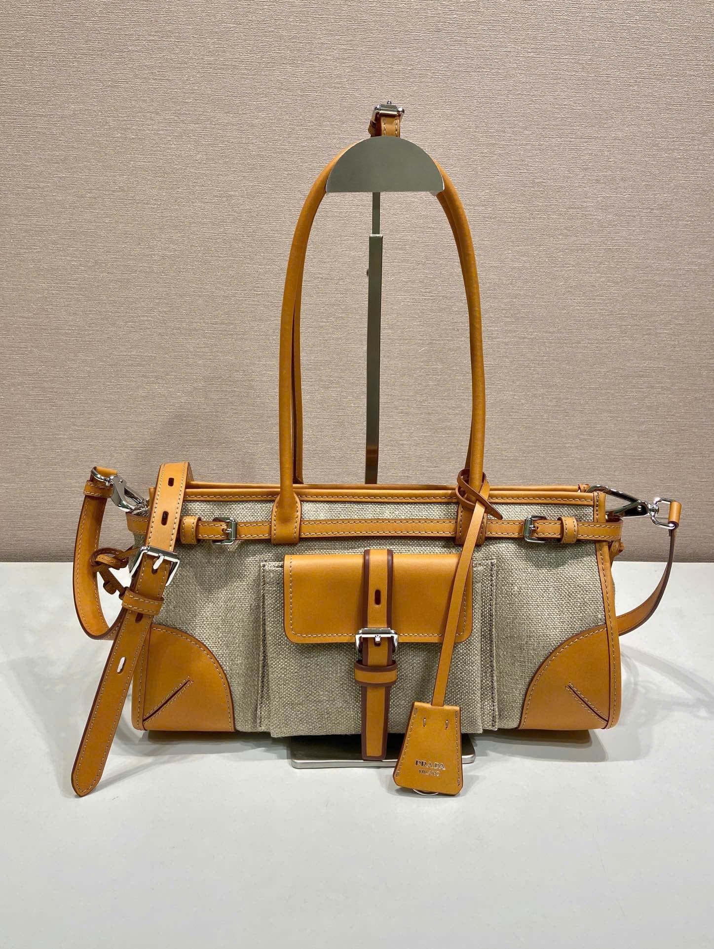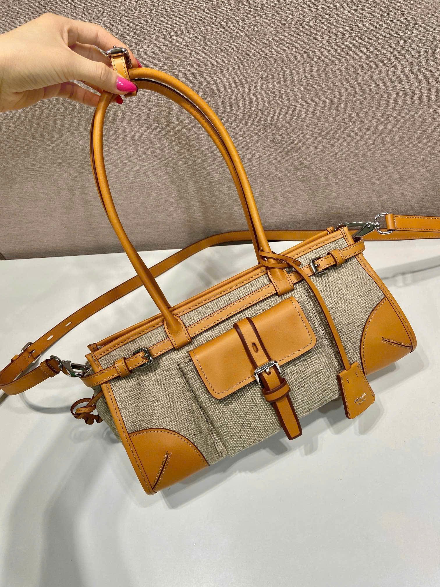 [프라다] 보니 미디엄 린넨 및 가죽 핸드백 1BA426