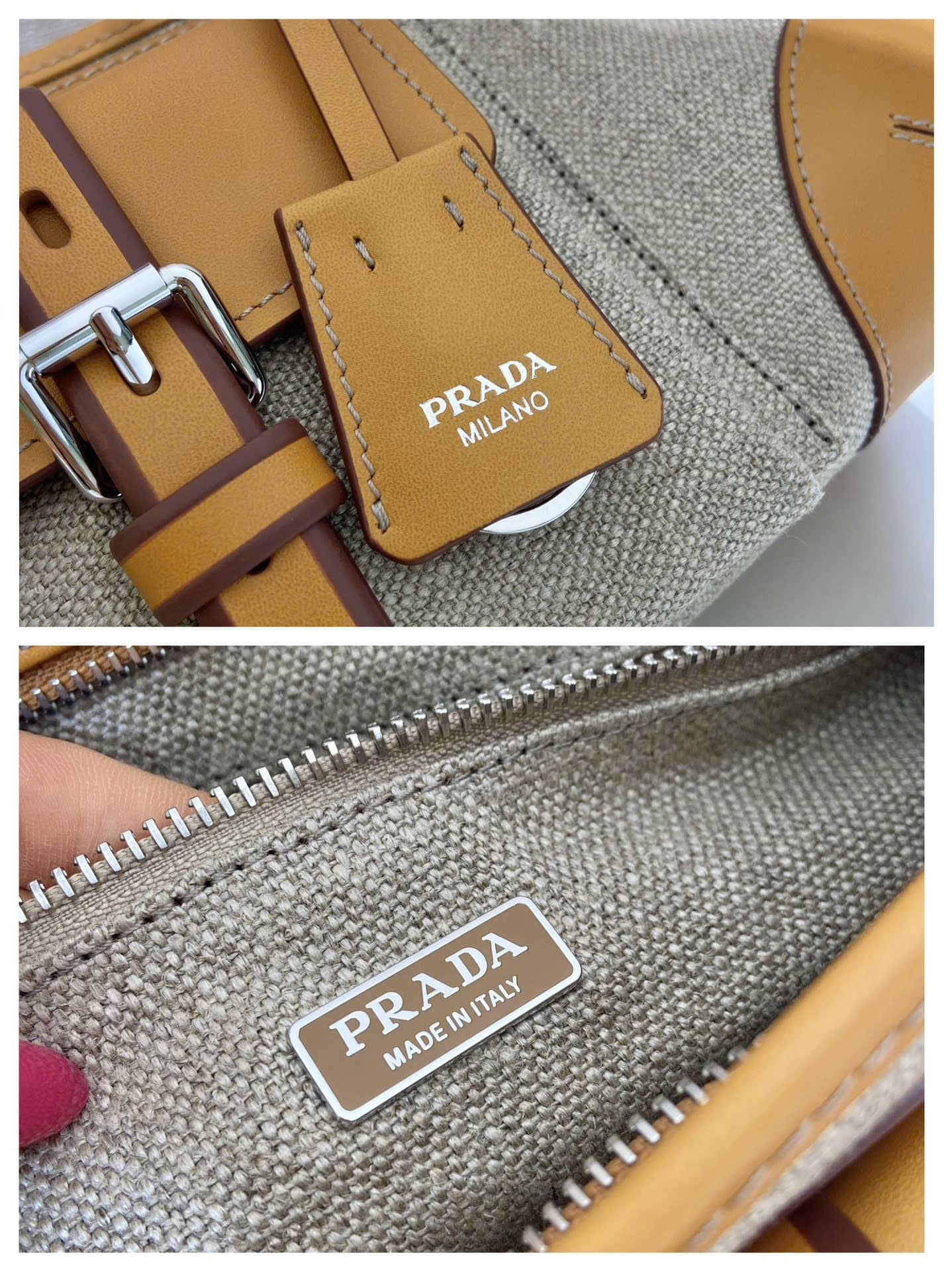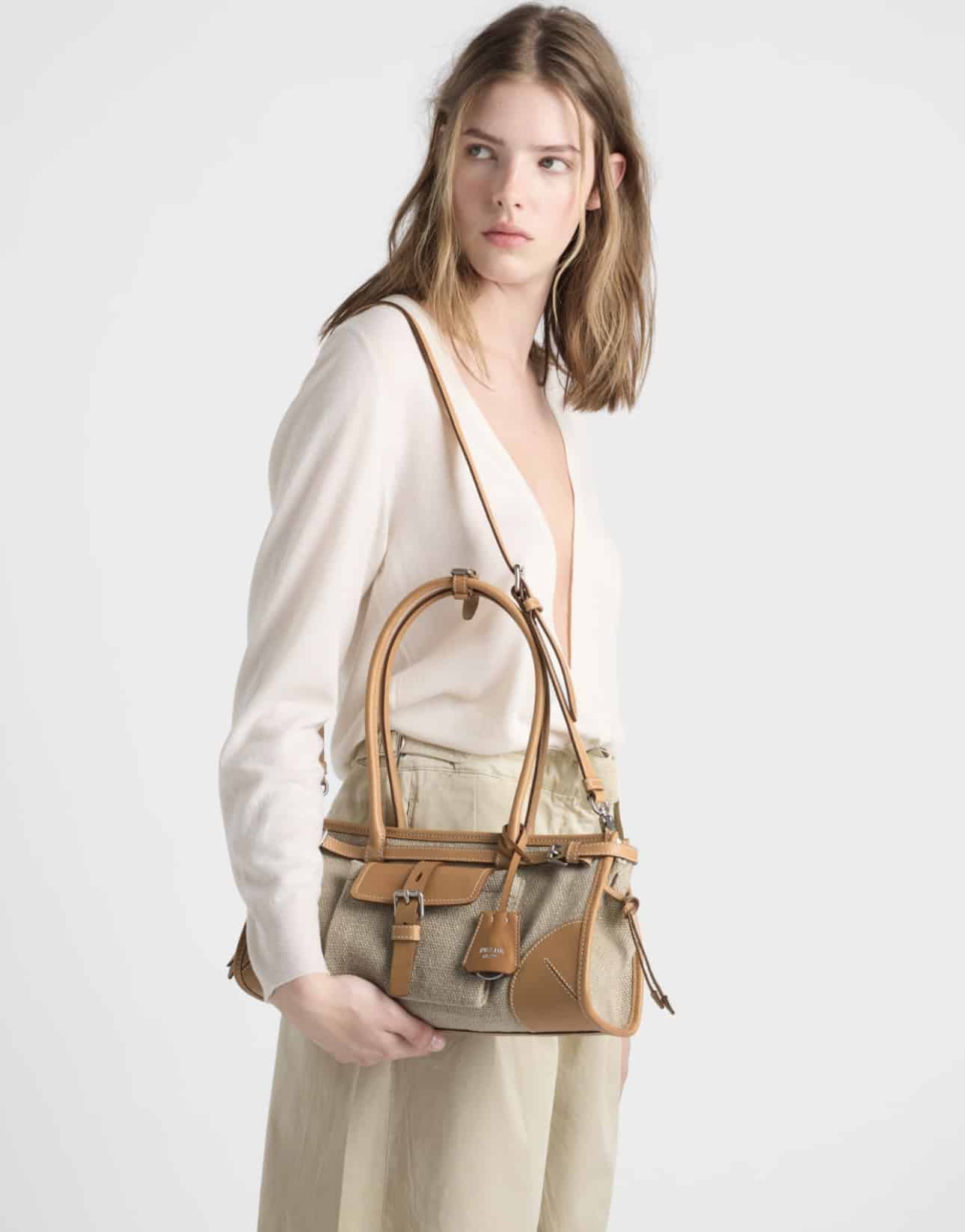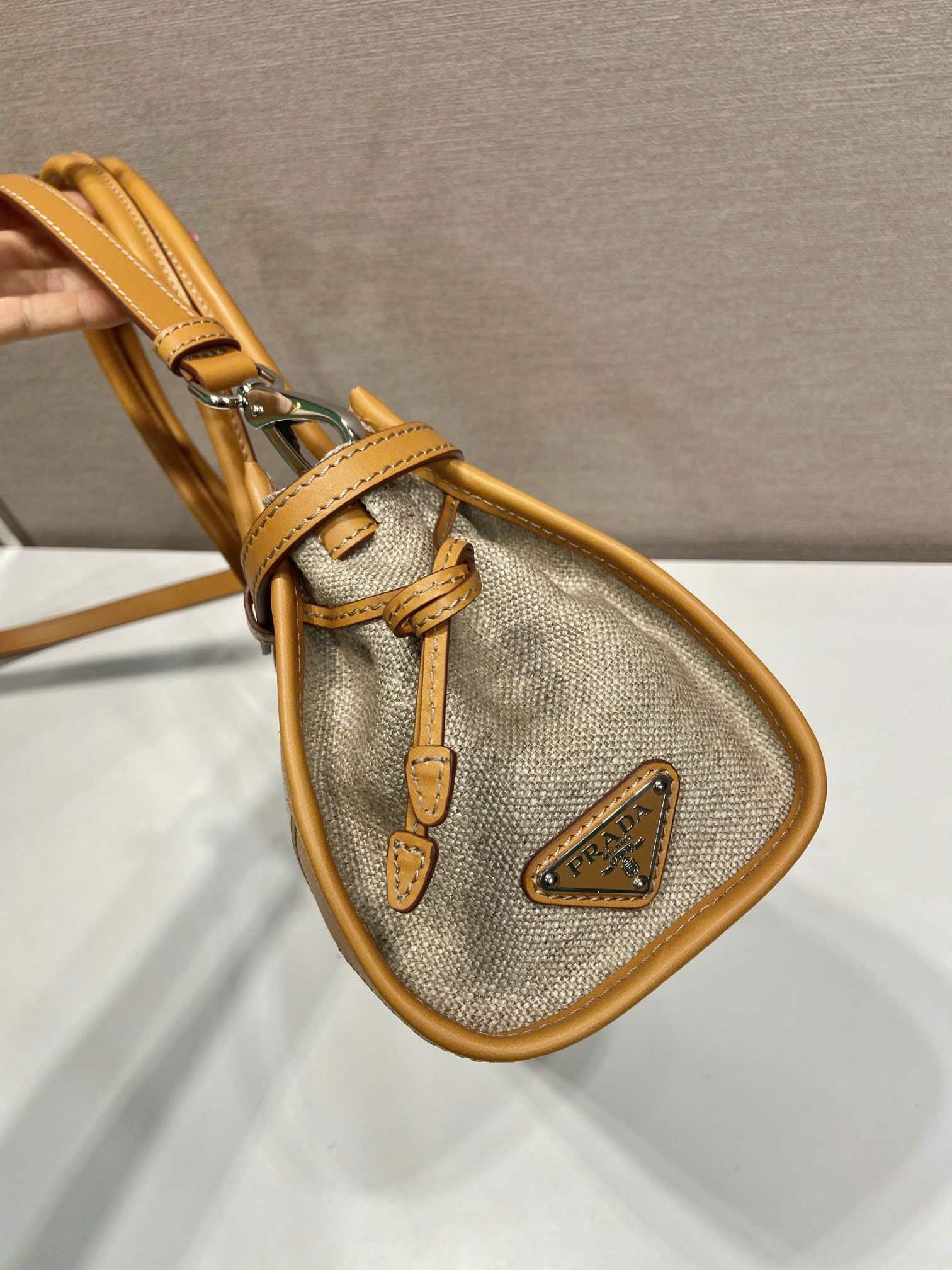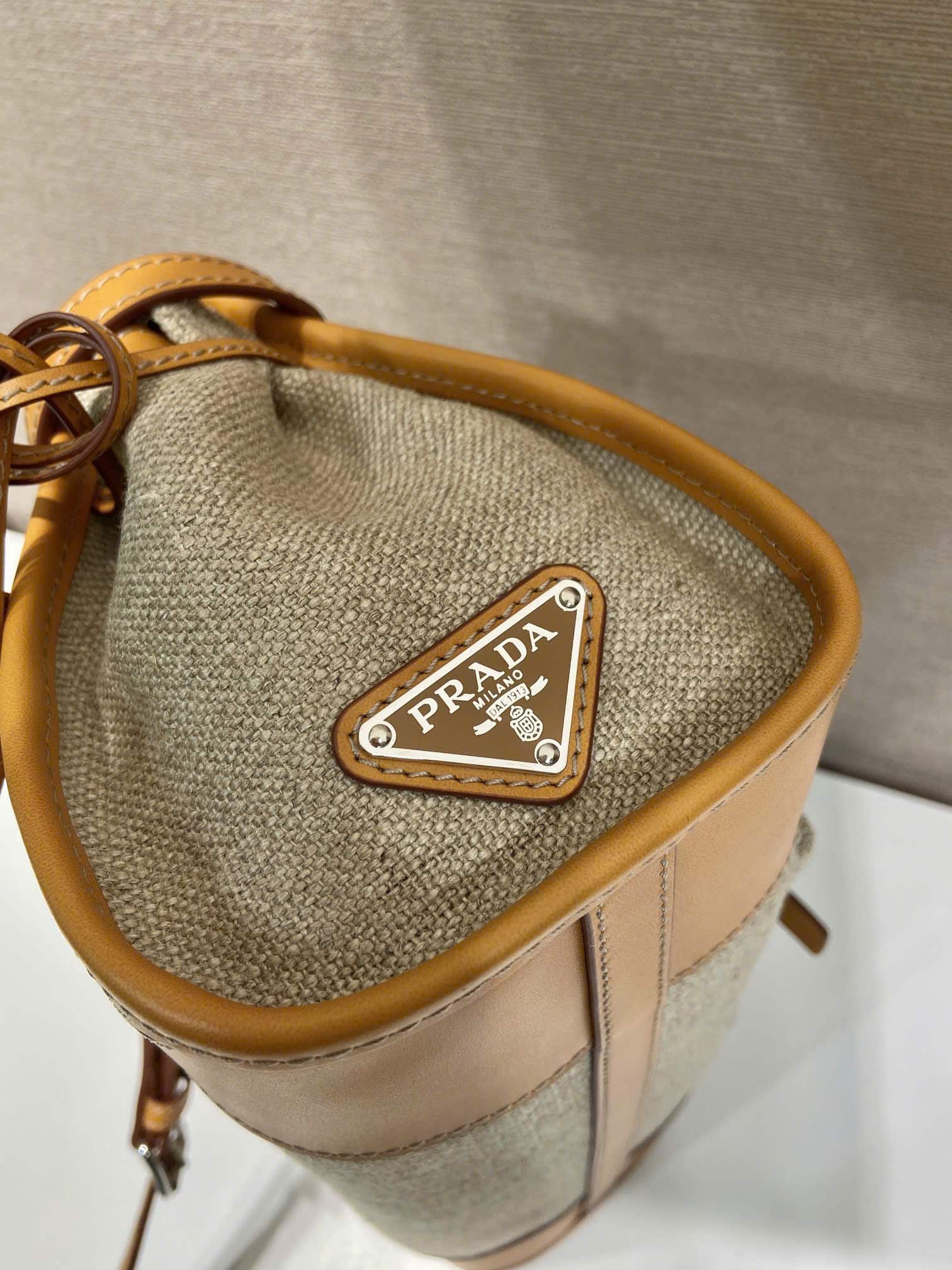 [프라다] 보니 미디엄 린넨 및 가죽 핸드백 1BA426