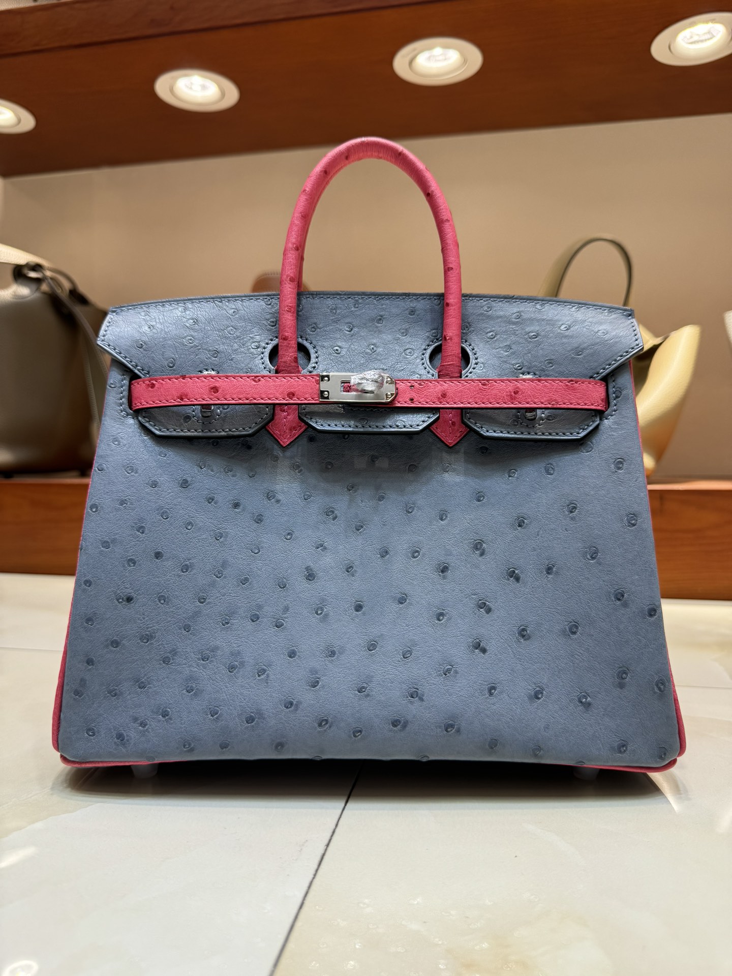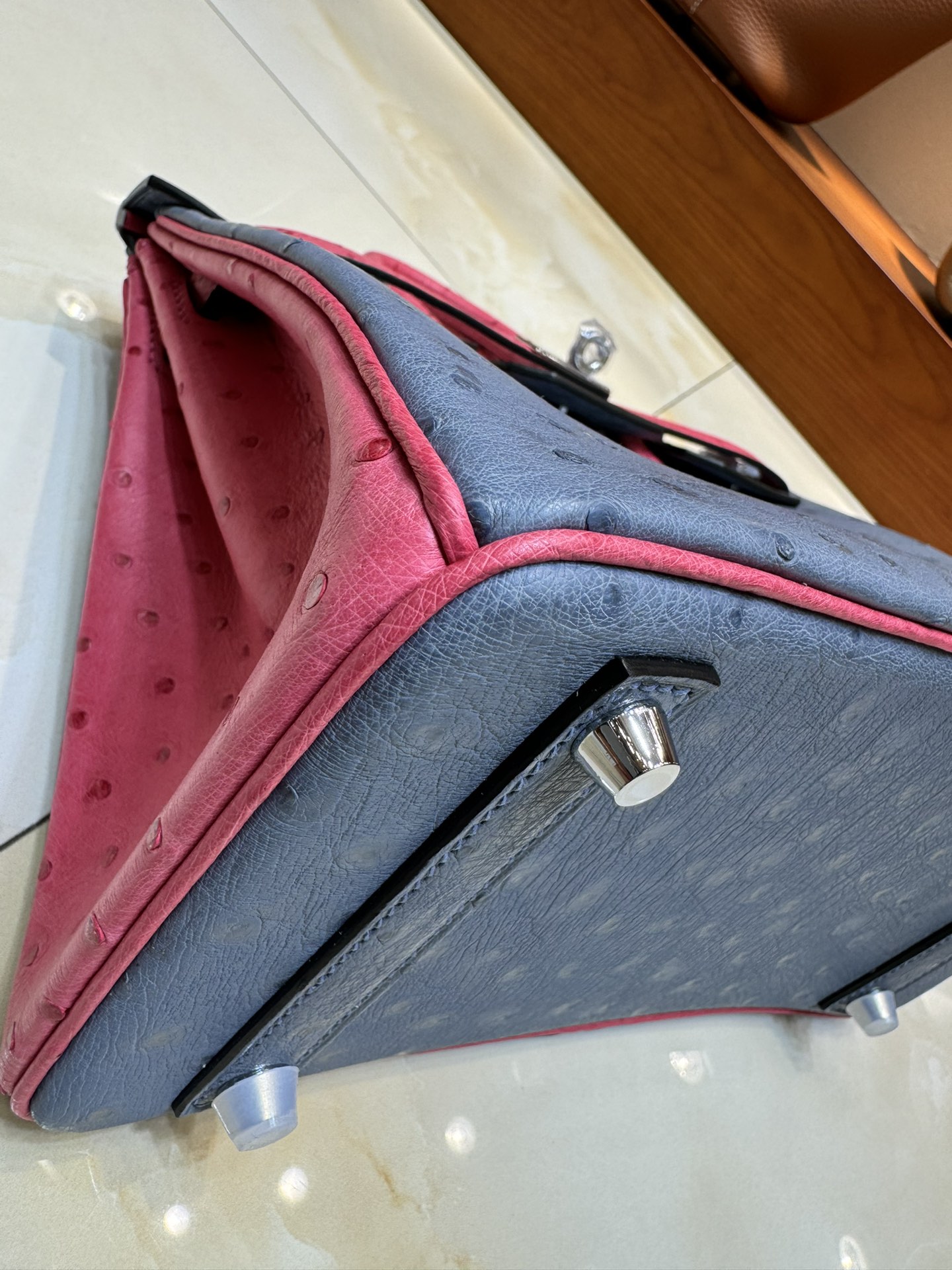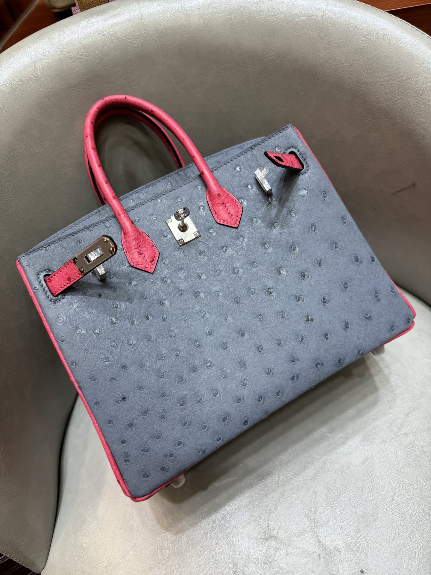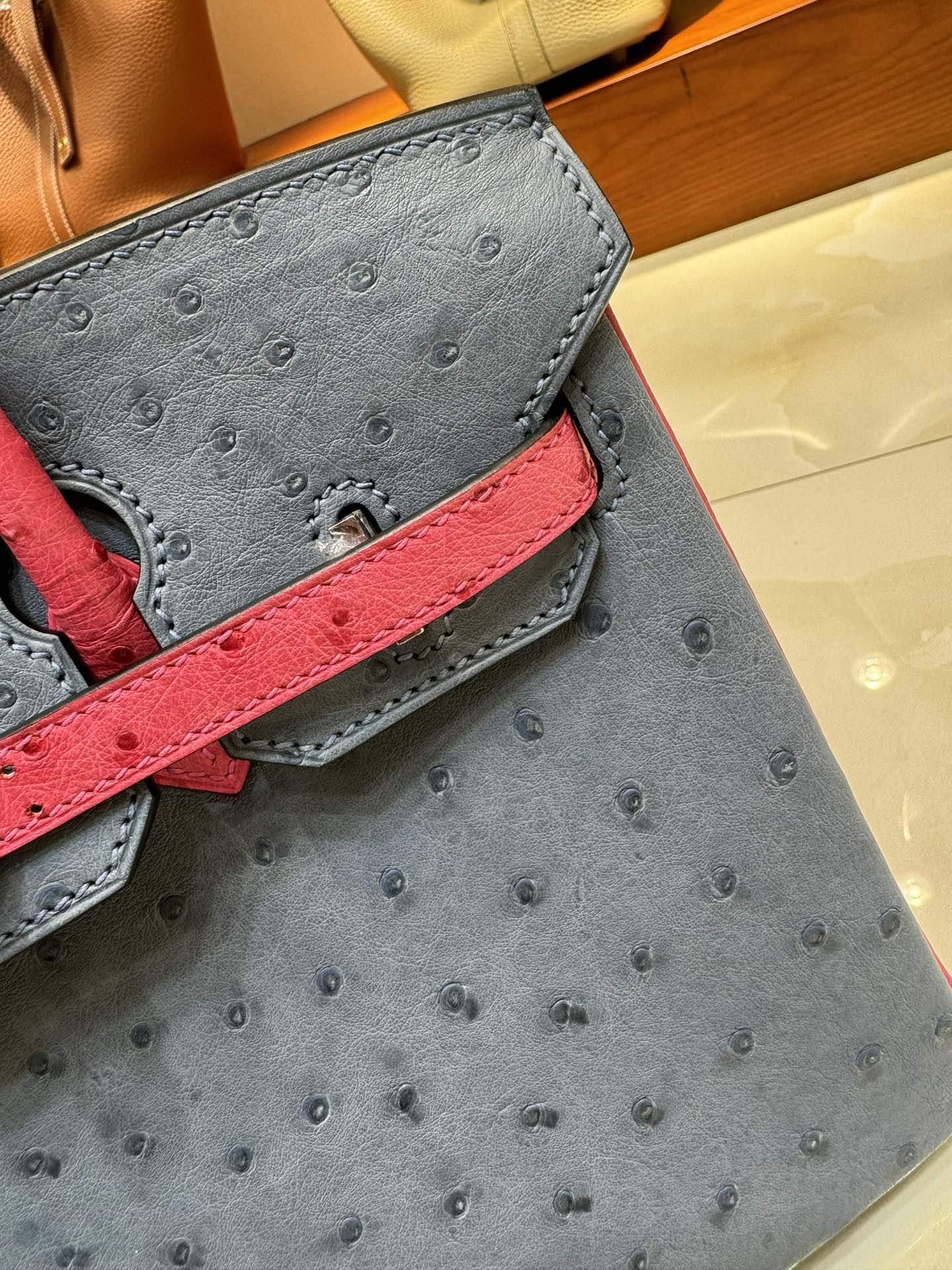 제품 이름: Birkin 사이즈: 25*20*13 가죽 종류: Ostrich 색상: Bleu Agate/Rose Tyrien