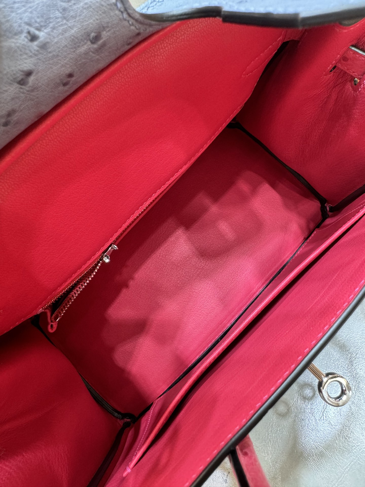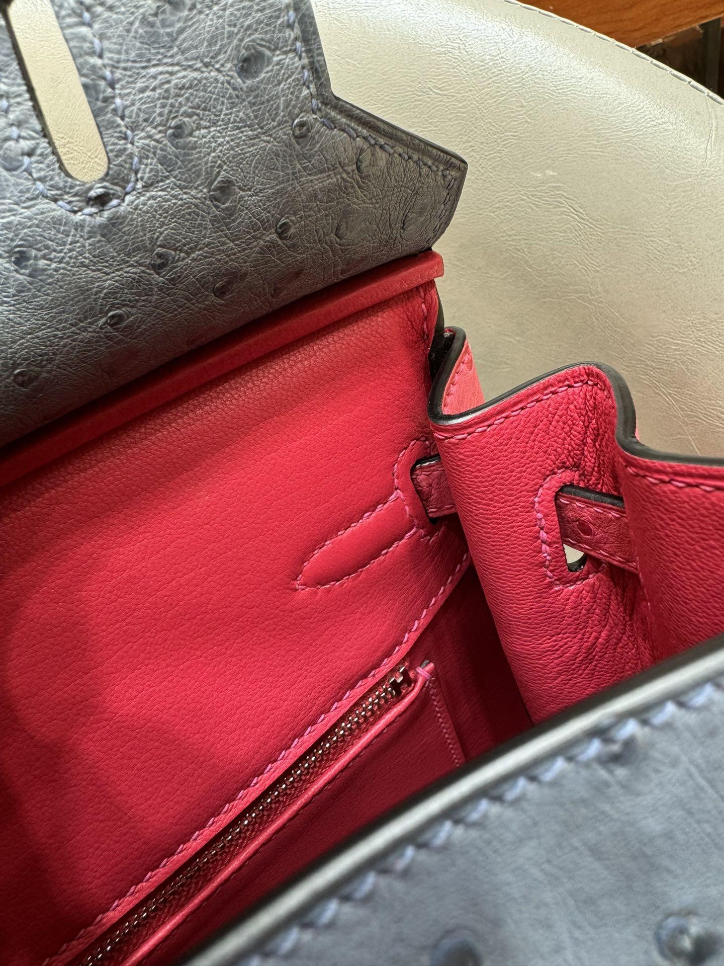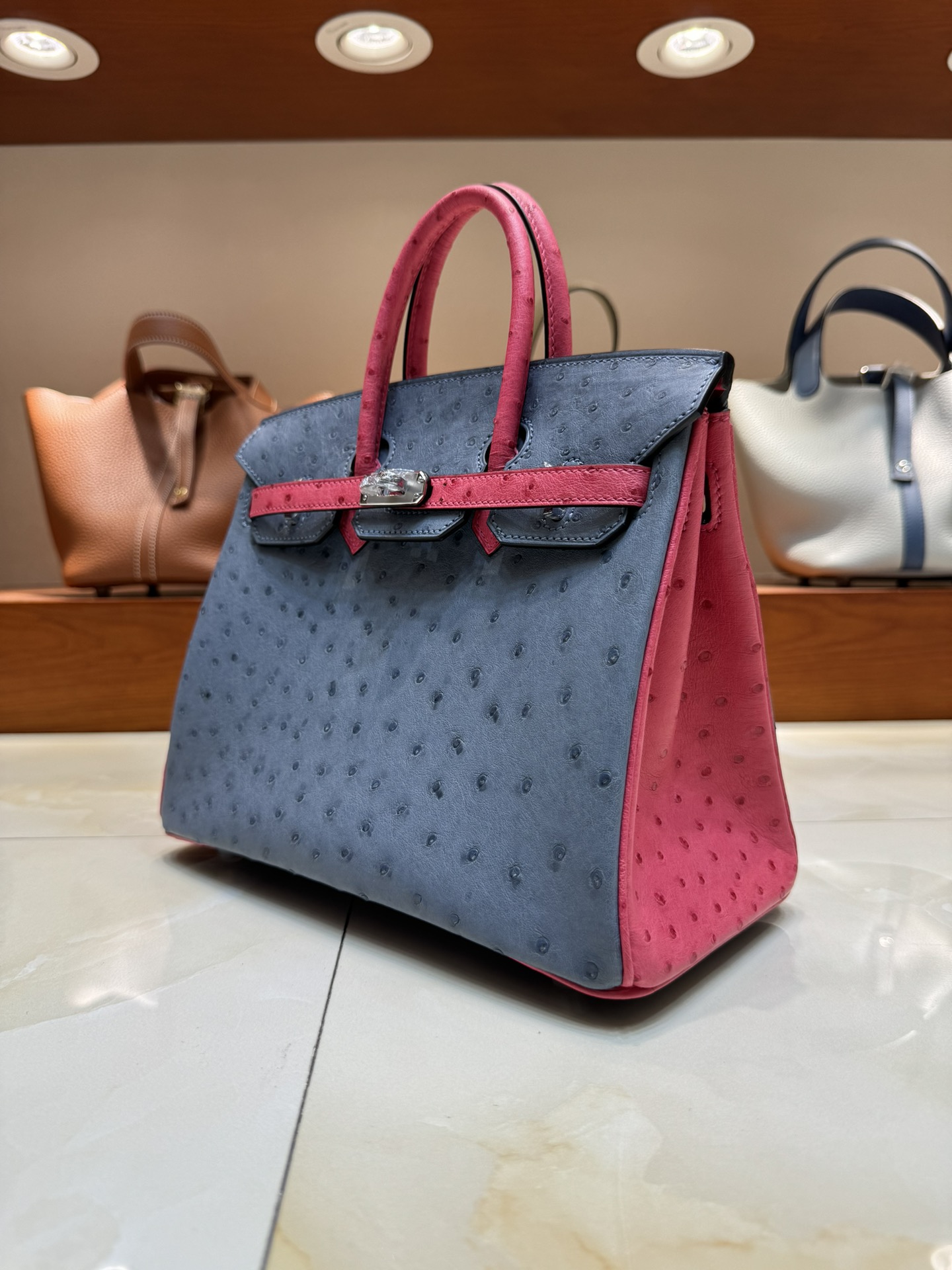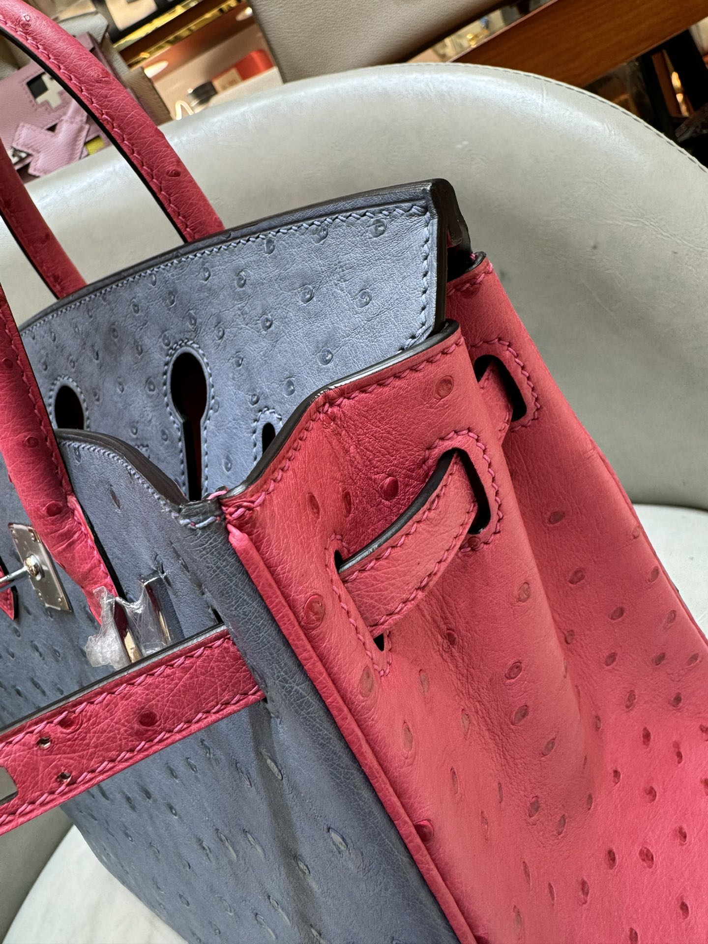 제품 이름: Birkin 사이즈: 25*20*13 가죽 종류: Ostrich 색상: Bleu Agate/Rose Tyrien