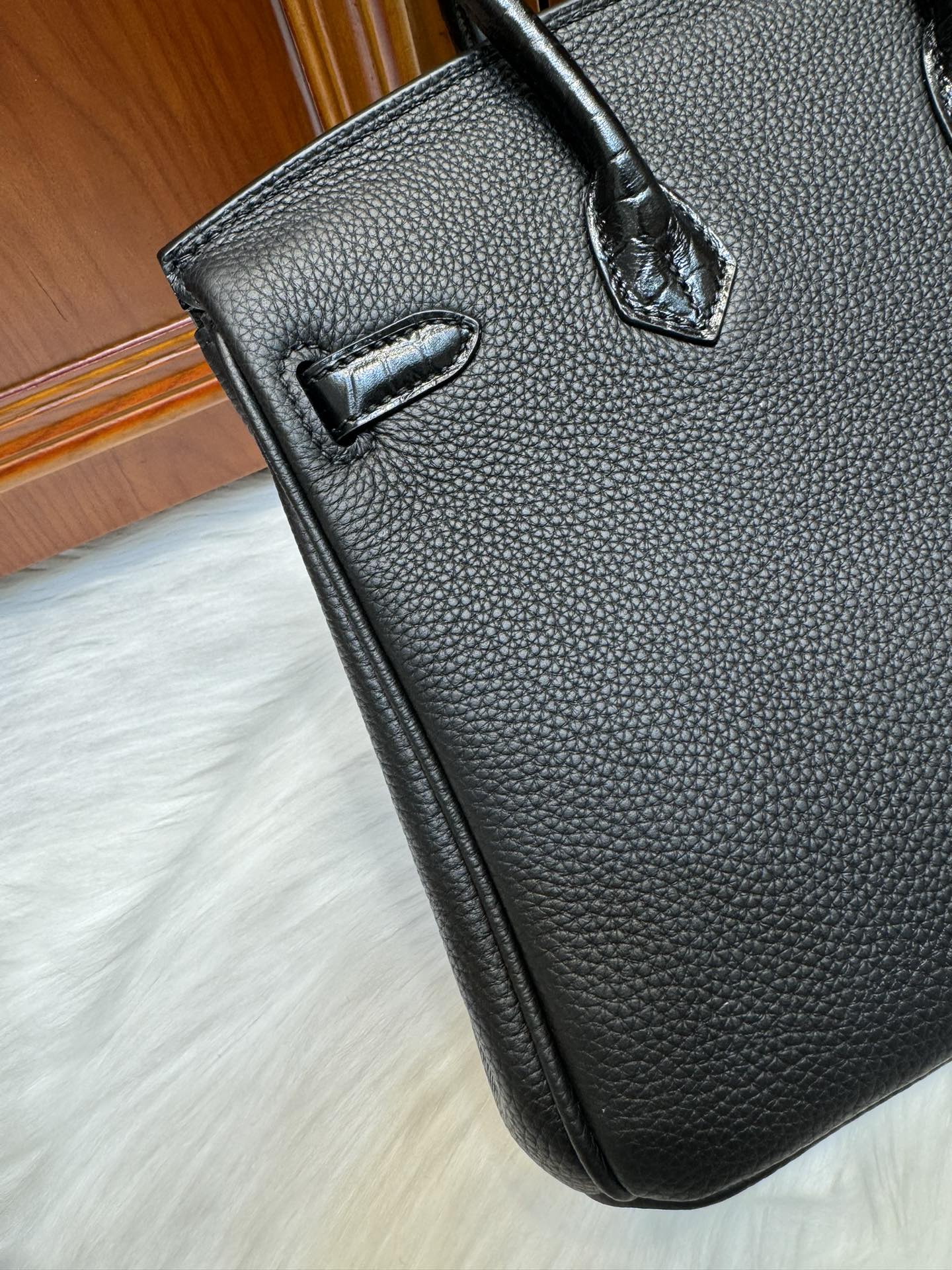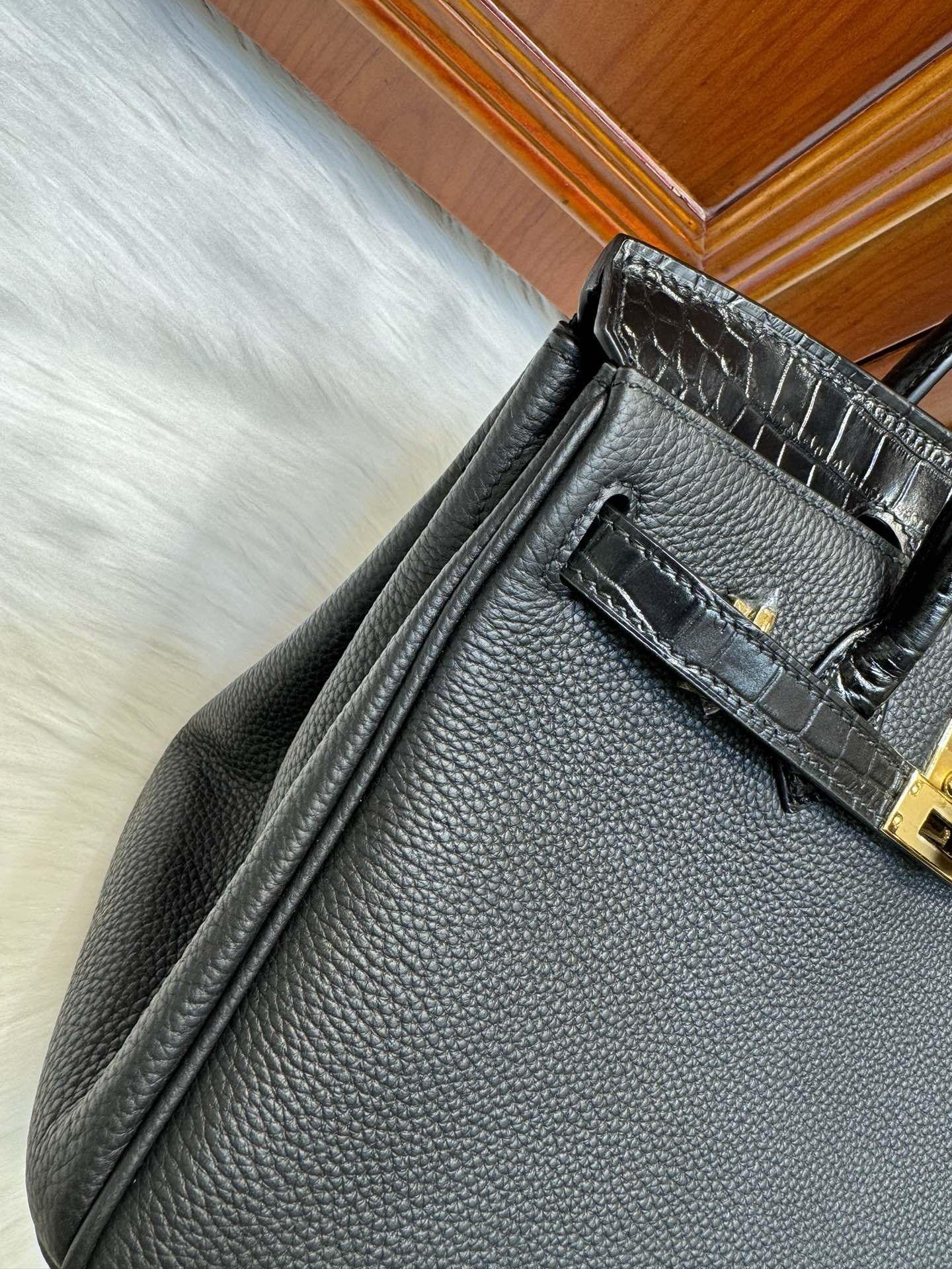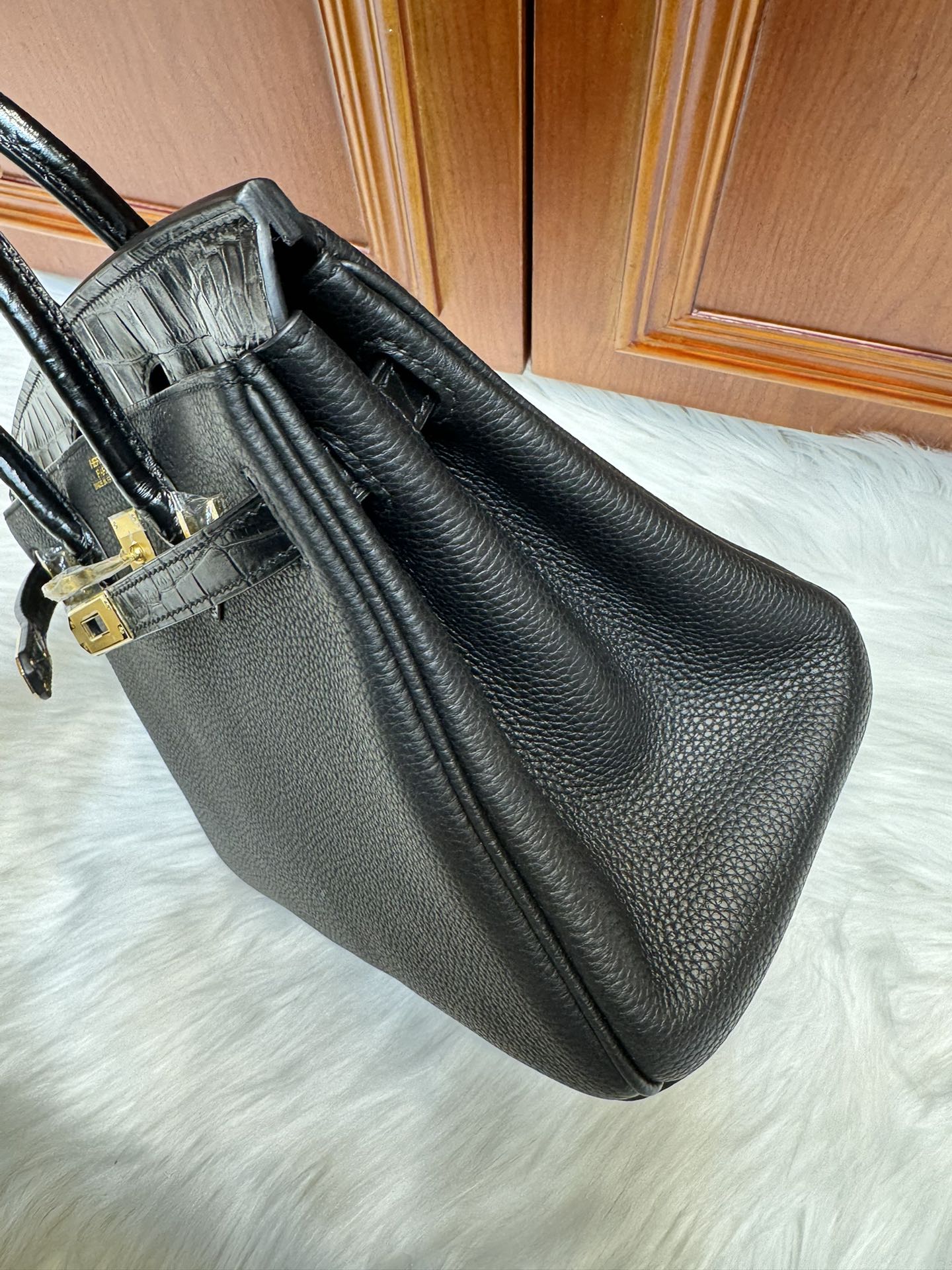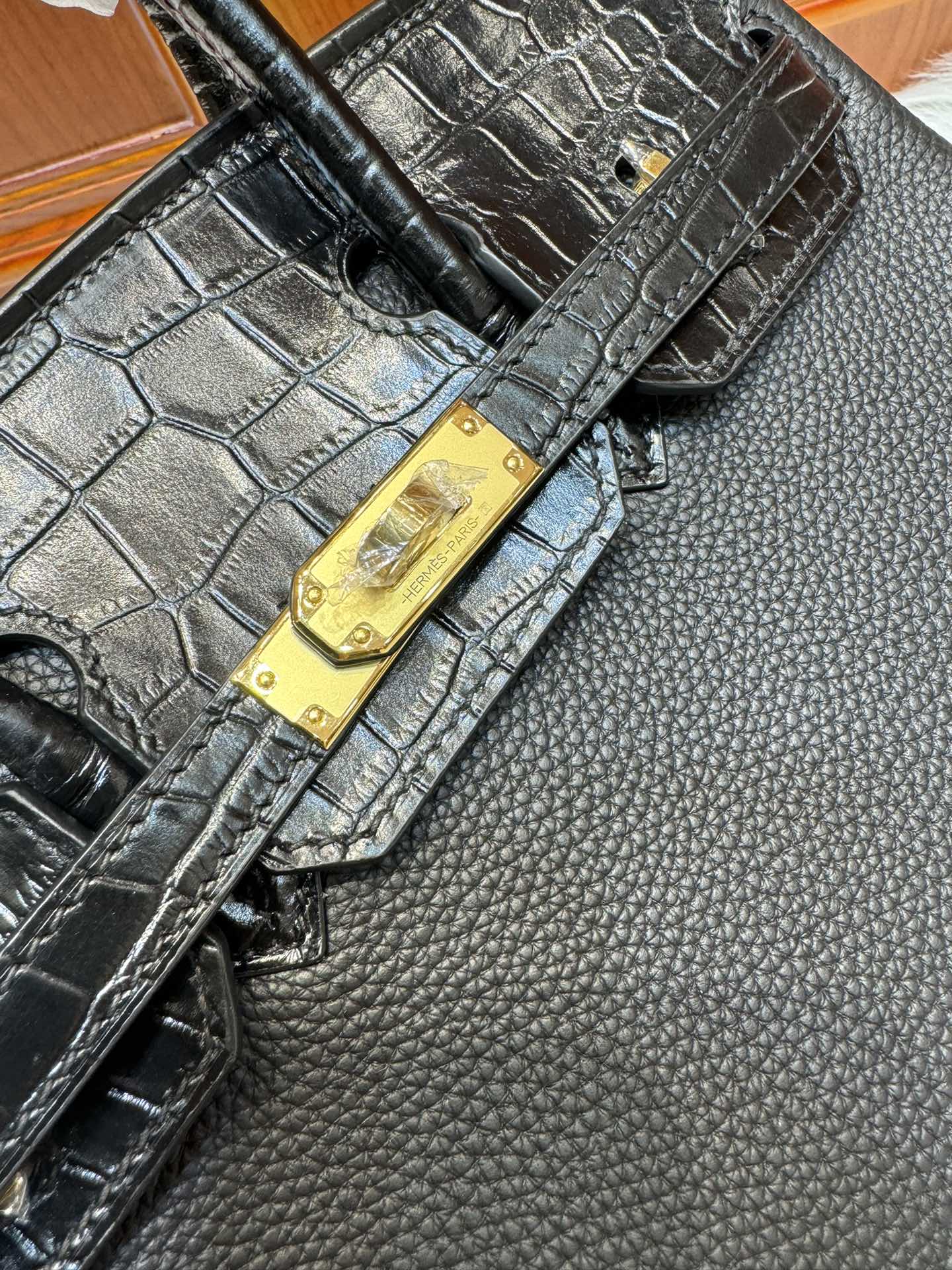 제품 이름: Birkin Touch 사이즈: 25*20*13 가죽 종류: Togo/ Matt Alligator 색상: Noir – Gold