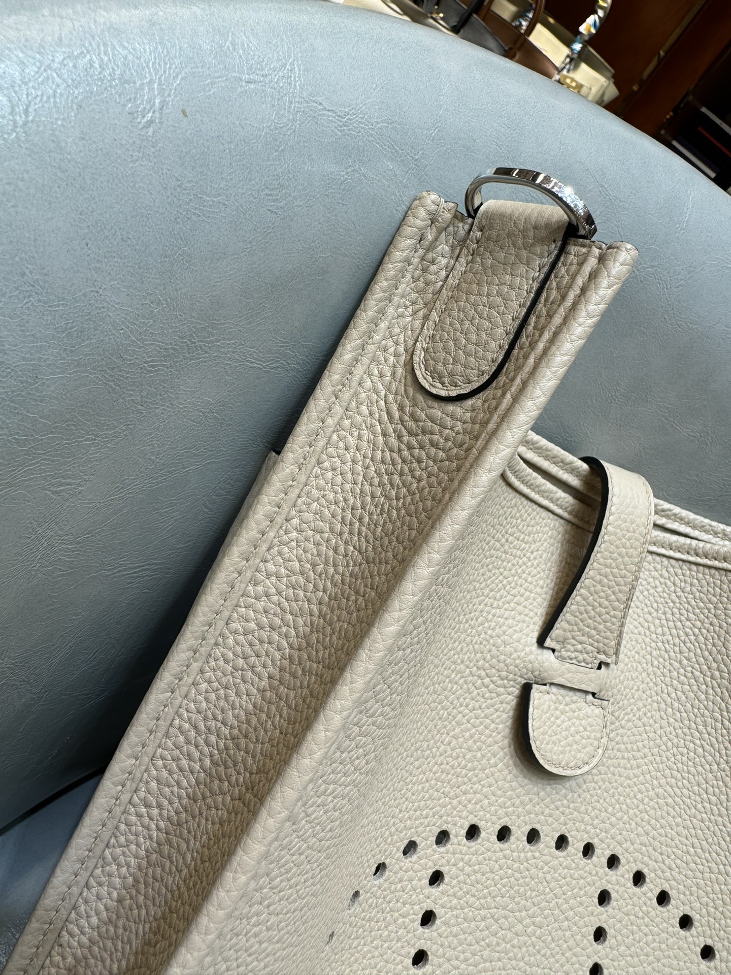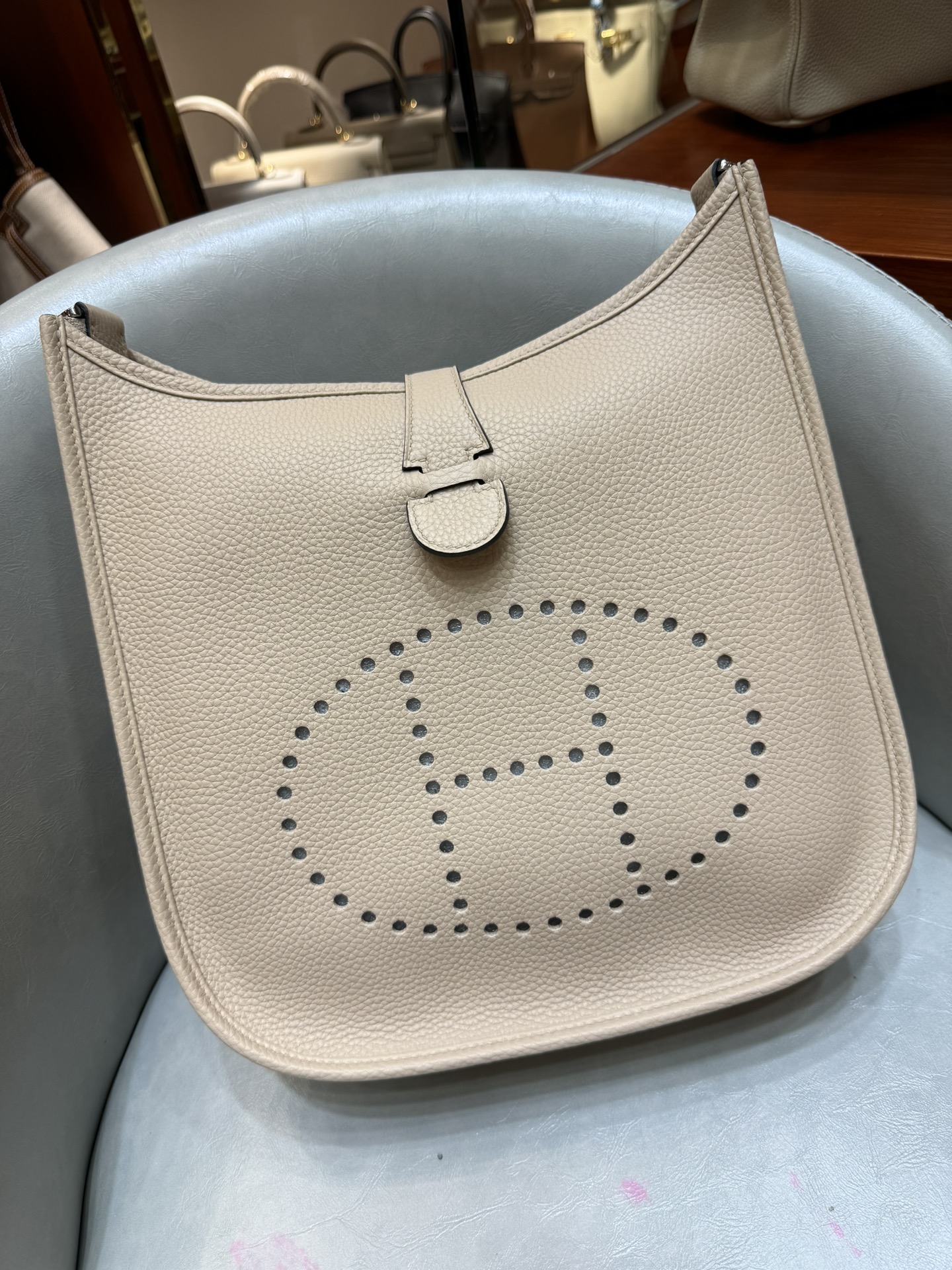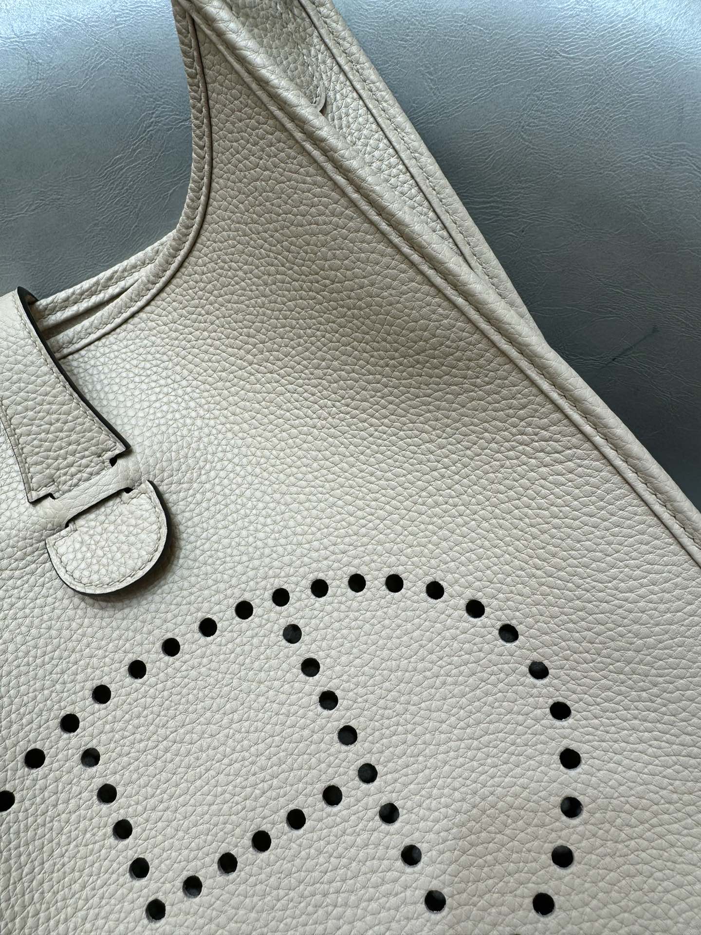 제품 이름: Evelyne 사이즈: 29*30*8 가죽 종류: Clemence 색상: Gris Trench