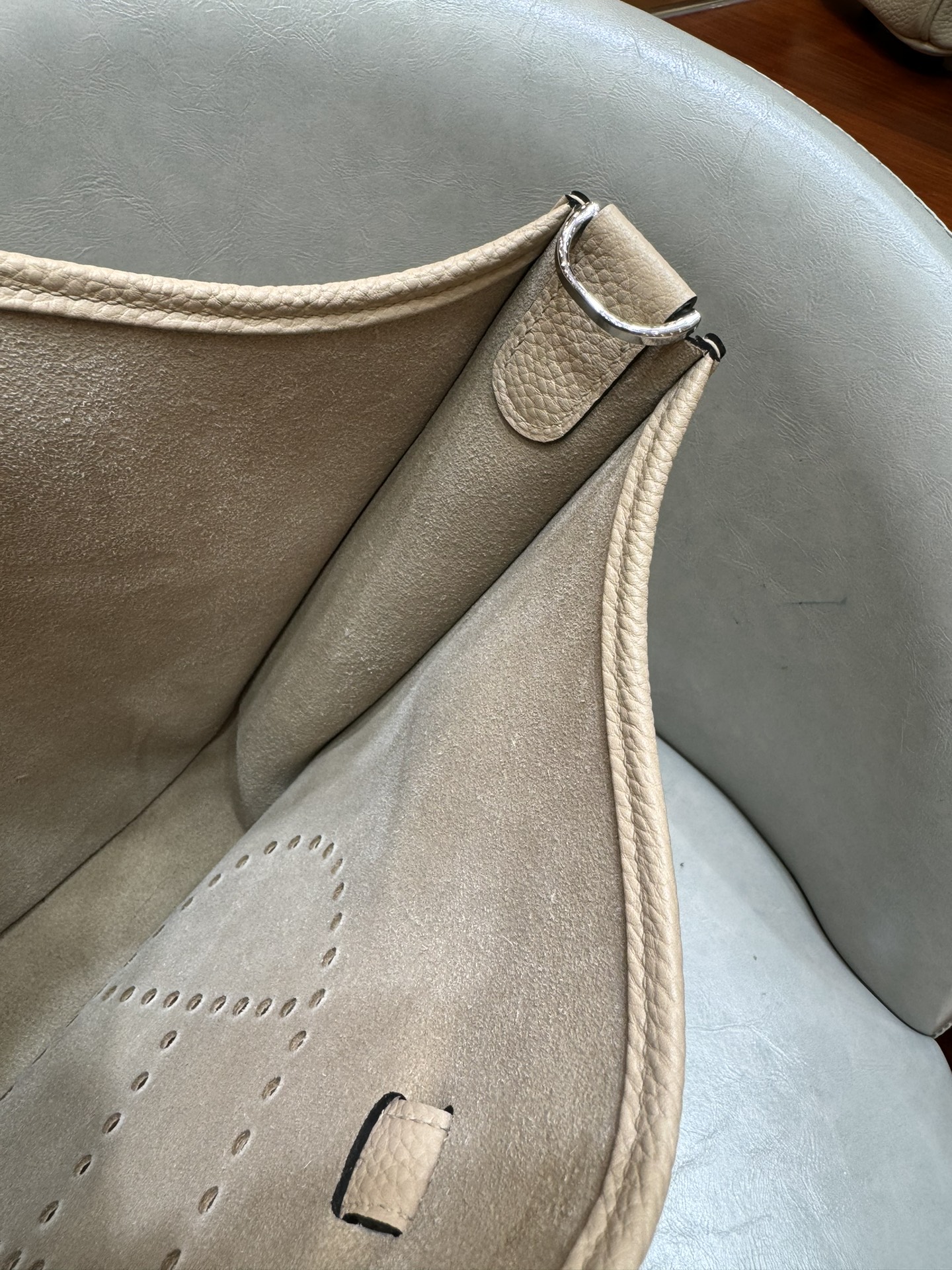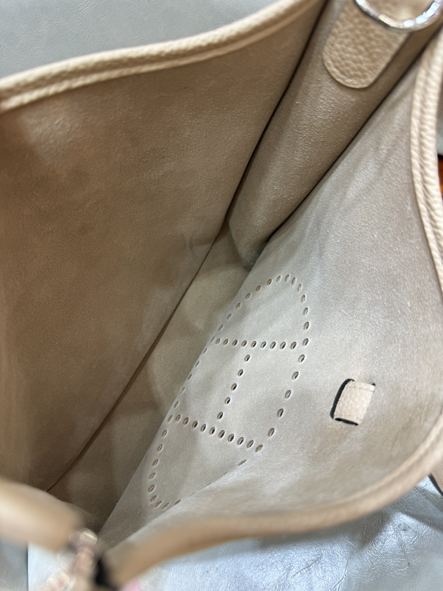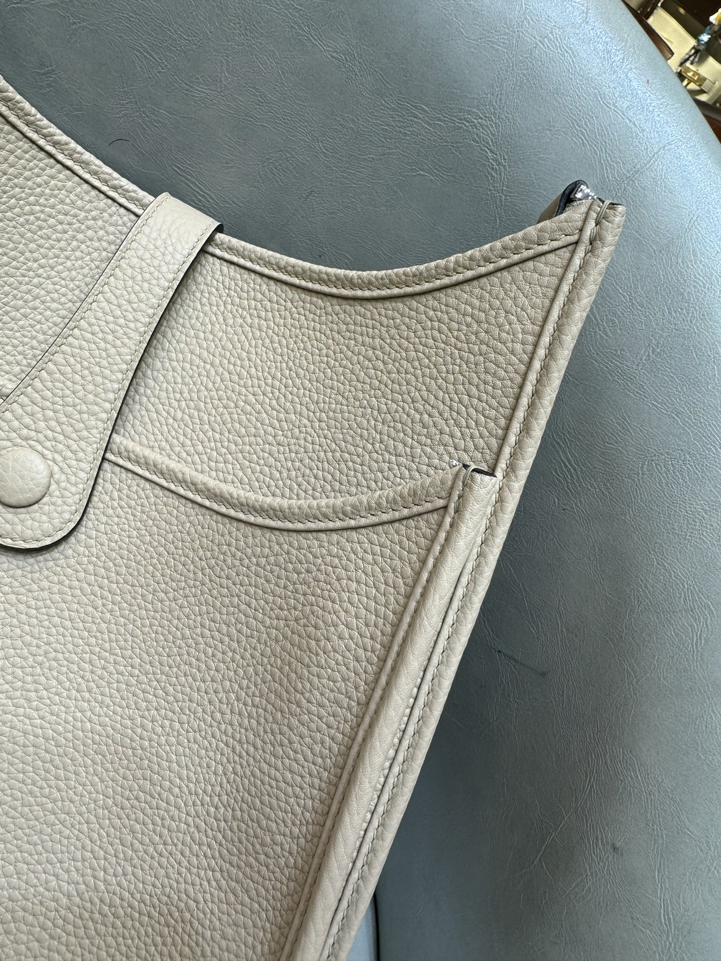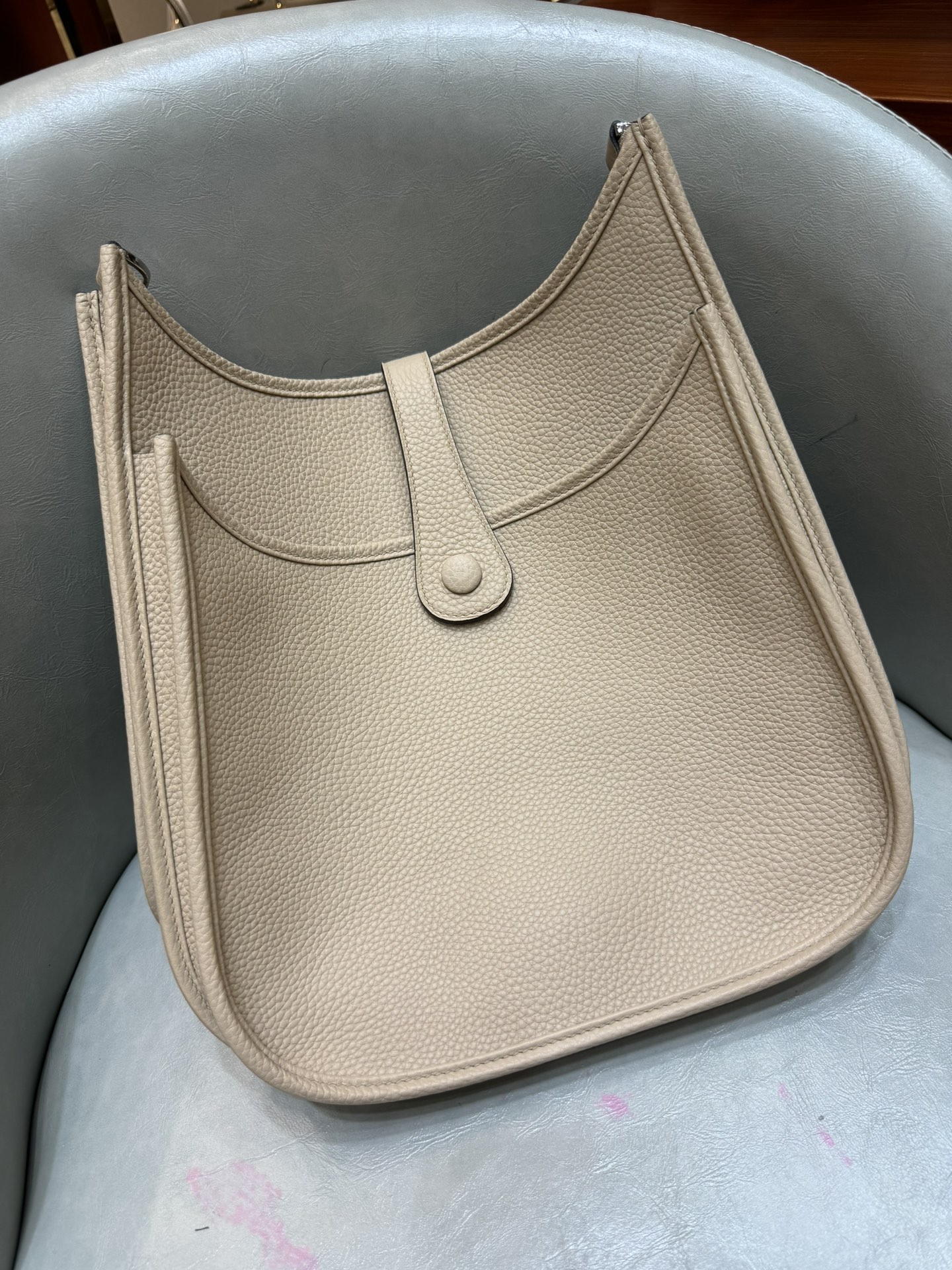 제품 이름: Evelyne 사이즈: 29*30*8 가죽 종류: Clemence 색상: Gris Trench