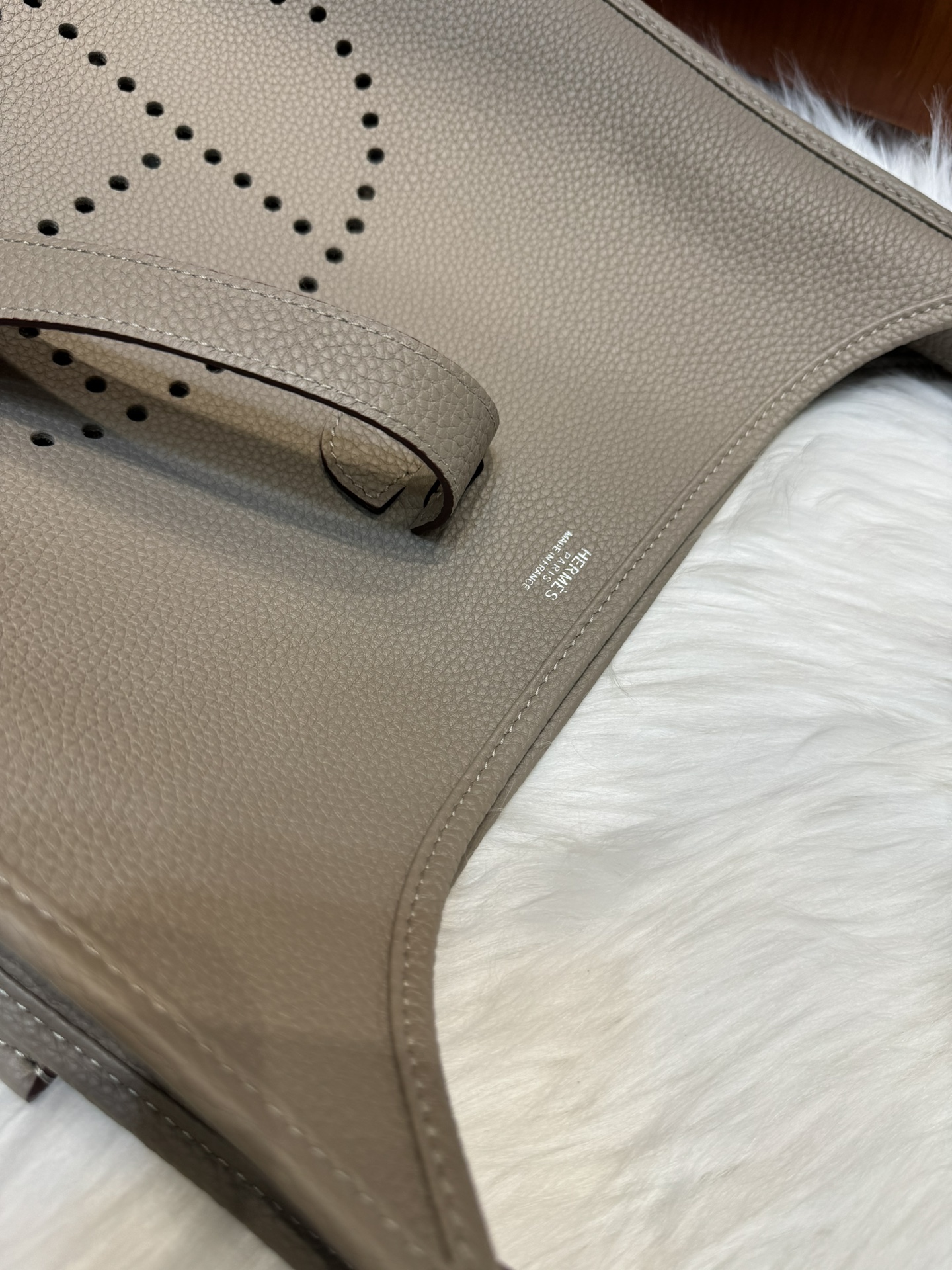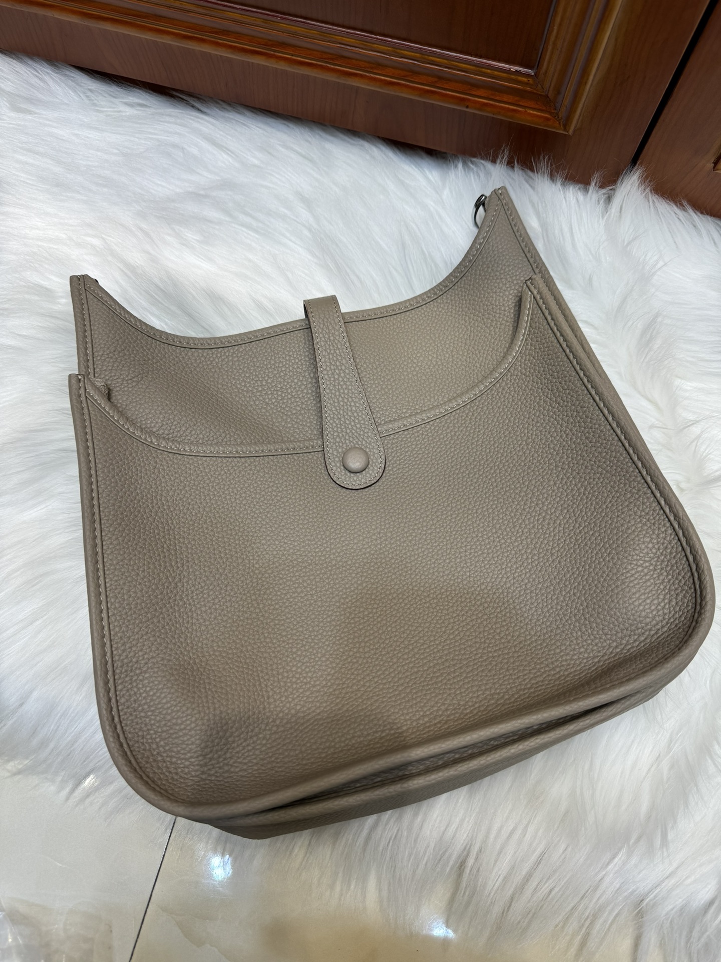 제품 이름: Evelyne 사이즈: 29*30*8 가죽 종류: Clemence 색상: Gris Tourterelle