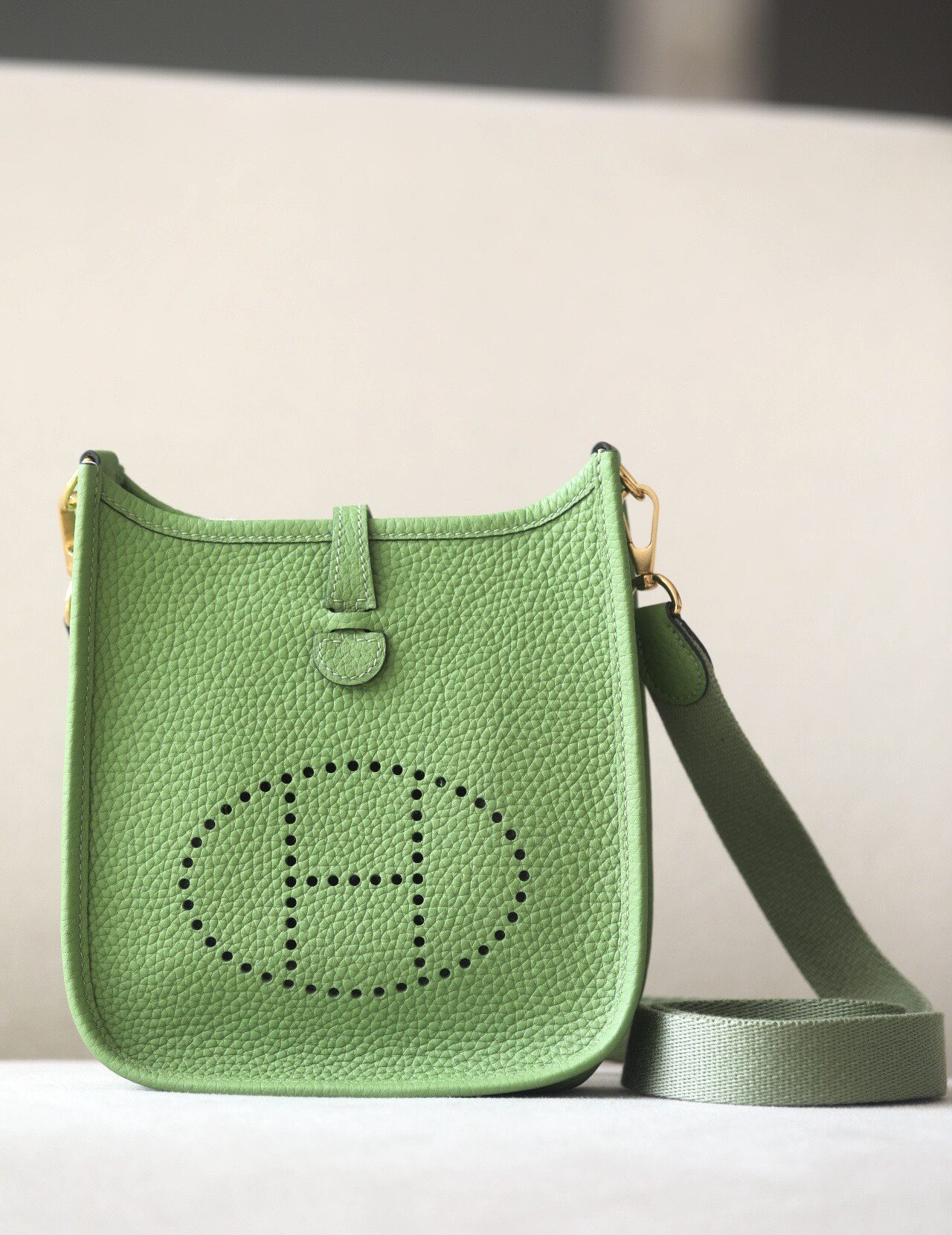 제품 이름: Evelyne mini 사이즈: 17*16*5.5 가죽 종류: Taurillon Clemence 색상: Vert Criquet