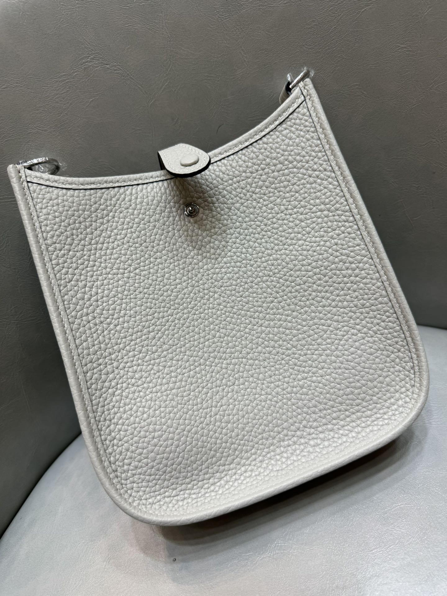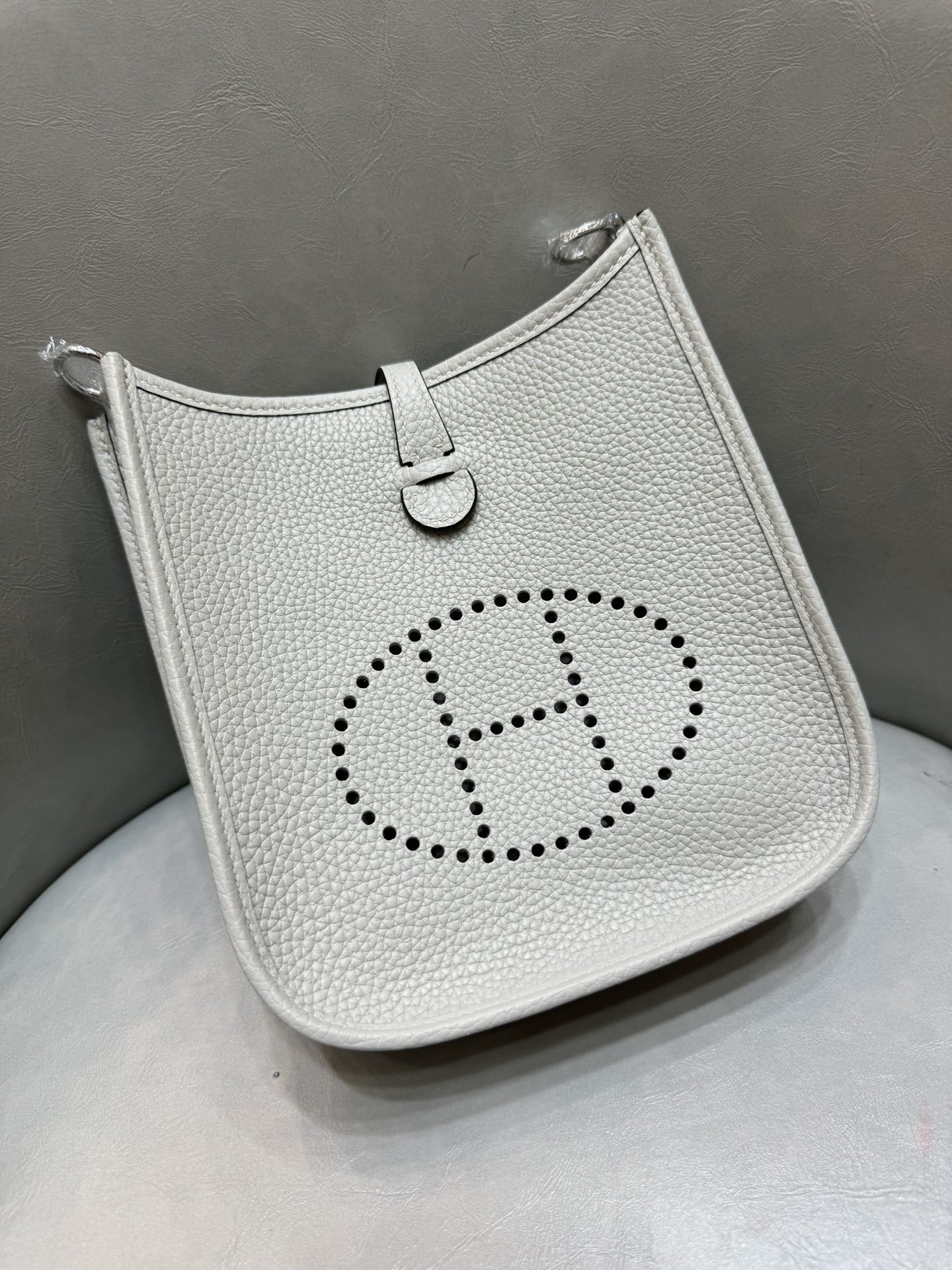 제품 이름: Evelyne mini 사이즈: 17*16*5.5 가죽 종류: Clemence 색상: Gris Perle