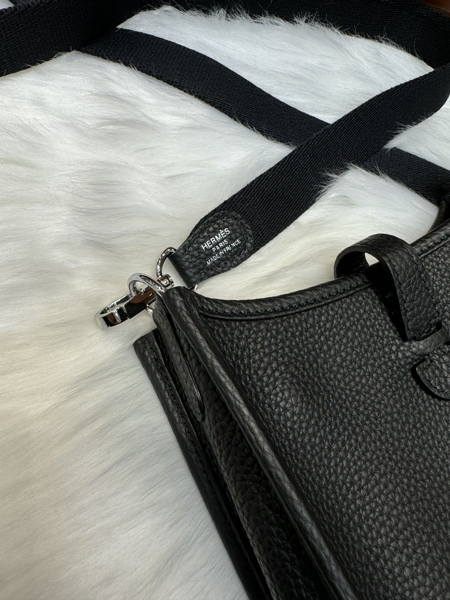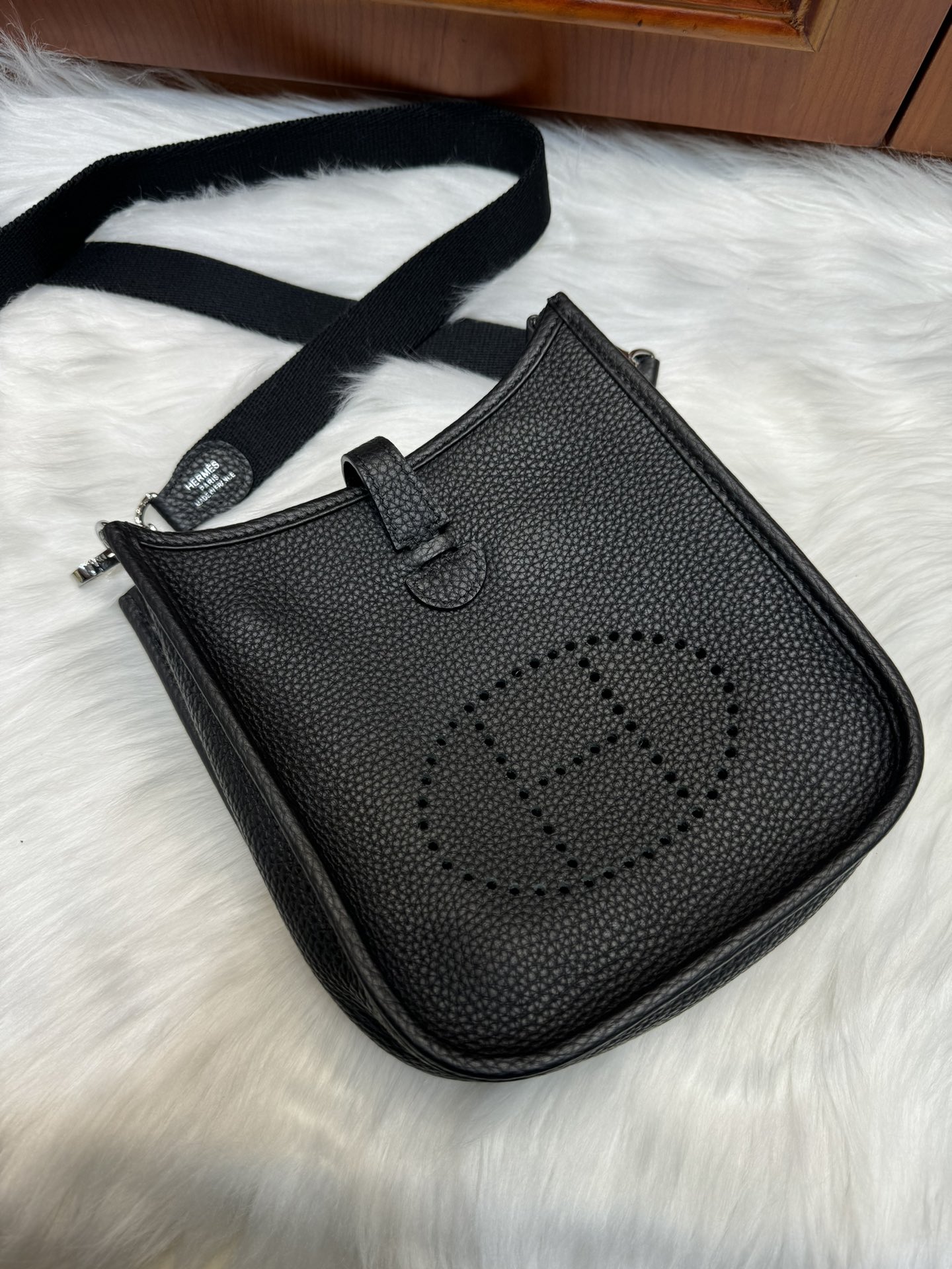 제품 이름: Evelyne mini 사이즈: 17*16*5.5 가죽 종류: Clemence 색상: Noir