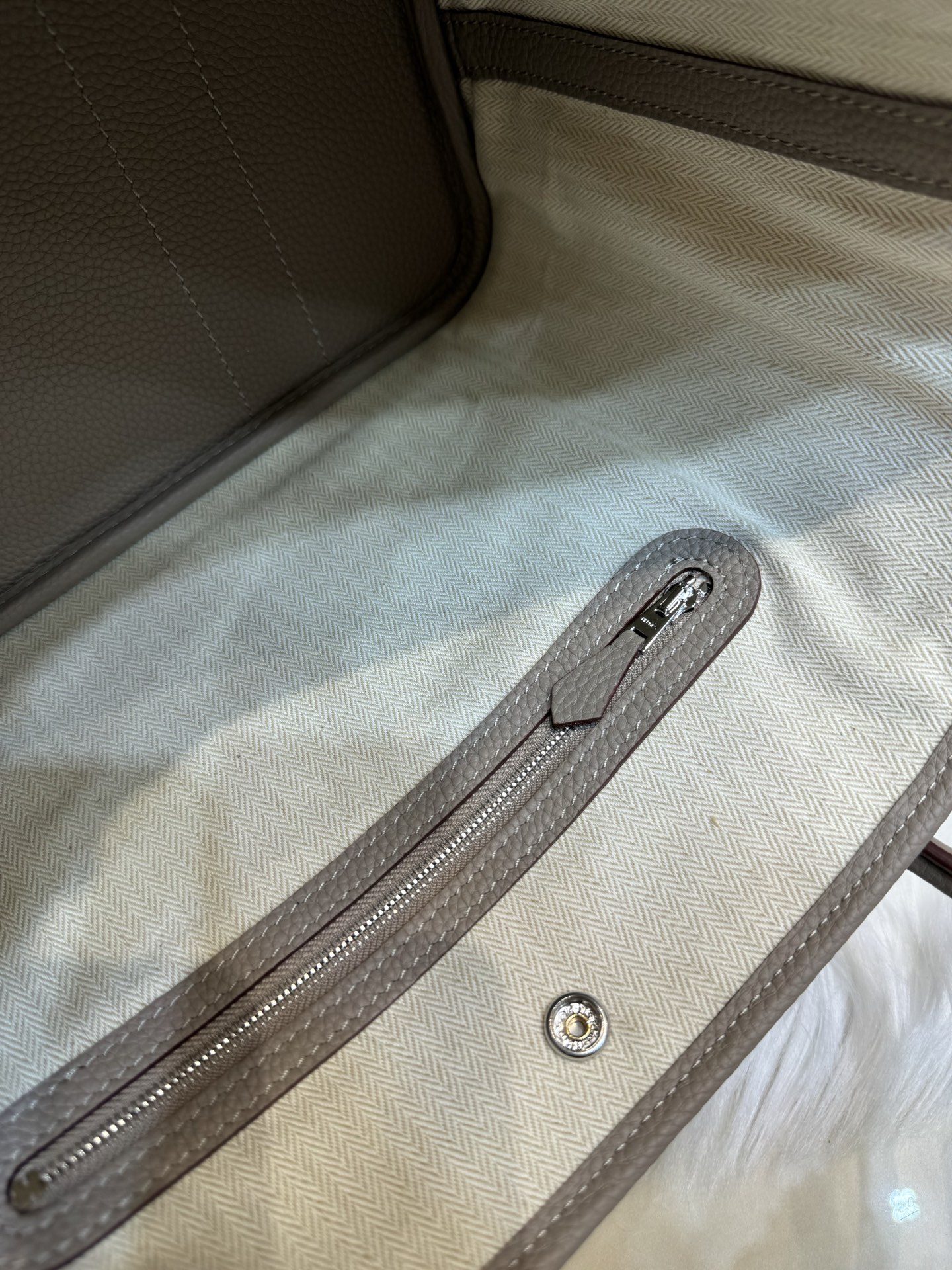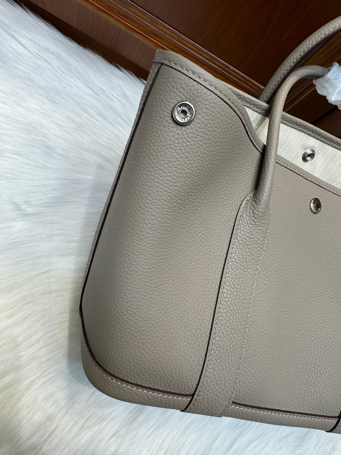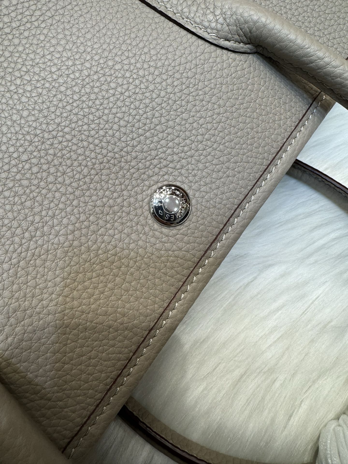 제품 이름: Garden Party 사이즈: 30*23*13 가죽 종류: Clemence 색상: Gris Tourterelle