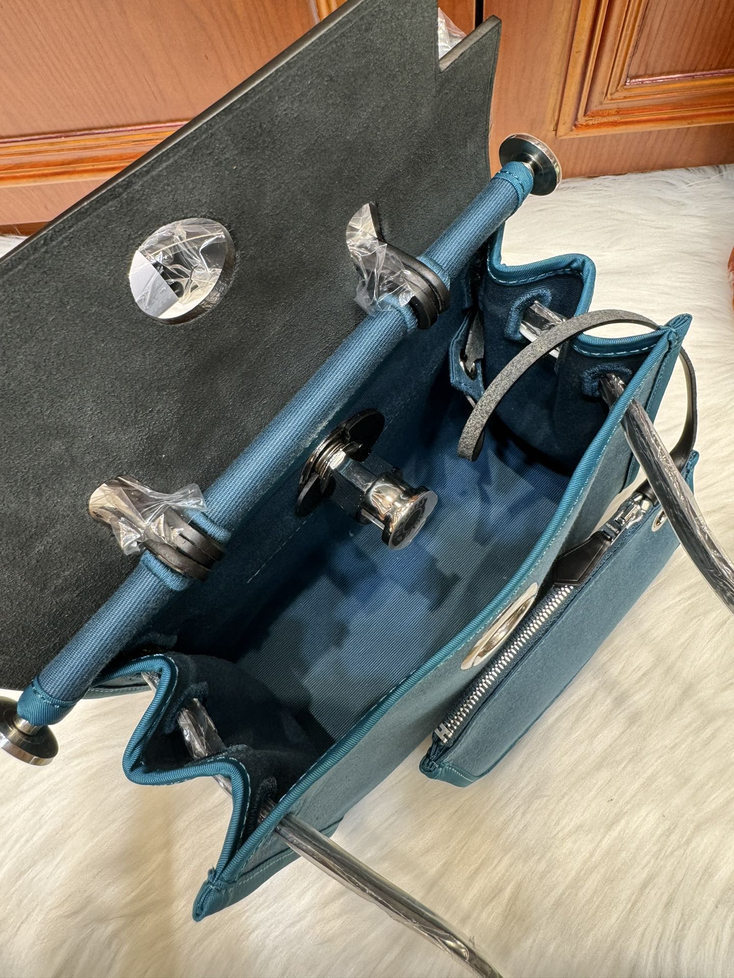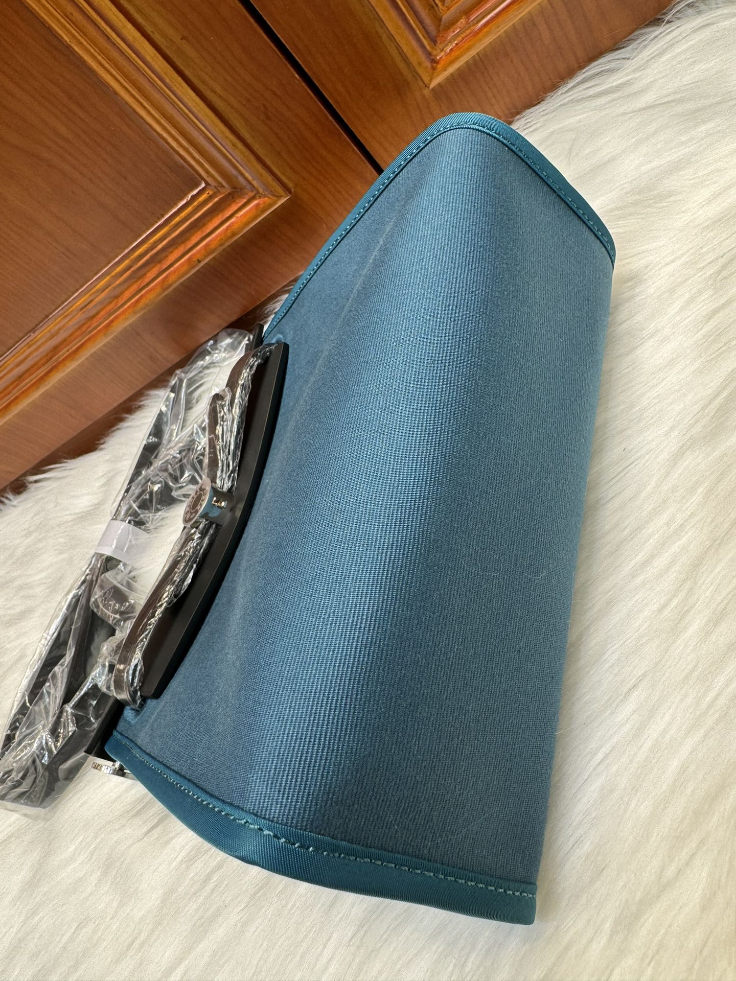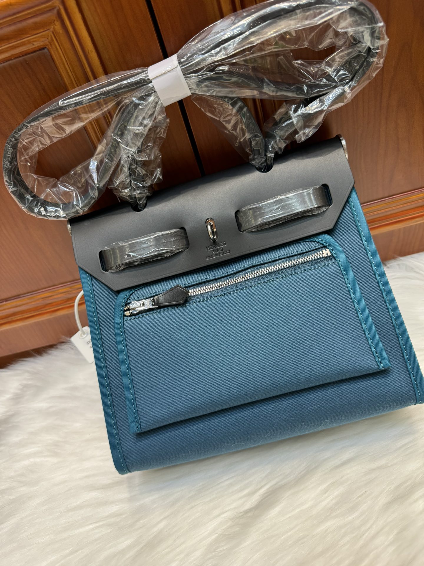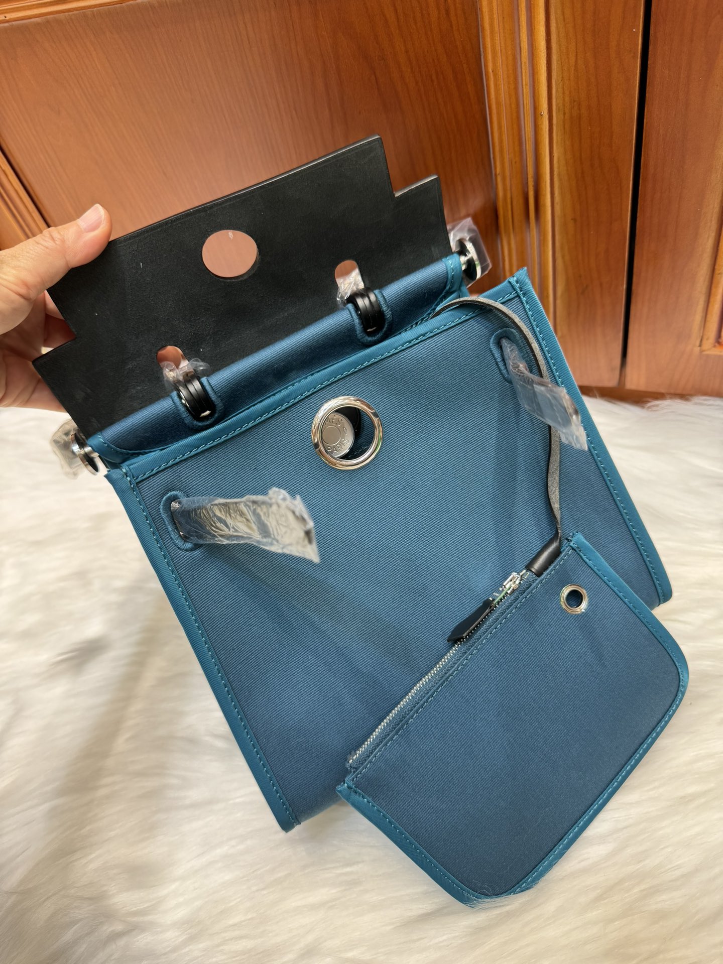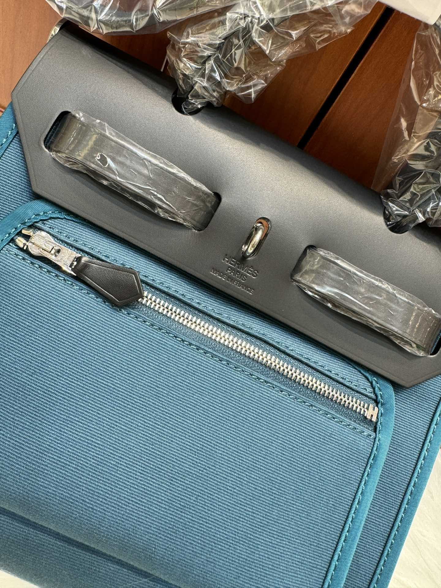 제품 이름: Herbag Zip Mini 사이즈: 20*17*7cm 가죽 종류: Vache Hunter & Toile 색상: New Blue Jean & Noir/ Silver
