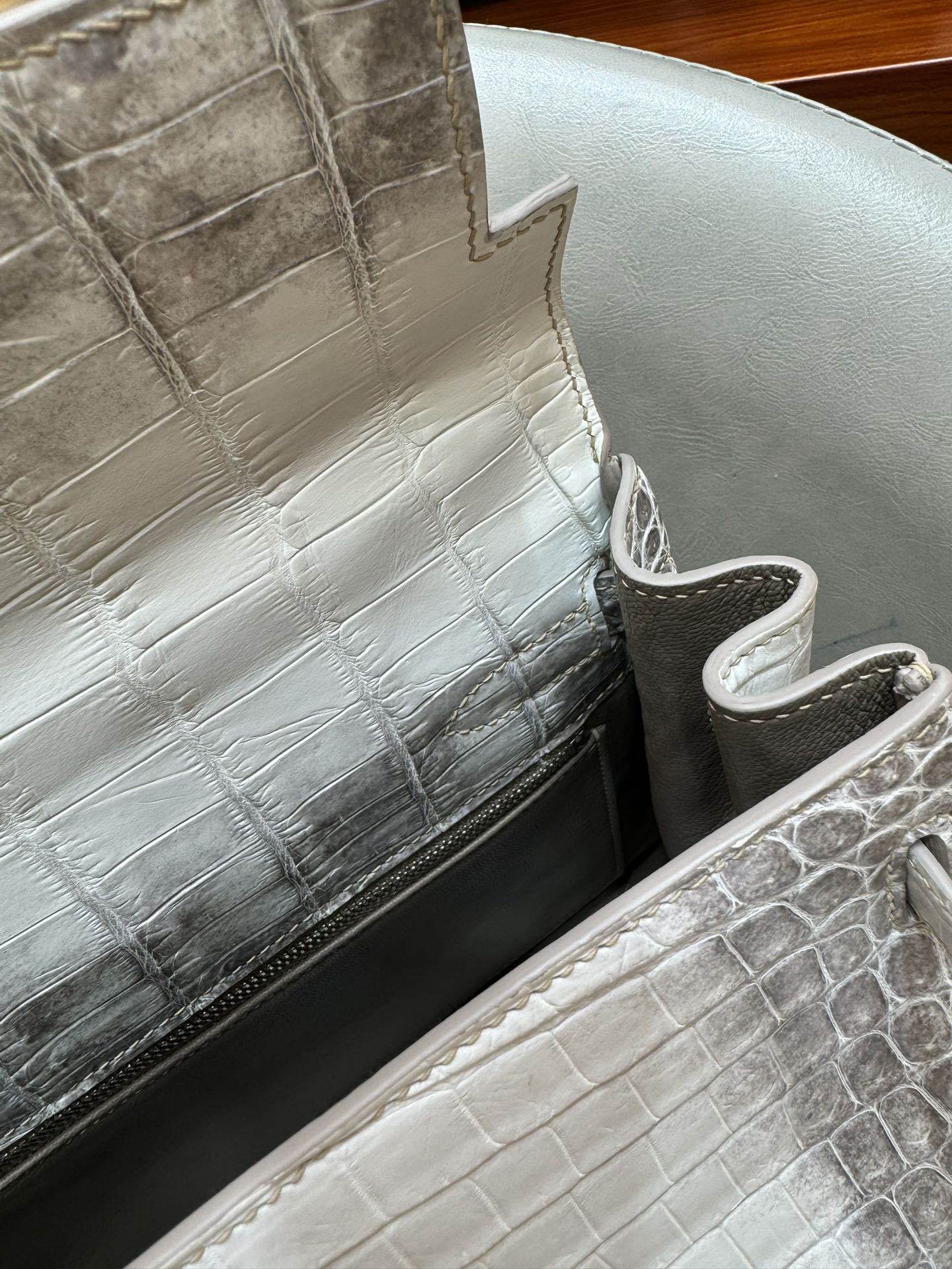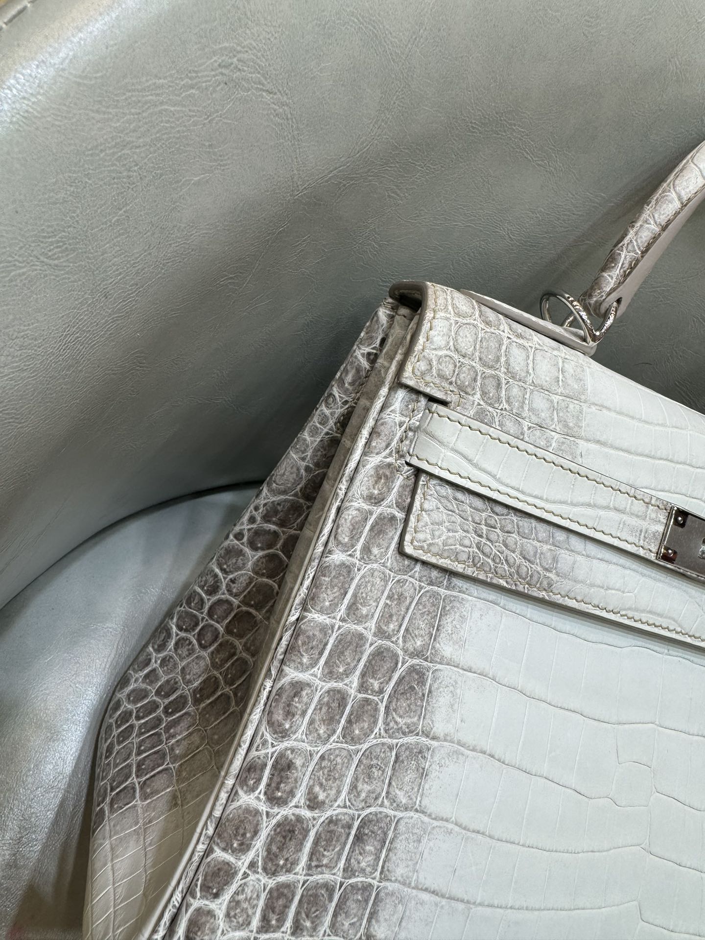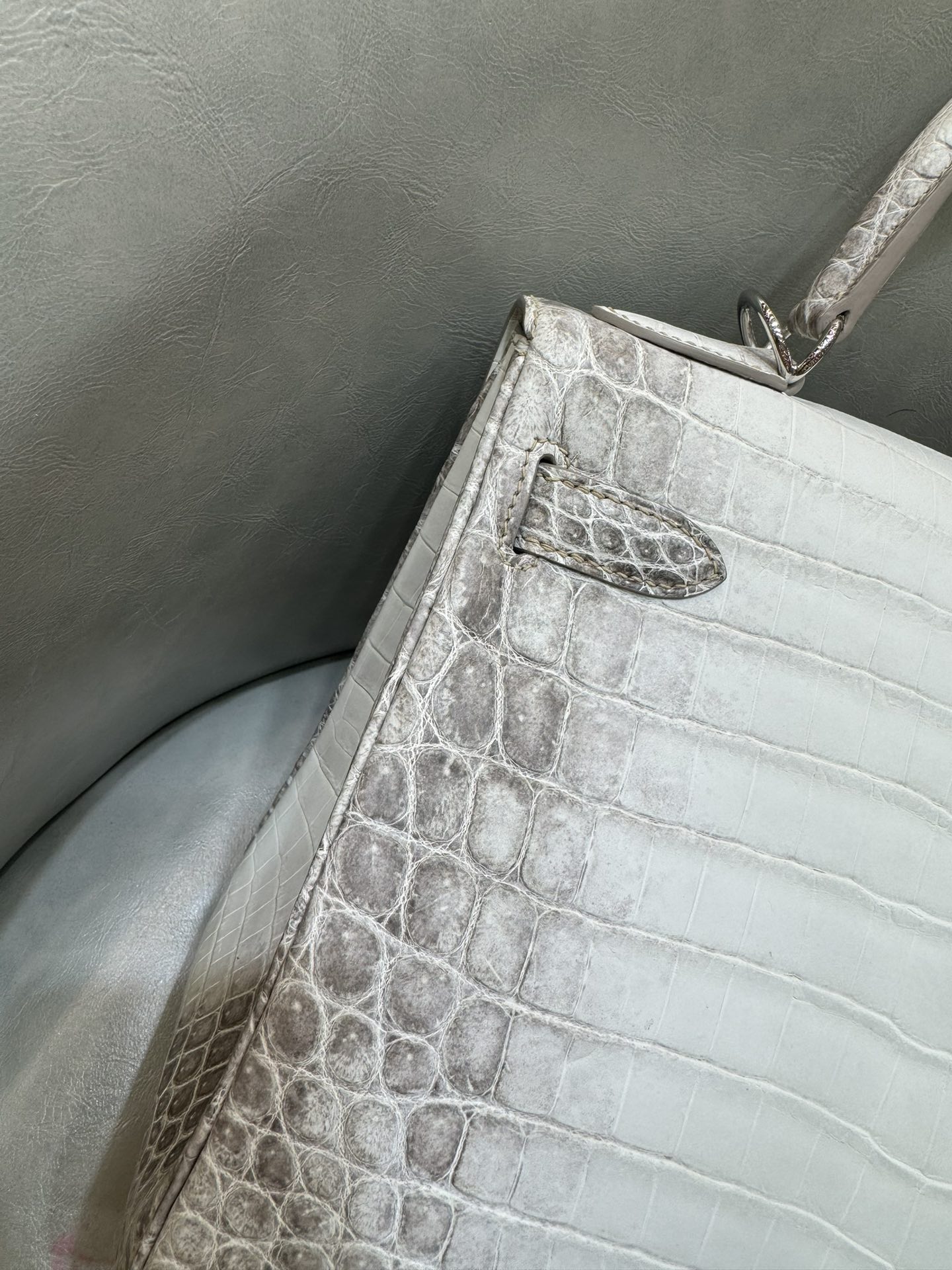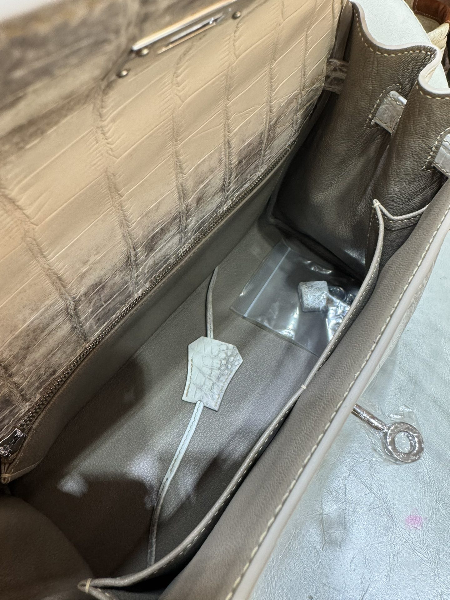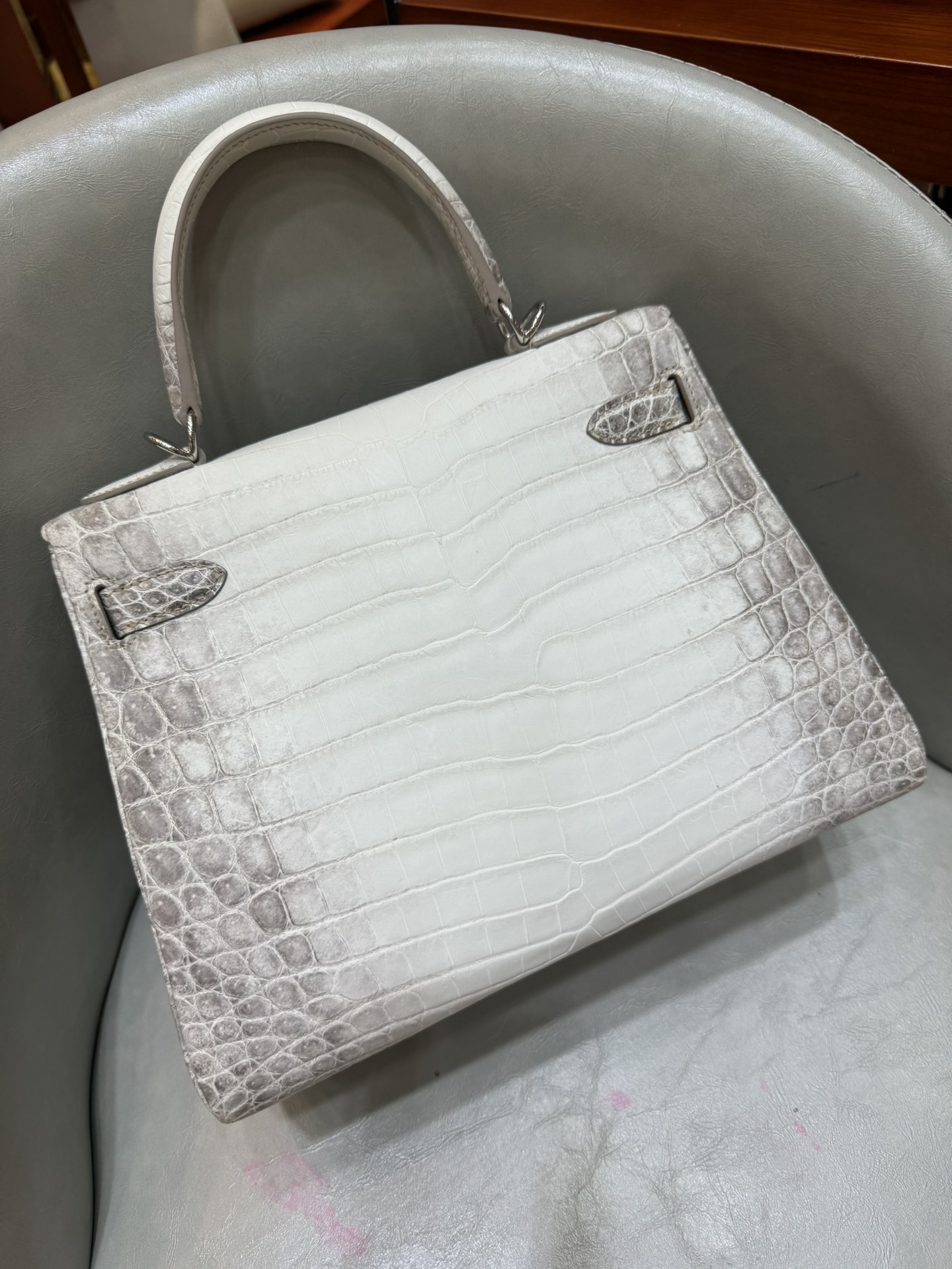 제품 이름: Kelly 사이즈: 28*16*4 가죽 종류: Niloticus Crocodile 색상: Himalayan Blanc