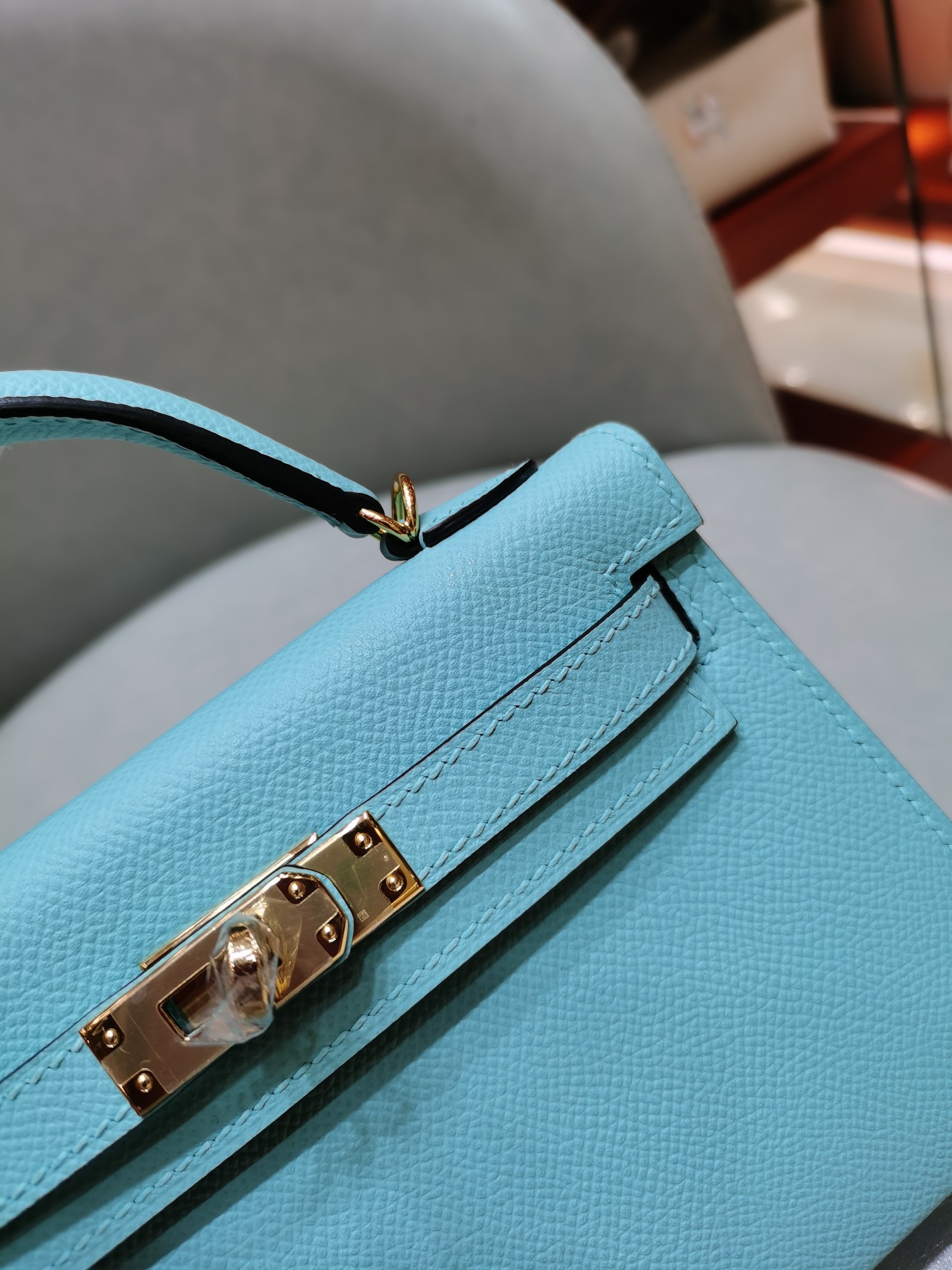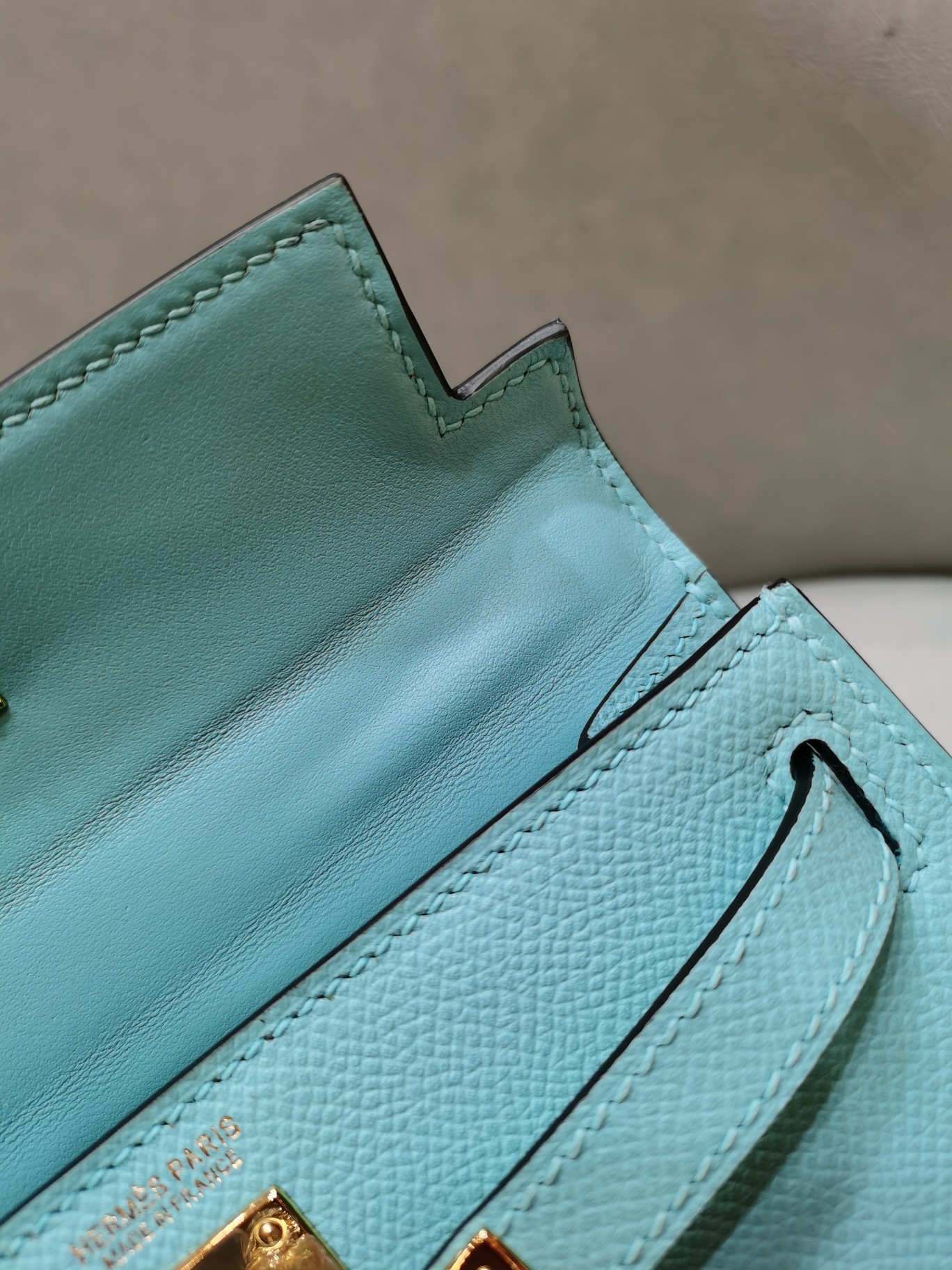 제품 이름: Kelly 사이즈: 19*14*6 가죽 종류: Epsom 색상: Bleu Macaron