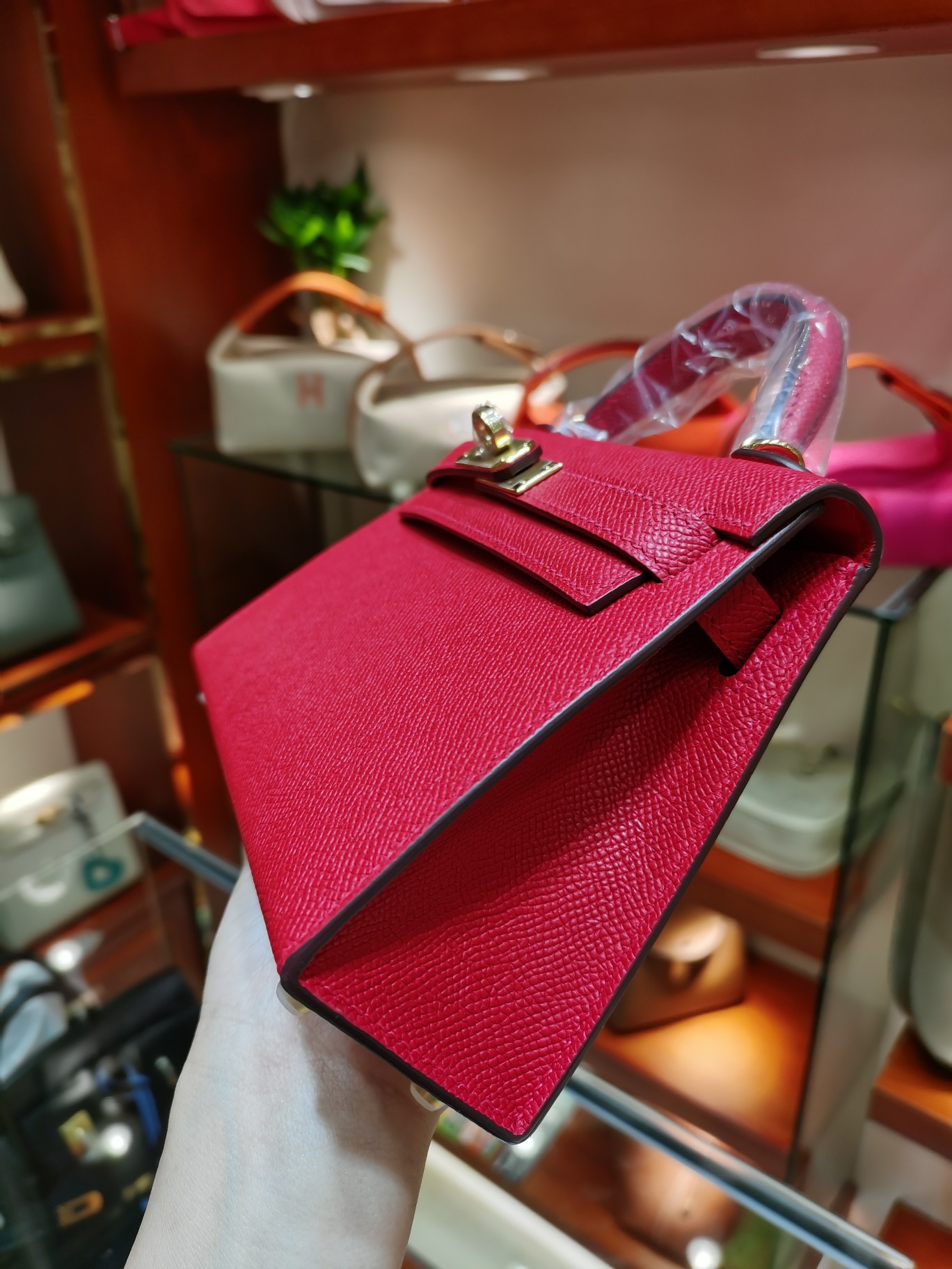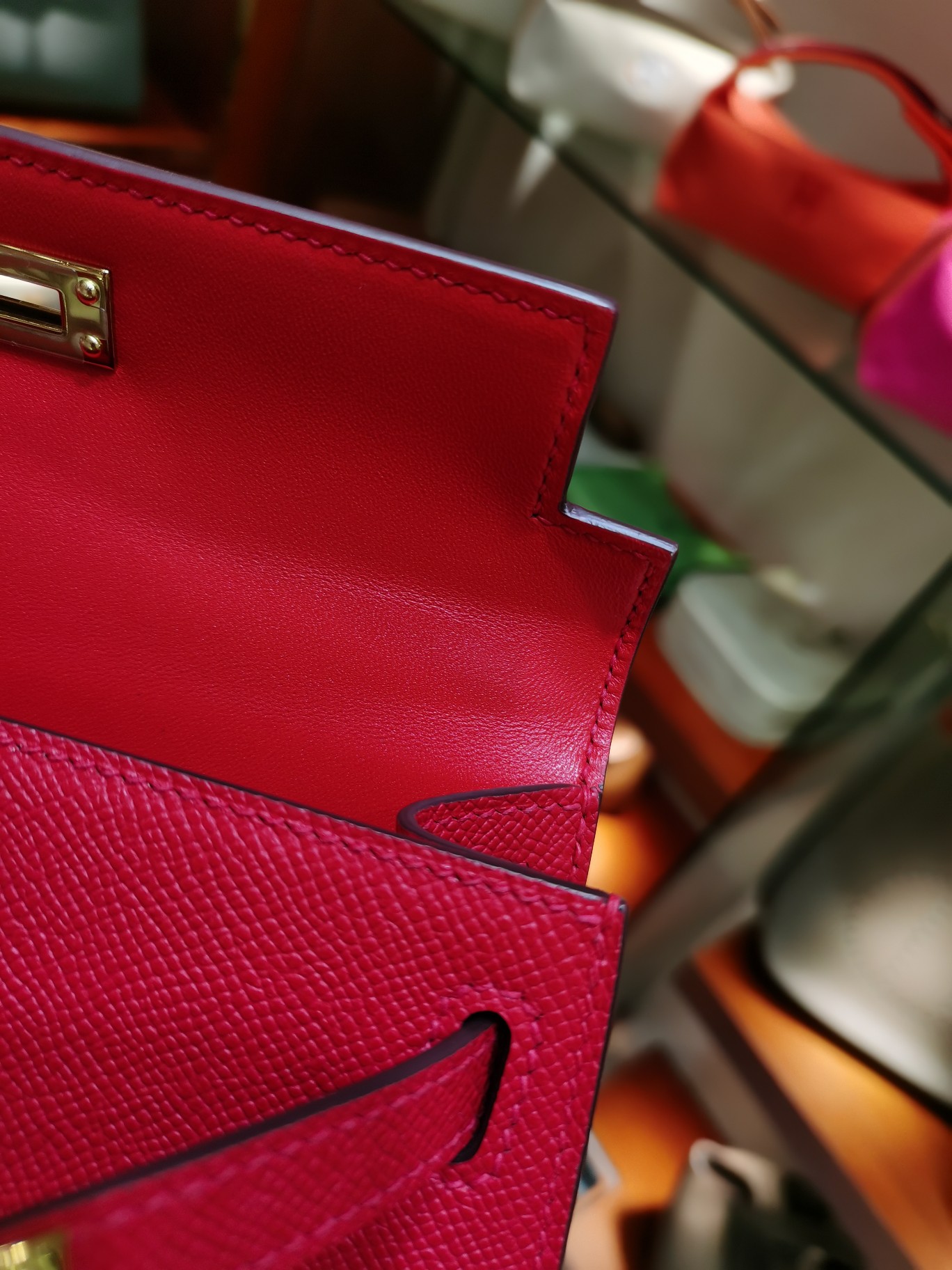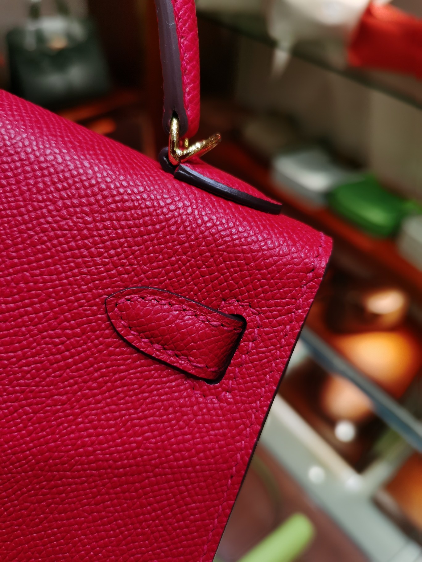 제품 이름: Kelly 사이즈: 19*14*6 가죽 종류: Epsom 색상: Rouge Cœur