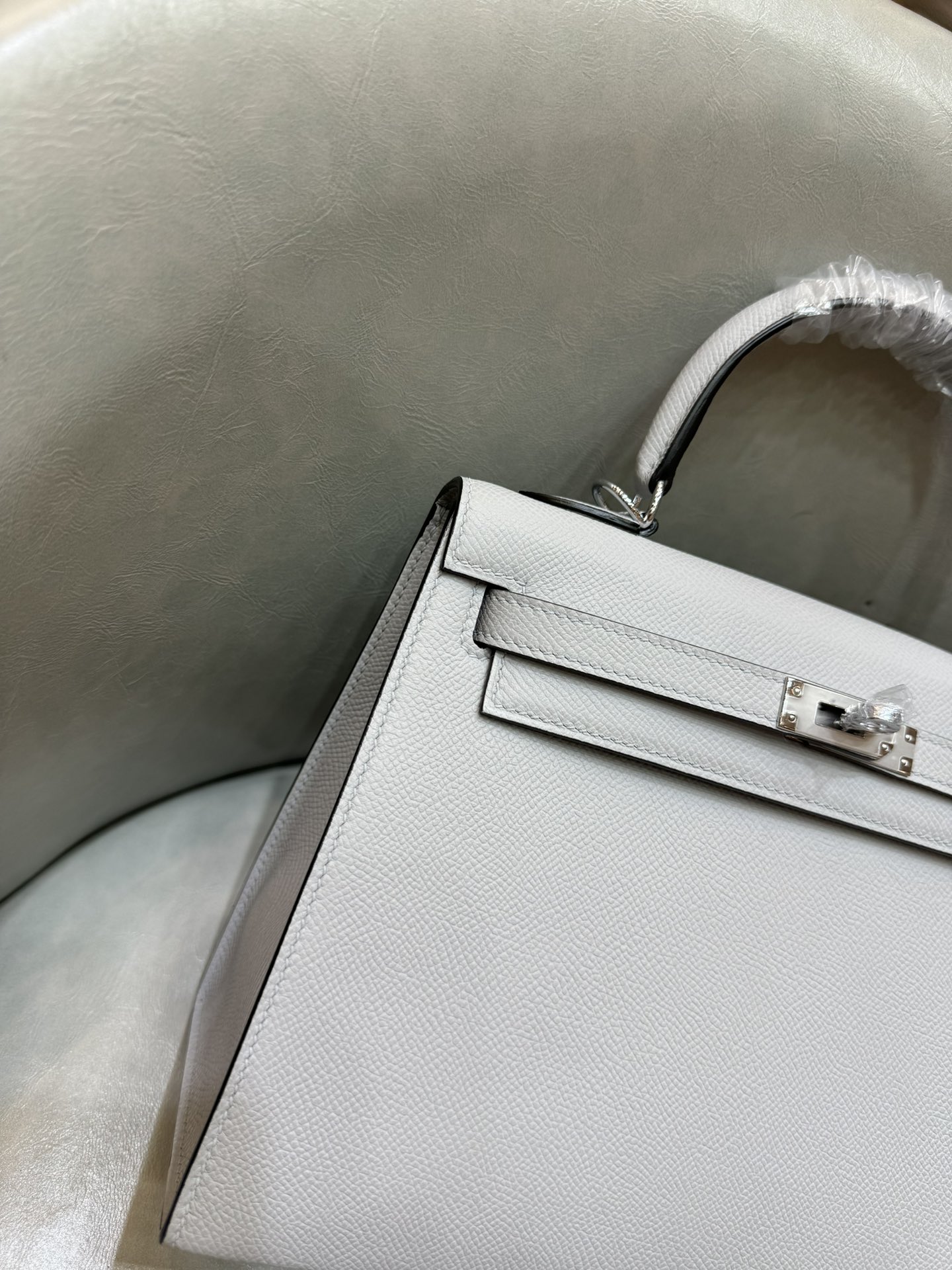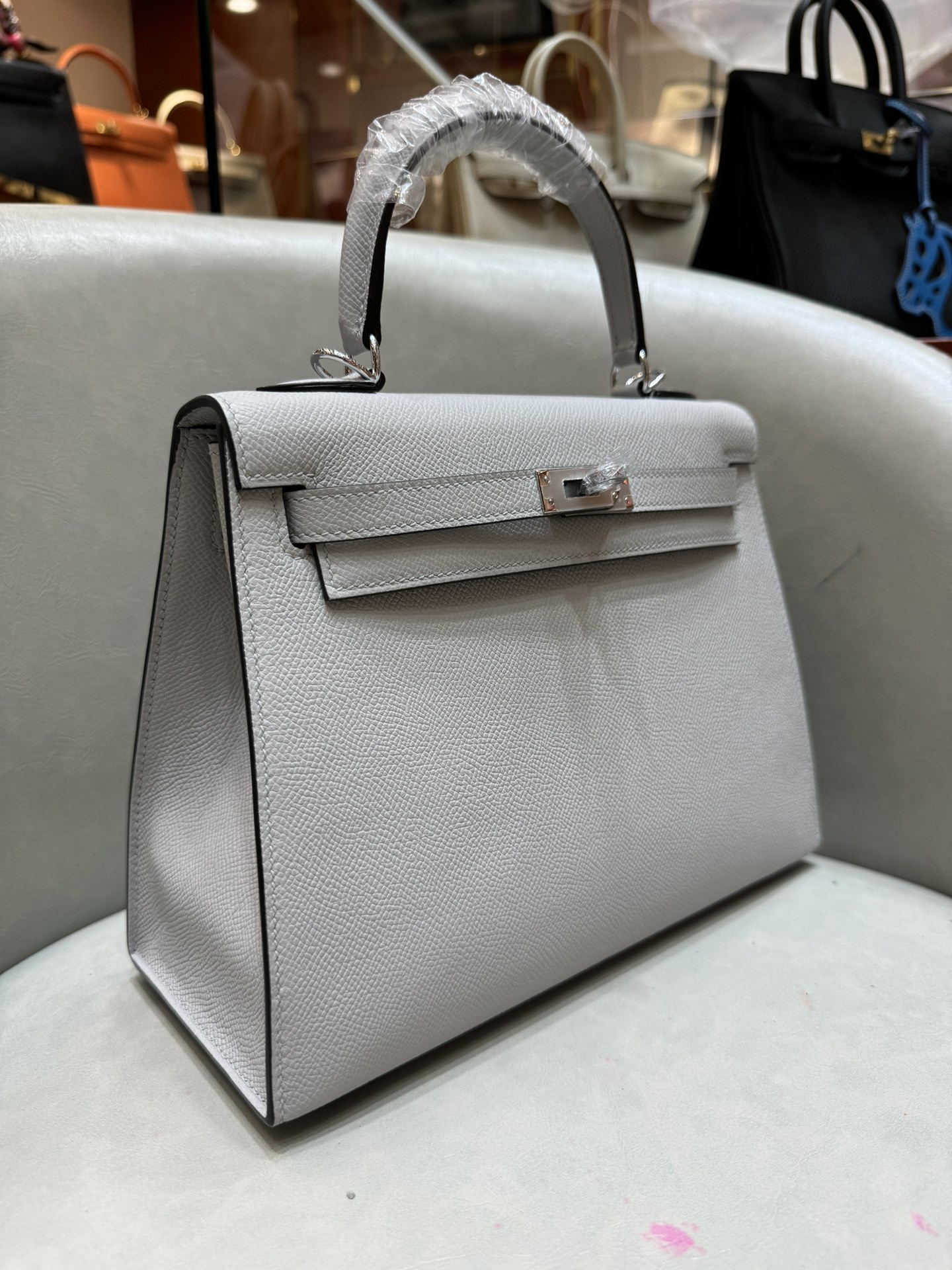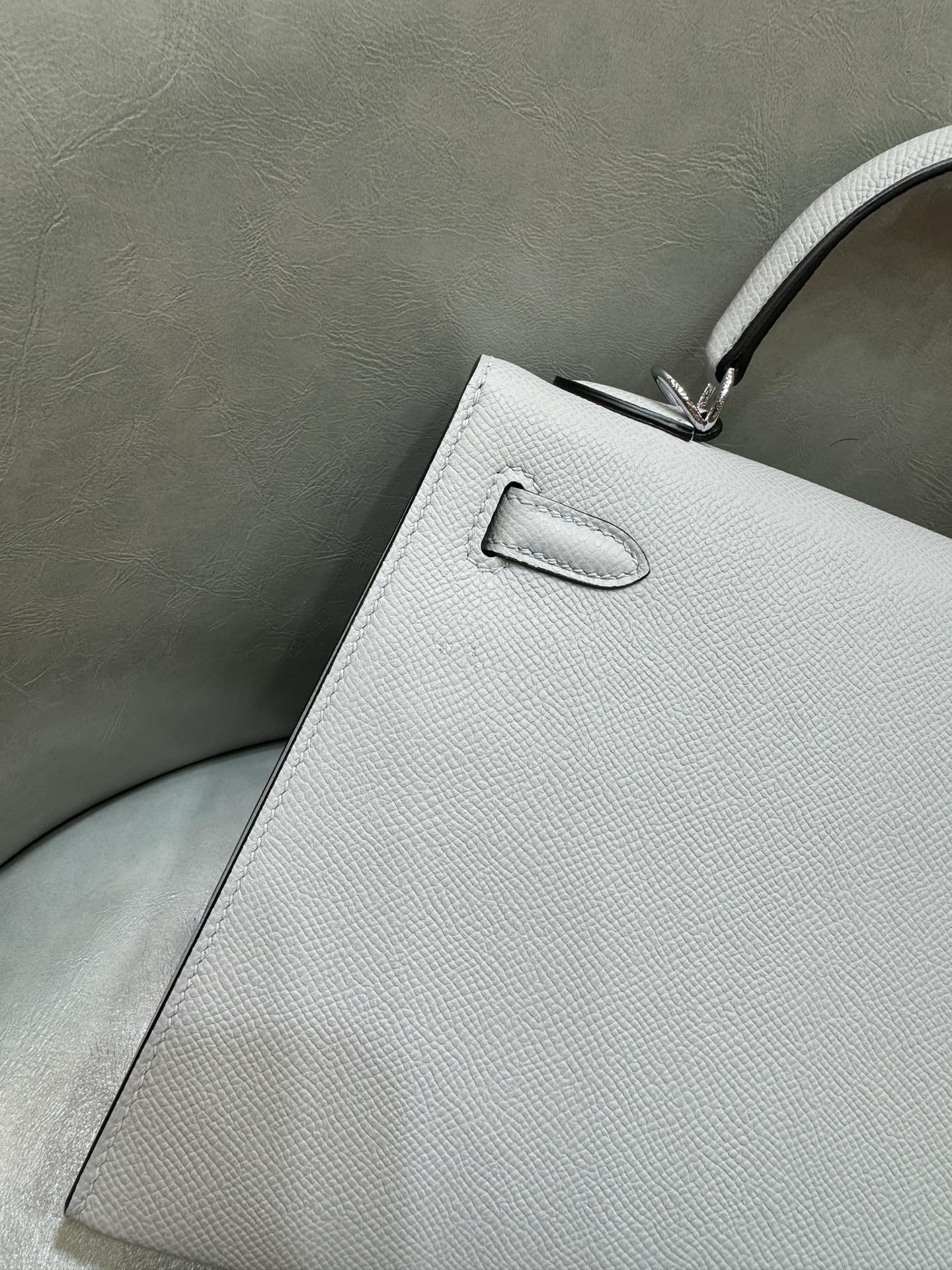 제품 이름: Kelly 사이즈: 25*18*10 가죽 종류: Epsom 색상: Gris Mouette