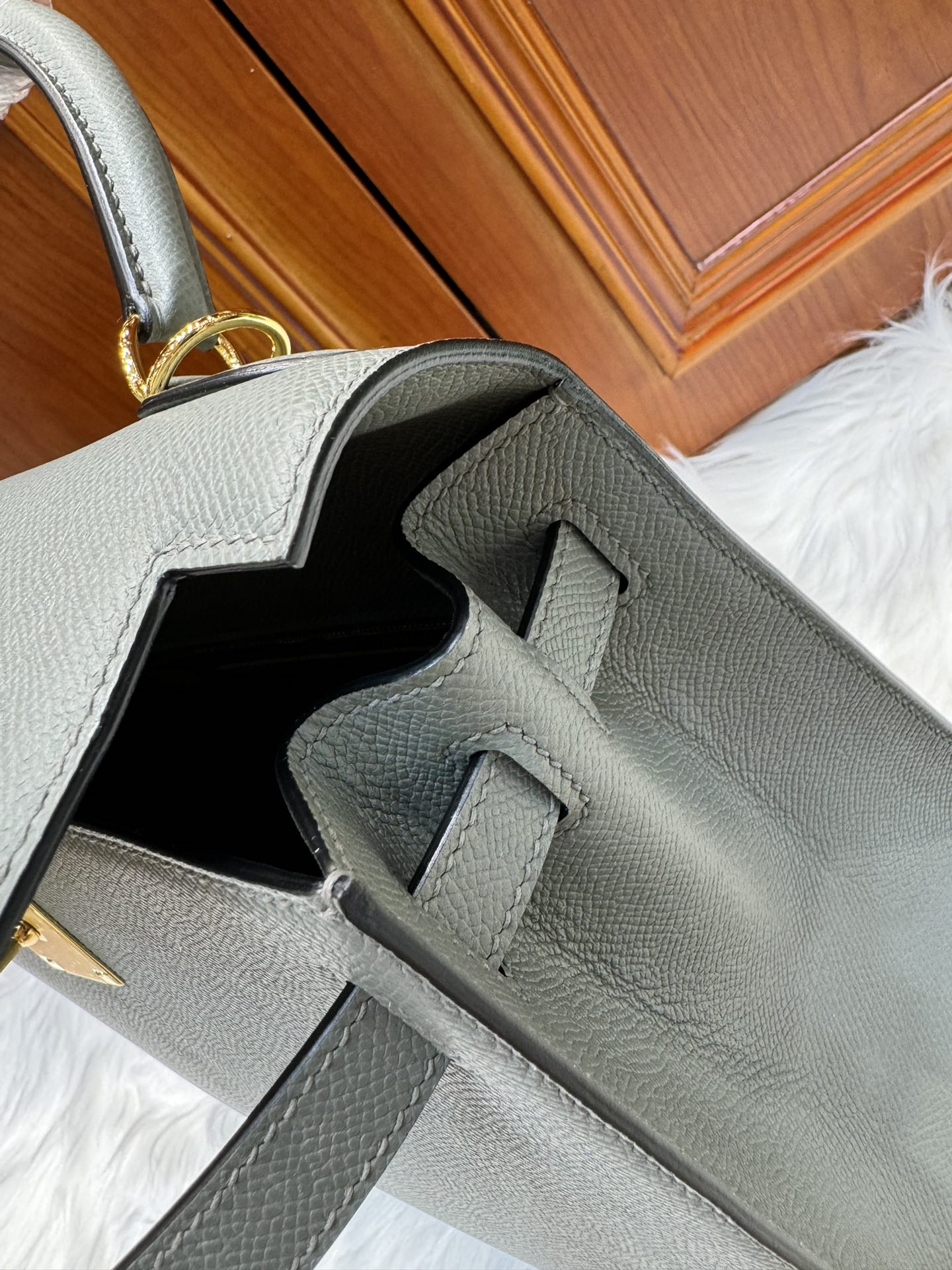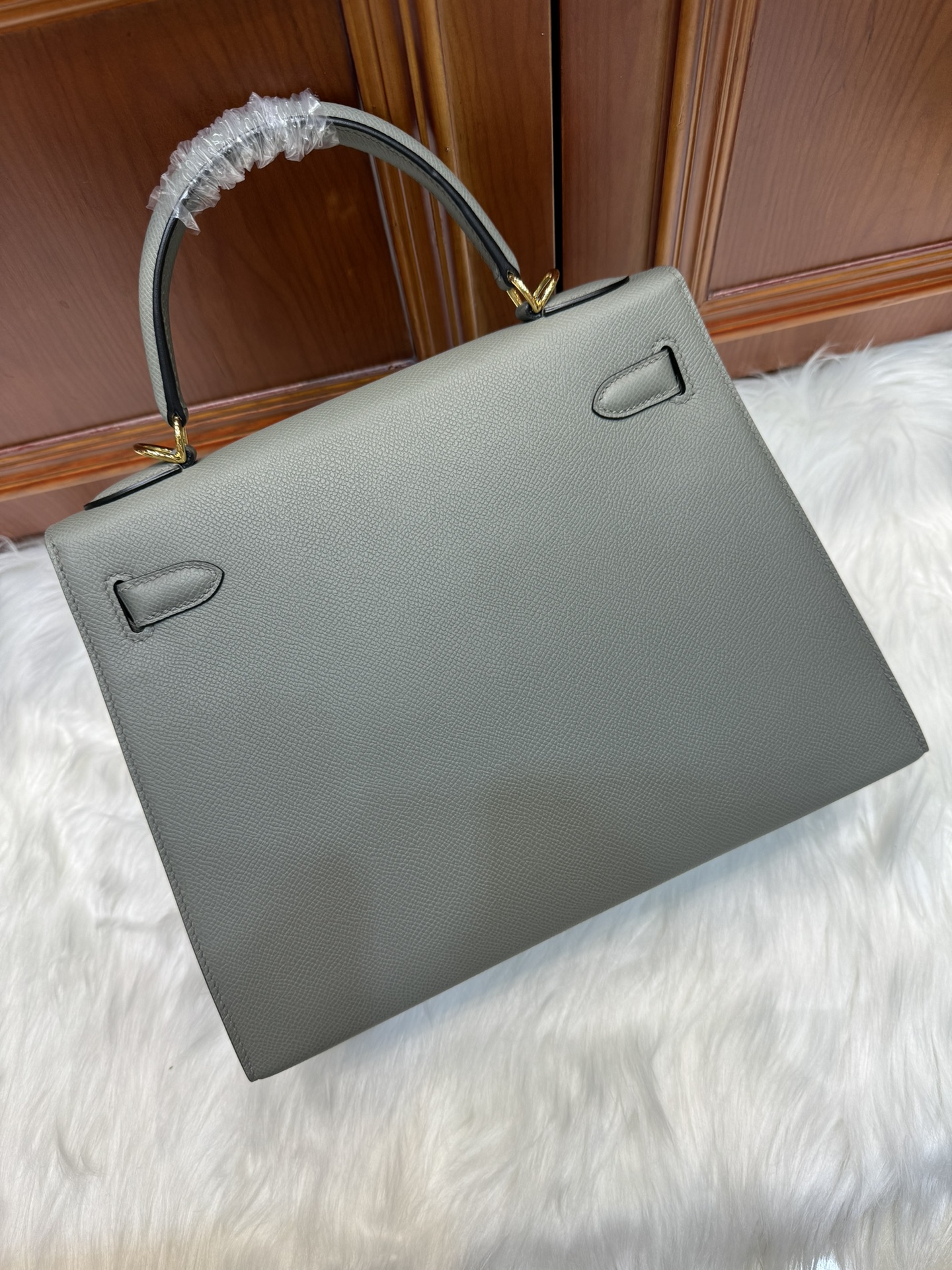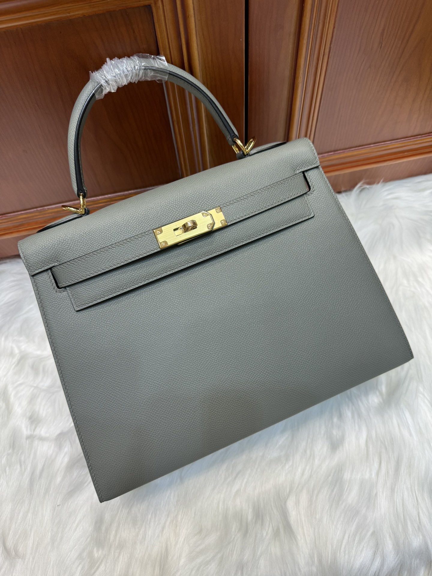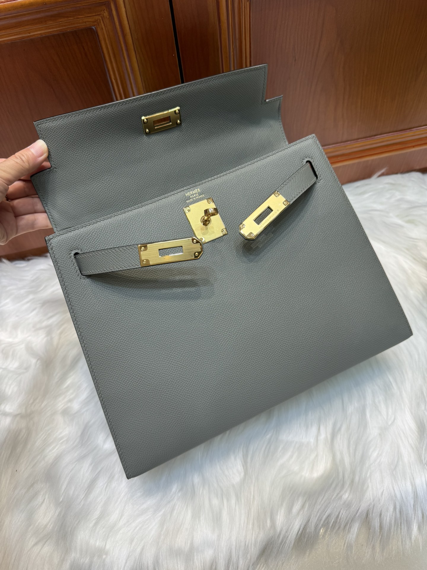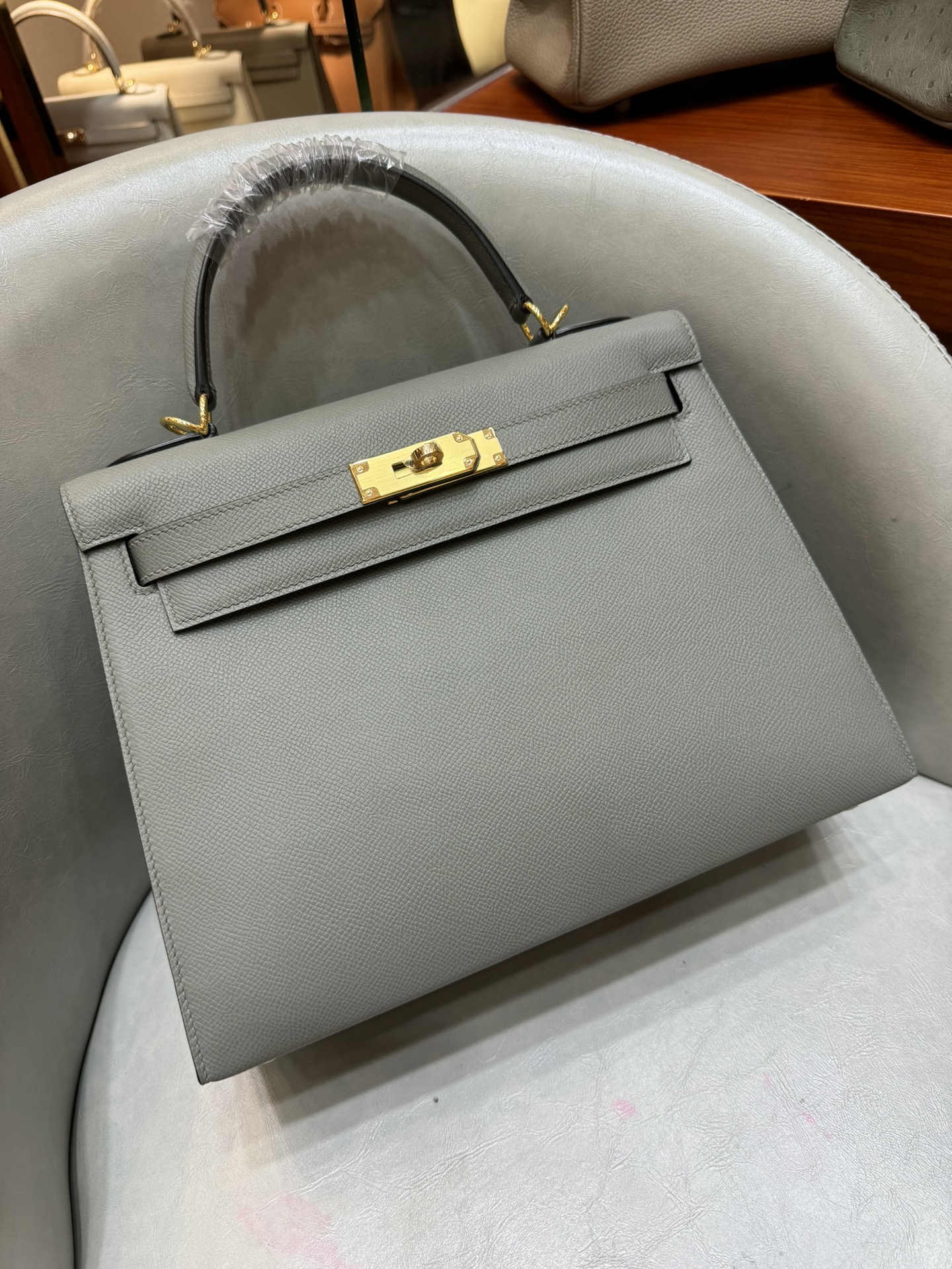 제품 이름: Kelly 사이즈: 28*16*4 가죽 종류: Epsom 색상: Gris Orage