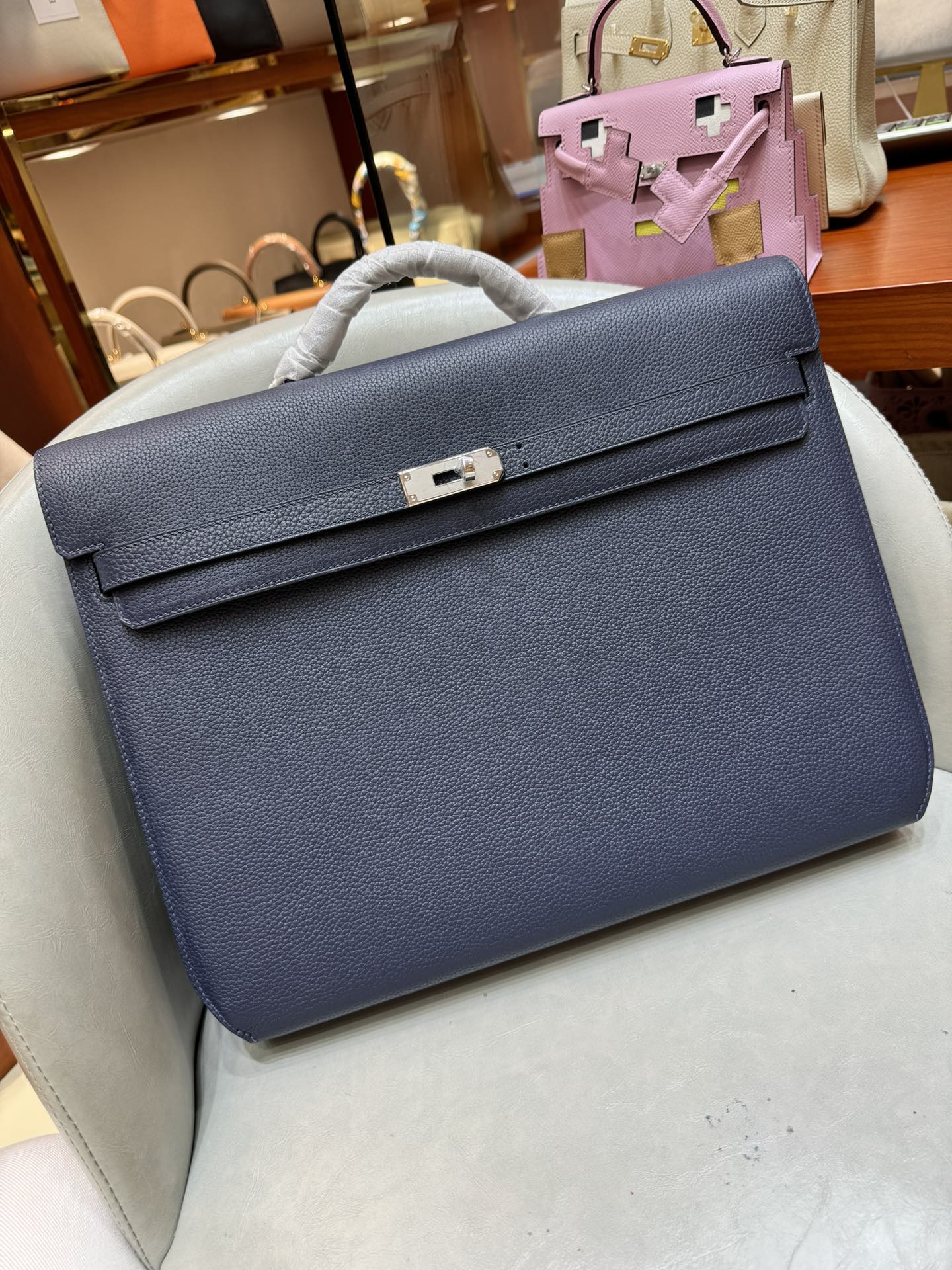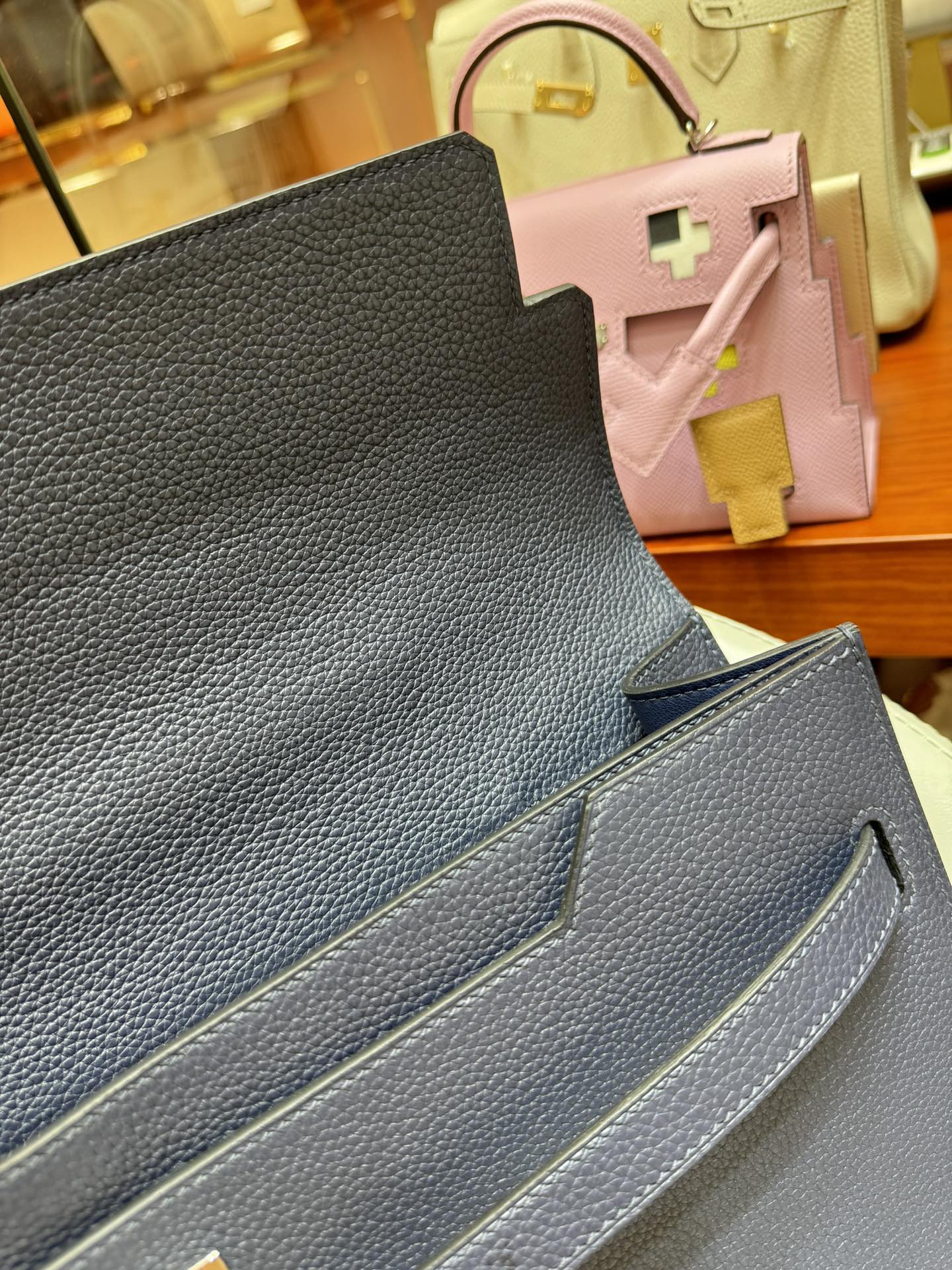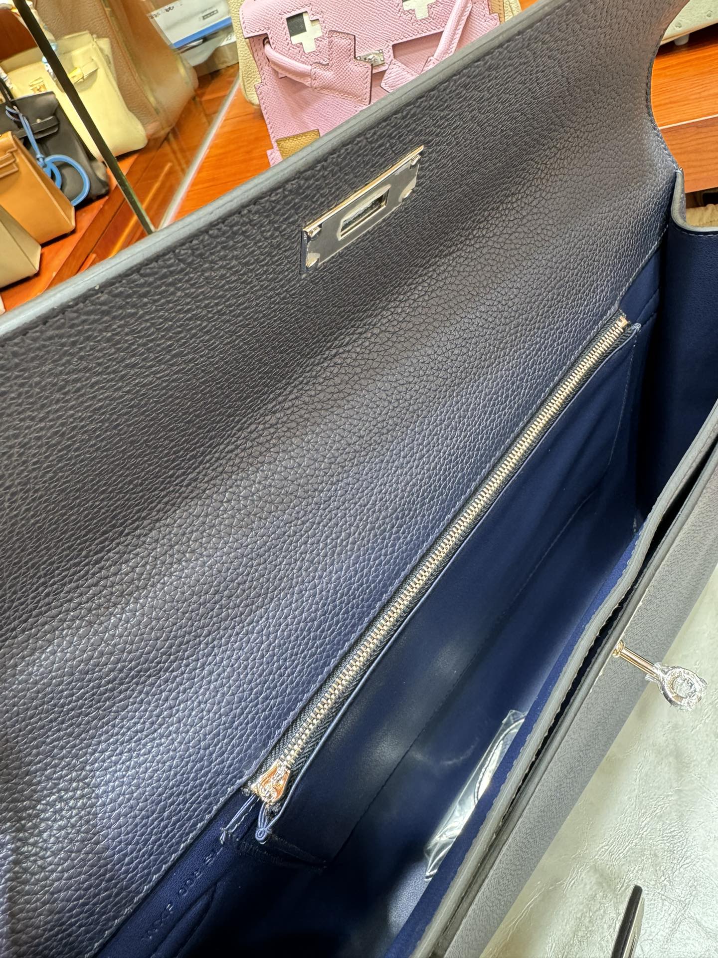 제품 이름: Kelly Depeches 사이즈: 36*29*5 가죽 종류: Epsom 색상: Bleu Saphir