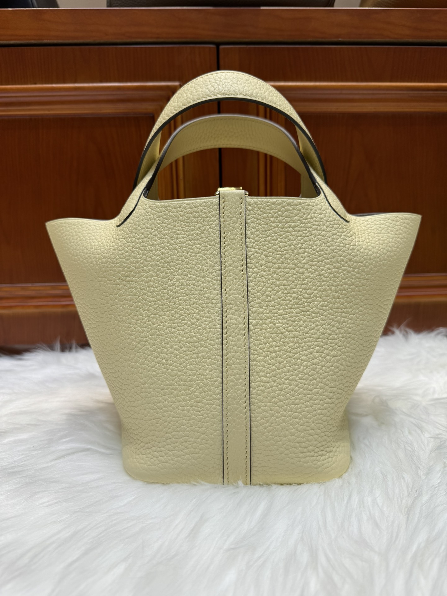 제품 이름: Picotin Lock 사이즈: 18*19*13 가죽 종류: Clemence 색상: Jaune Poussin