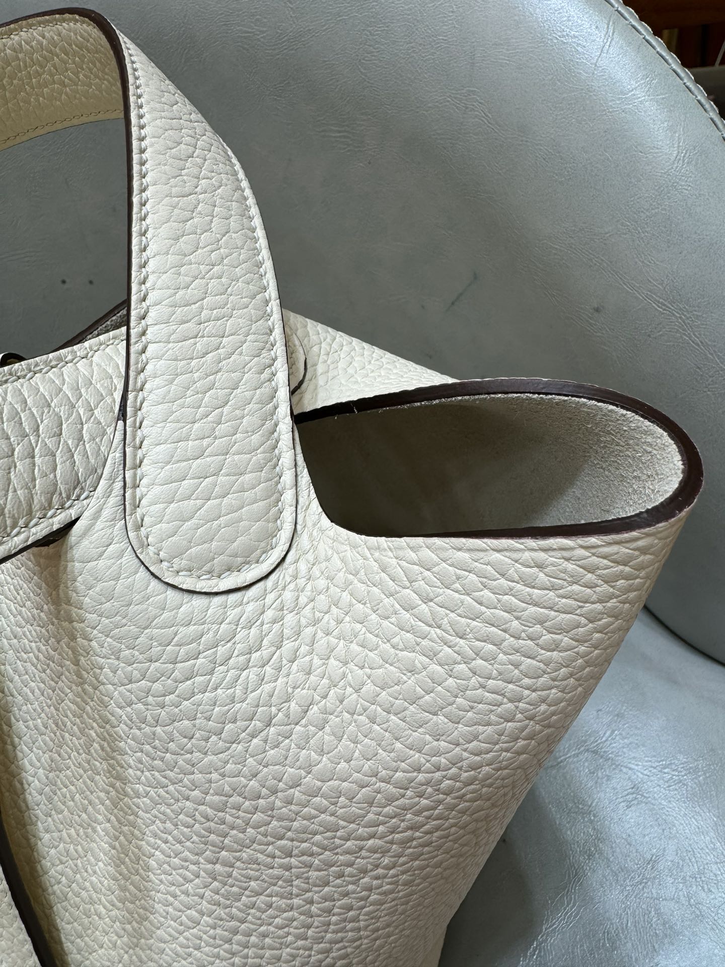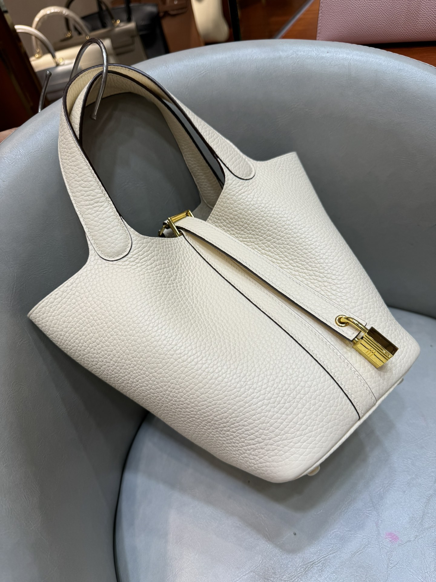제품 이름: Picotin Lock 사이즈: 18*19*13 가죽 종류: Clemence 색상: Nata